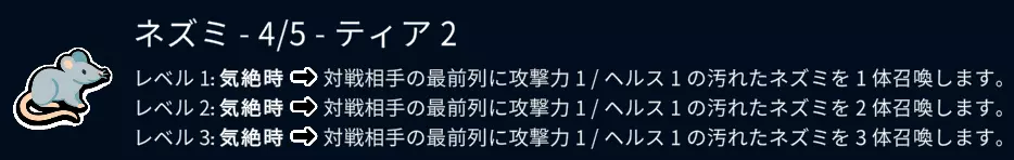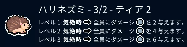 在商店中出现的概率为万分之一。 这个标准卡包中,它超爱吃巧克力。 它没有特殊能力,但它信任你。 请你也相信它。 【等级2】回合3、回合4 从这里开始,说明会变得有些复杂。 在回合3、回合4,为了能在回合5、回合6通过升级奖励发现等级4的宠物,要准备制作多只等级2、等级3的宠物。 除非到这里已经遭遇2连败、3连败,或者能够制作出等级2的水獭,否则暂时不要升级宠物。首先,在当前阶段如果处于连败状态,建议将队伍中的1阶宠物换成其他2阶宠物,或者让宠物食用带骨肉来提升战斗时的攻击力,也可以通过鱼(升级)或水獭的能力来增加队伍的属性。 ※即使在第5回合前全败,也会剩余6点生命值,所以继续探索1阶宠物是没问题的。・想要的宠物(Tier 2) 天鹅(最好能让它吃带骨肉) 孔雀 火烈鸟 带骨肉(食物) 大象 蜘蛛 渡渡鸟 ・不买的(Tier 2) 虾 安眠药(食物) 刺猬 螃蟹 老鼠 那么,准备制作多只2级、3级宠物的方法是什么呢 ①接着刚才的例子,在第3回合时是这样的