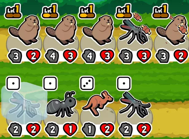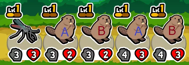 此时拥有10金币。 商店中已经冻结了一只蚊子,所以即便刷新,也只有两个空位,用蚊子填满这些空位似乎很困难。 因此花费6金币,让商店里的带骨肉给海狸和蚊子食用。 将食用带骨肉后攻击力提升的海狸和蚊子放到前排。 然后用剩余的4金币刷新寻找蚊子,结束回合。 (如果刷新一次后商店里有苹果,就会让属性最高的海狸食用)