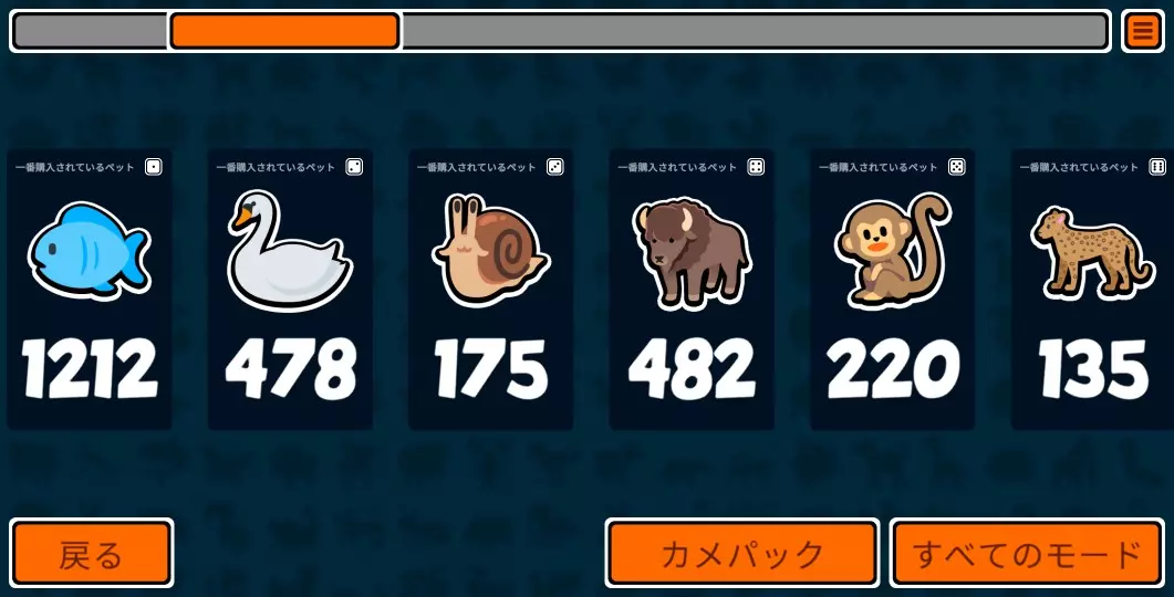 可以将4阶河马或3阶河豚、骆驼、孔雀放在前排,故意给对手投喂1/1的食物,但不推荐这种打法。 【3阶】第5回合、第6回合 这里从第5回合到第8回合为中期。 是升级的时机。 如果能用这次升级奖励买到4阶的强力宠物,就能离10胜更近一步。 另外,给4阶的乌龟喂食安眠药,就能将强力的6阶甜瓜增益效果施加给任意宠物(记得调整乌龟的位置)。升级奖励中想要的宠物(4阶) 野牛(如果有3级宠物的话) 企鹅 鹿 河马 乌龟 在第5回合将宠物升到3级,若能通过升级奖励购买到野牛,会非常强力。 第二只野牛、企鹅不要叠加,并排放置两只效果更强。
