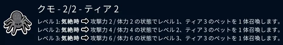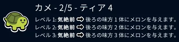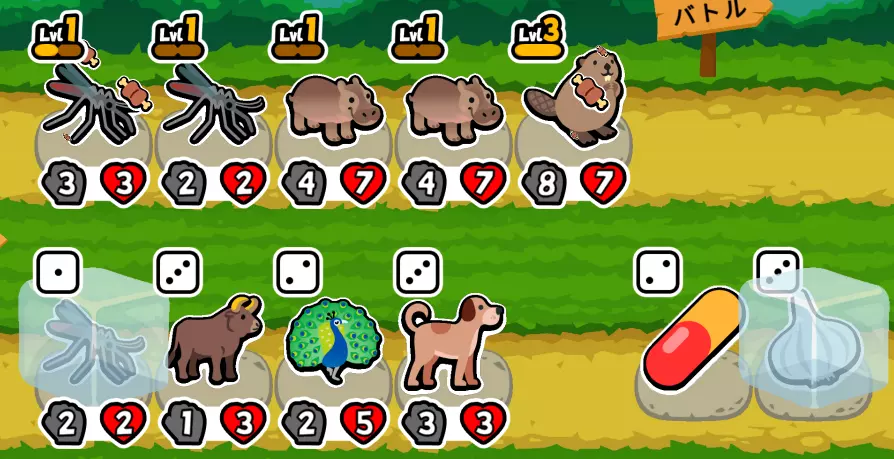 【2阶】解说 如果在第1回合、第2回合没能收集到多个相同的宠物,收集2阶宠物或许也是个不错的选择。 即使现在不打算购买,看到带骨肉时也请先冻结它。 如果金币有富余,就在第4回合让攻击力低的宠物吃掉它吧。 (虽然麻烦,但因为想找大蒜,所以要在第4回合结束前解除冻结) 另外,如果在第3回合、第4回合忍不住升级,能够购买3阶的狗、河豚、骆驼的话,宠物购买的优先级就会有所不同。
