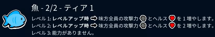 如果可以的话,在第4回合前购买10条鱼(一条一条叠加到1级半),在商店里冻结3条鱼,这样会非常稳定。鱼的能力虽然只在升级时触发,但能提供1/1或2/2的属性值,这一点非常强。