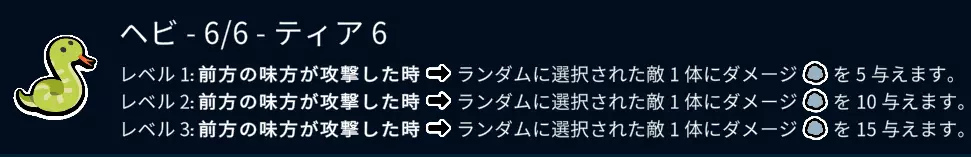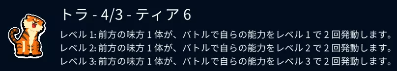 它能使位于队尾的6阶苍蝇、火鸡,以及毫无防备的猴子、企鹅失去战斗力。 等级2和等级3时,若目标被击倒,会继续对前一个宠物造成伤害。 搭配6阶老虎和鹦鹉,能让对方的阵型变得一团糟。