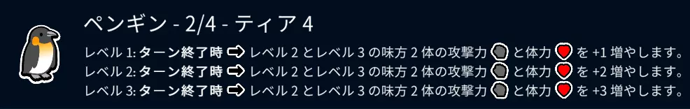 企鹅是一种万能宠物,能让前期升级战术中使用的低阶宠物在中期也能继续战斗,甚至还能培养后续获得的高阶宠物。 其瓶颈在于企鹅自身和1级宠物无法获得增益,且最多只能为2只宠物提供增益。企鹅自身属性为2/4,因此在游戏后期吃到6阶的牛排之前,在战斗中派不上用场。 此外,与其无法升级而只叠加一只形成1级半,不如一只只排列开来,实际分配2/2的增益效果会更强。