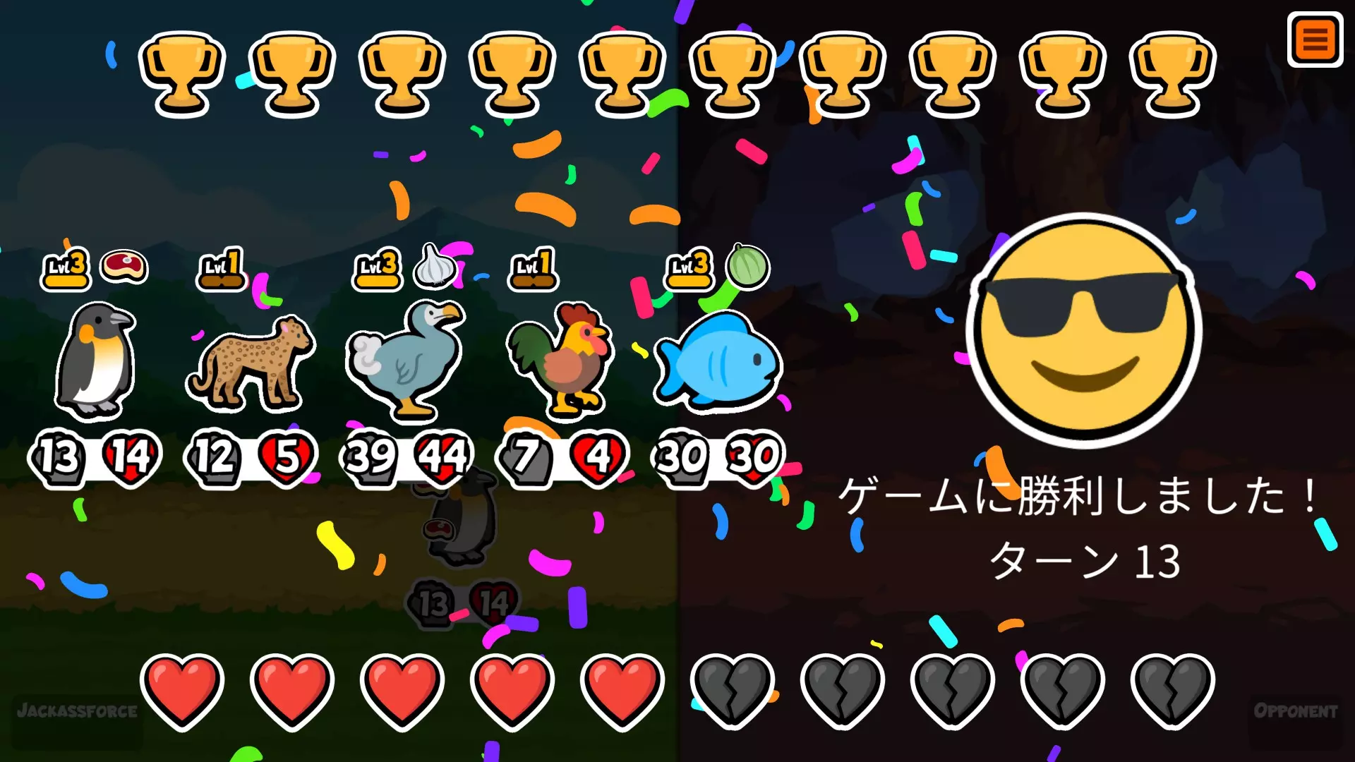 【13回合】渡渡鸟 回合3时场上鱼非常多,所以决定用鱼来强化渡渡鸟。 回合5升级奖励让我能买2只企鹅,于是目标定为渡渡鸟加雌鸟的组合。 雌鸟一直没在商店刷出来,但还是靠渡渡鸟造出了攻击力50的宠物,强行碾压获胜。