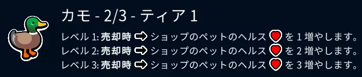 以1攻1血的基础属性,售价2金币,实际成本相当于1金币,在游戏初期拿不定主意时购买它是个稳妥的选择。与其将它升到1级半这种不上不下的状态,不如考虑清楚是保持1级以出售为前提来使用,还是朝着2级、3级去培养。和海狸、水獭类似,这种在购买或出售时能带来收益的宠物,与龙、狗、虾的搭配效果很好。