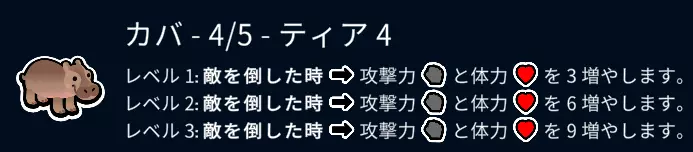 对手队伍的河马看起来很强,但实际使用起来是相当难用的宠物。 首先,河马的技能需要击败对方宠物才能发动。 河马自身的攻击力只有4,所以作为主力使用时,需要让它吃同等级的梨、罐头、带骨肉来提升攻击力。 如果不好好培养,到后期就会战力不足,但对付使用鹿、羊、蟋蟀、马和火鸡的召唤流队伍时能发挥不错的作用。 等级6的野猪有着类似的效果。
