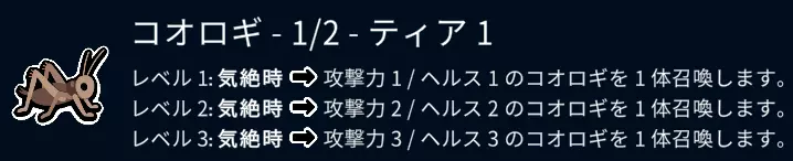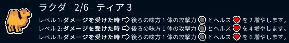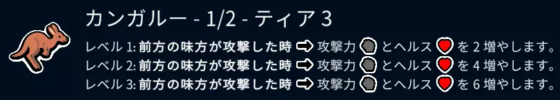 如果在上一场战斗中失败,全体将获得1/1的增益效果。 即使处于冻结状态,若之后赢得战斗,该能力也不会发动。 另外,当自身生命值为3以下时,即使处于冻结状态,该能力也永远无法发动。 下一场战斗要获胜哦。