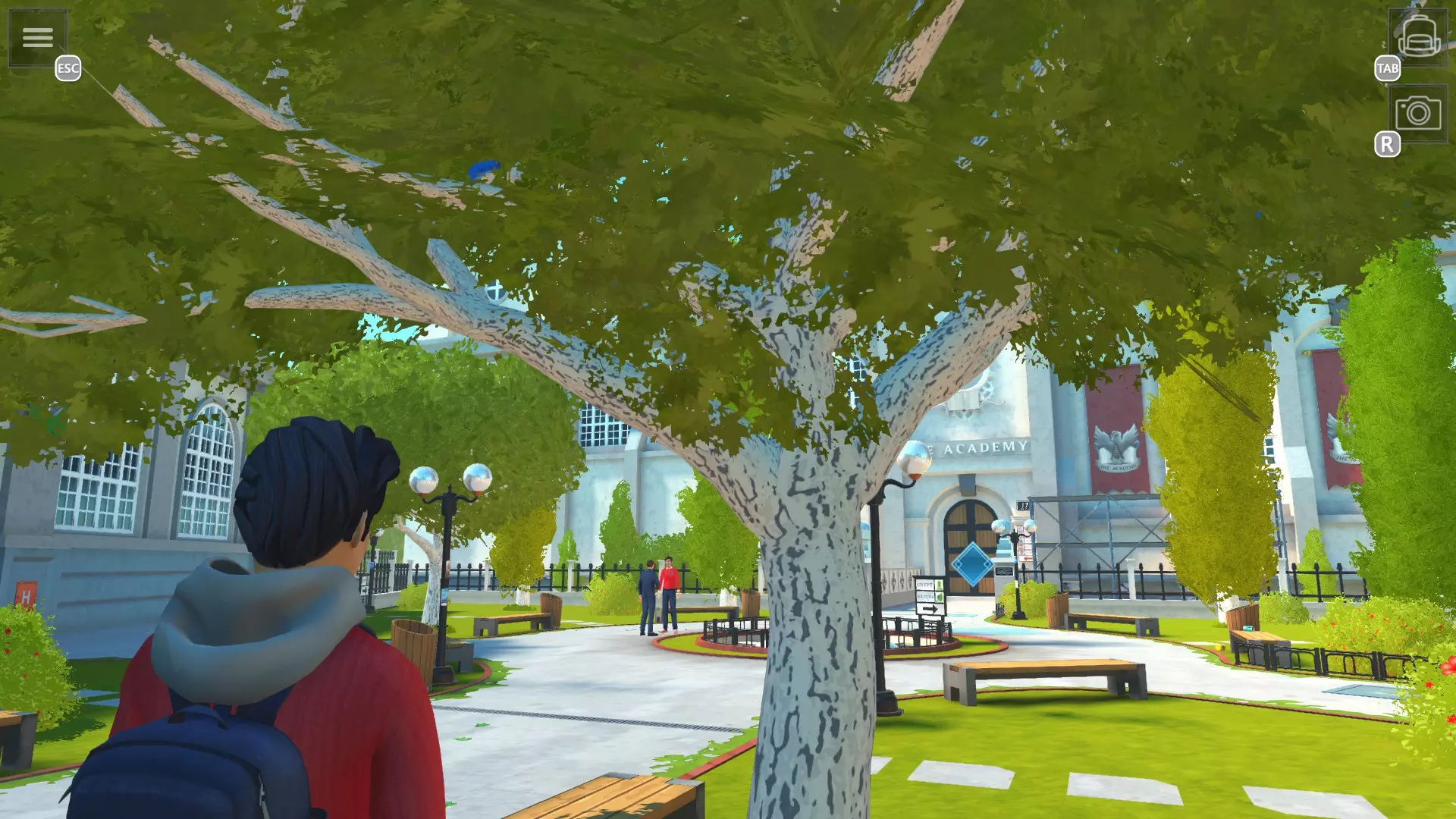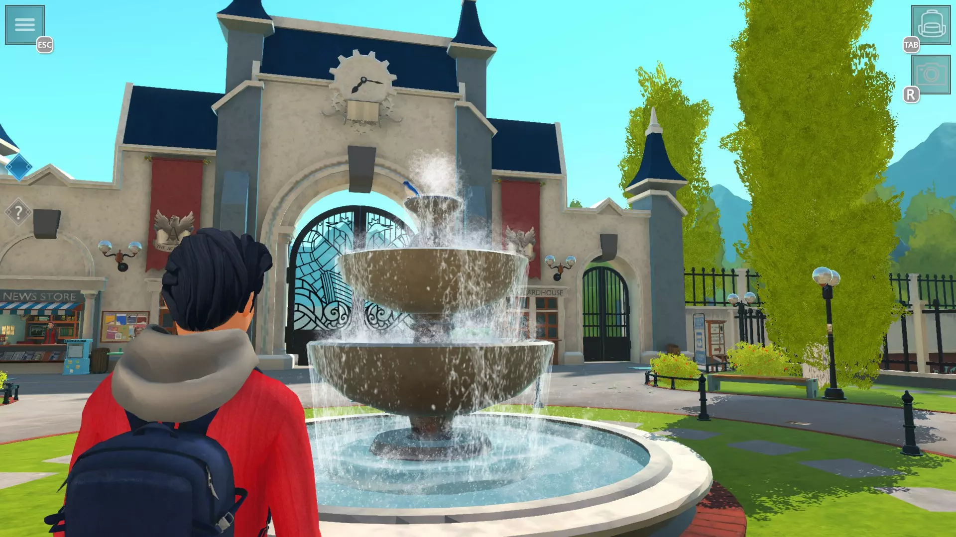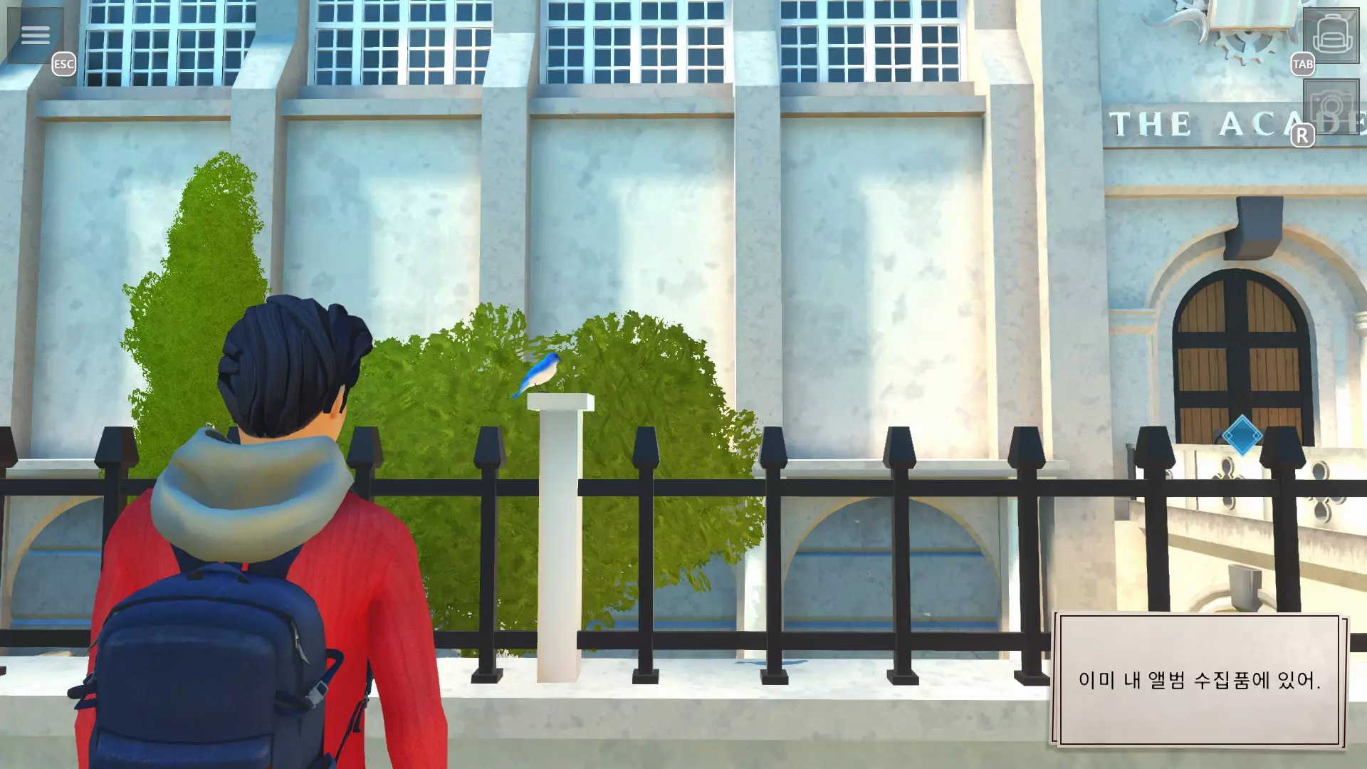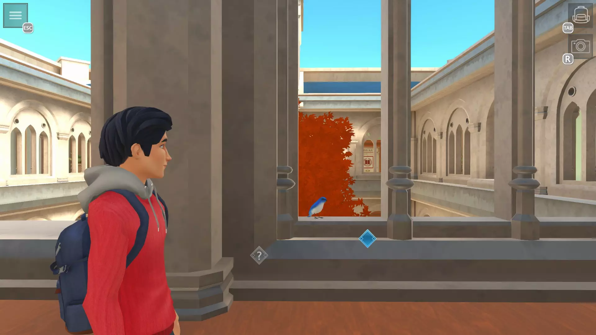 未被束缚的鸟 拍摄所有蓝鸟的照片 提示:最后一天前会有无法看到的鸟,所以最好在最后一天进行 学院前方 1. 喷泉上方