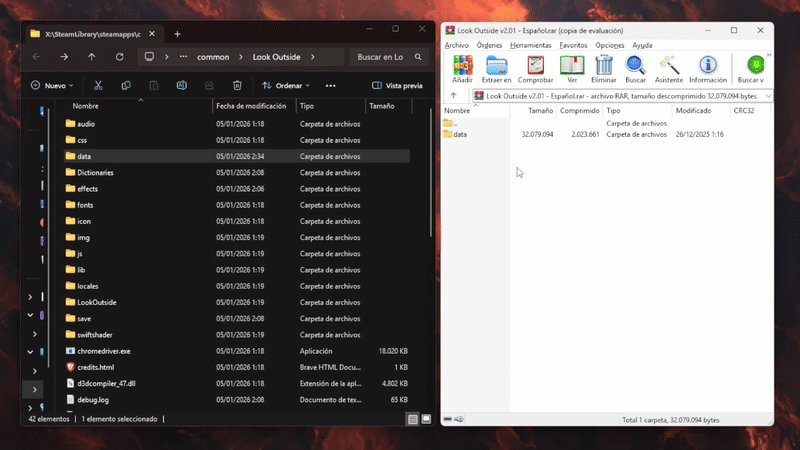 本指南将逐步为你讲解如何简单安全地安装《Look Outside》的西班牙语翻译。 包括清晰的文件下载说明、将所需文件夹正确复制到游戏目录以及验证翻译是否无误应用的步骤。 无需外部程序或高级技术知识。 西班牙语翻译指南 - v2.01 1. 下载翻译文件 2. 打开游戏文件夹 下载文件后: 找到你的游戏安装文件夹,你可以这样做: