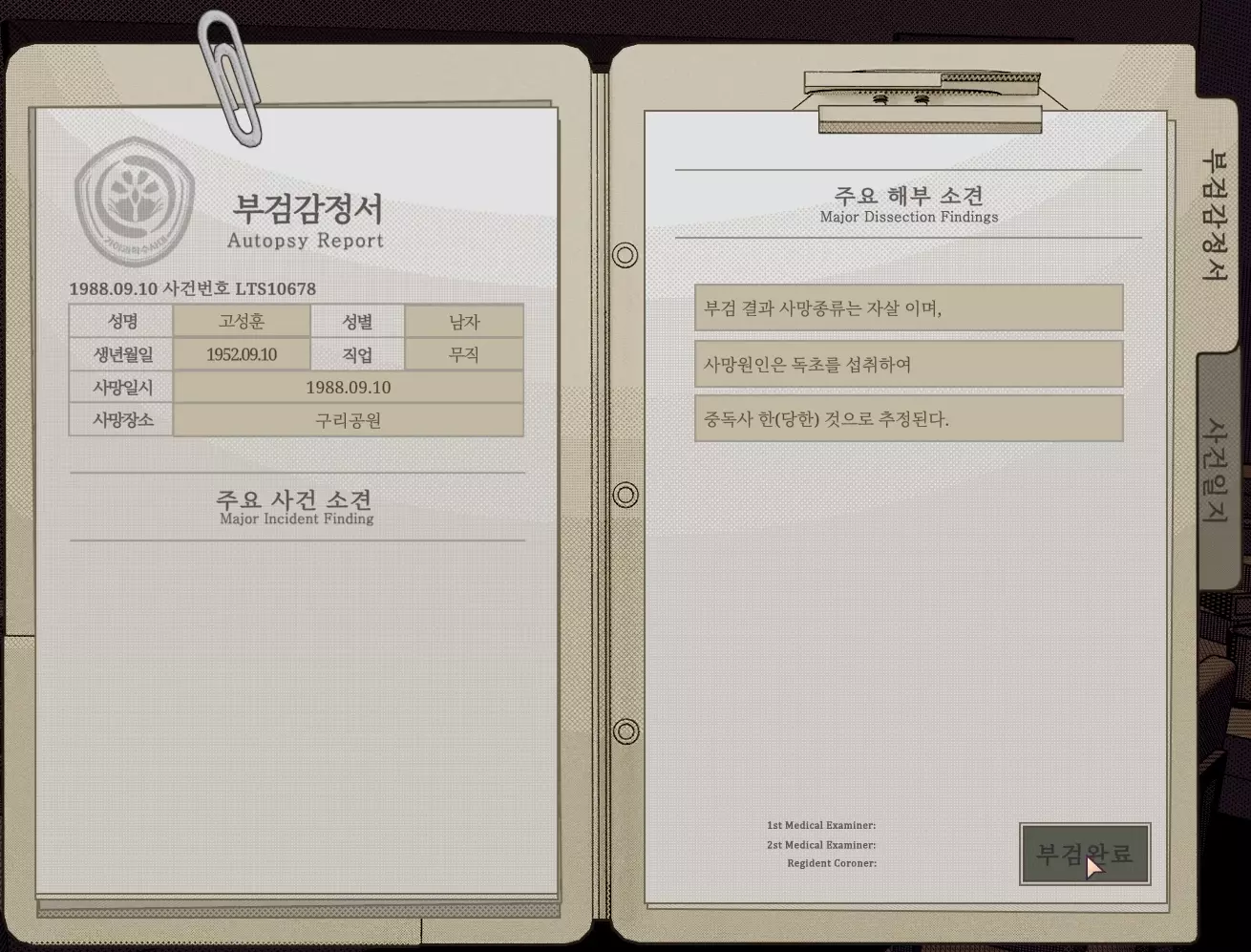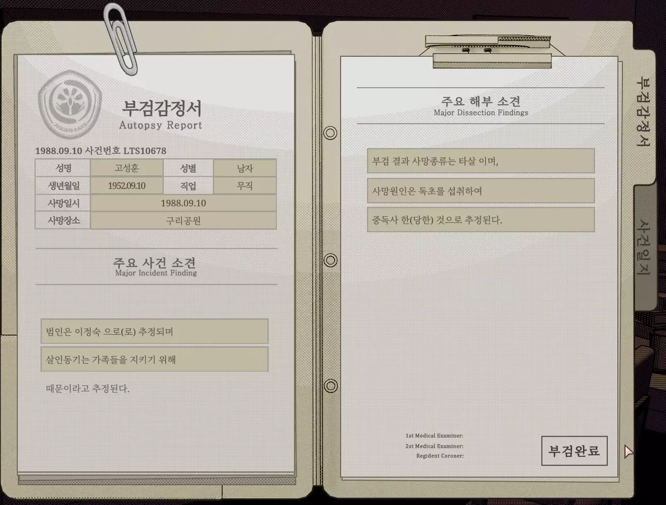 死因不明 - 坏结局。胡乱填写尸检报告即可达成。 寻找真相 - 观看3次坏结局即可达成。
