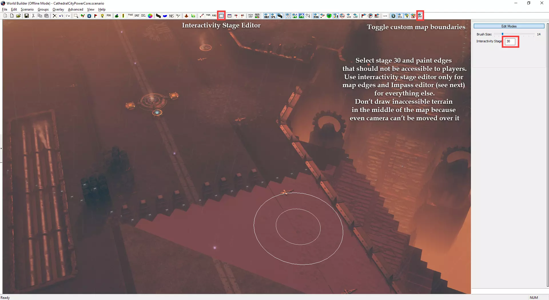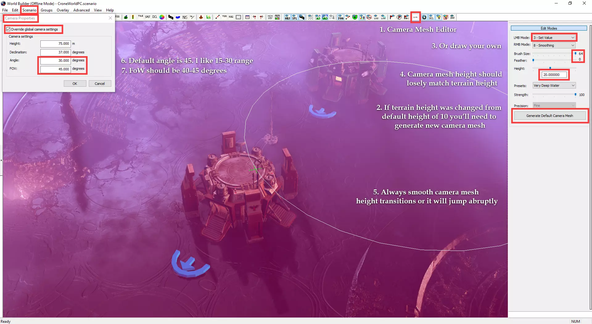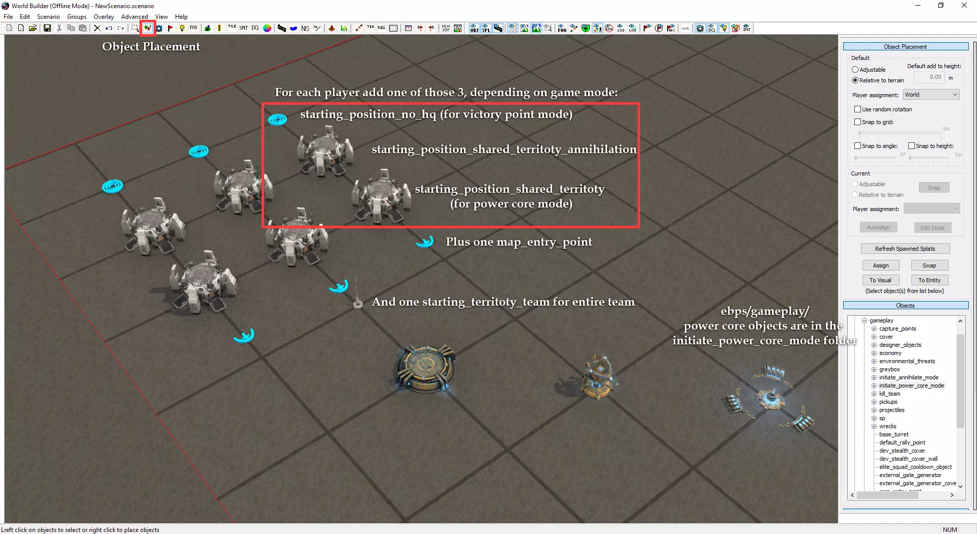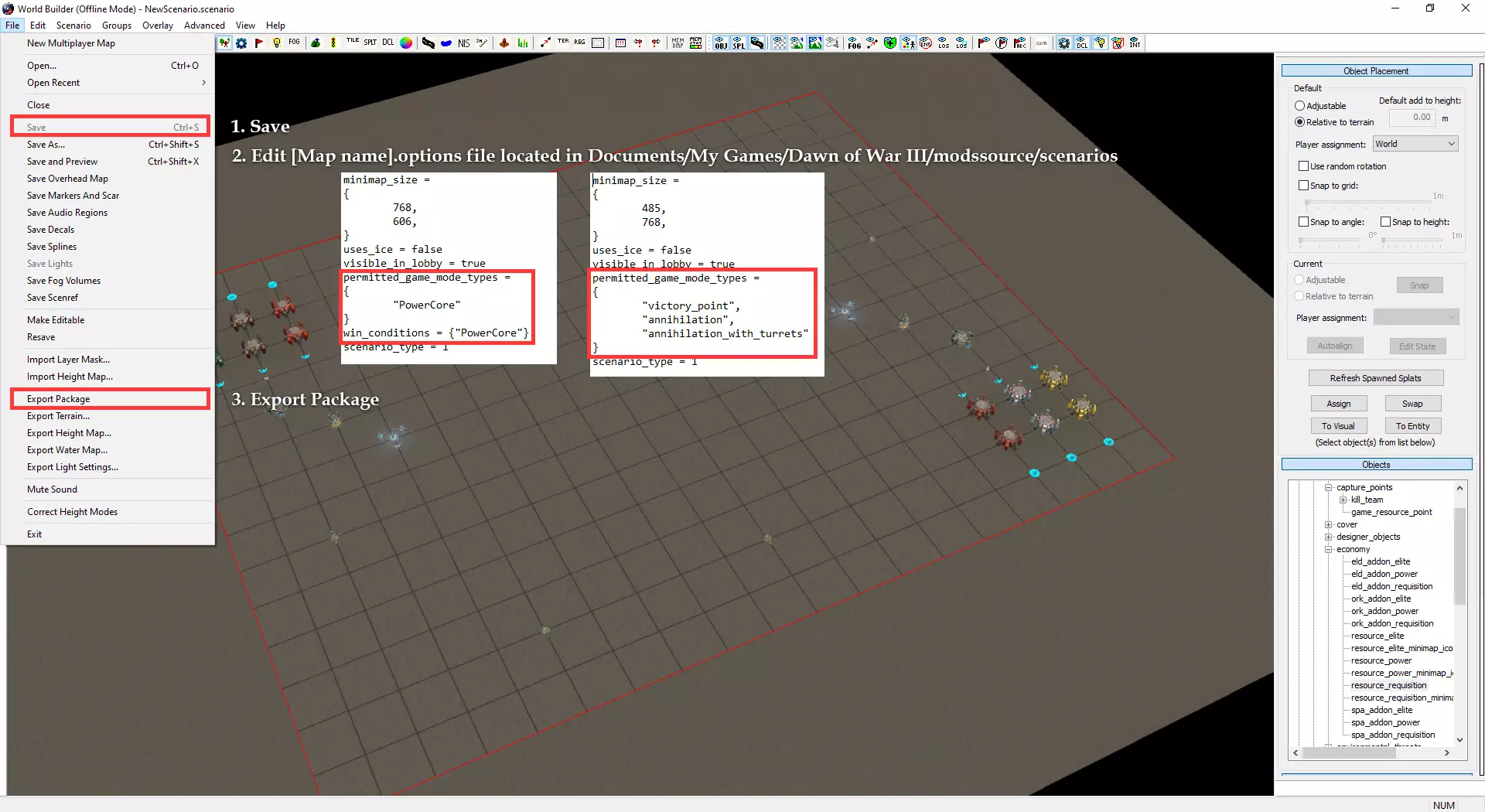 自定义小地图与加载界面 制作自定义小地图需使用Photoshop或其他可处理.tga文件的图像编辑器。 打开位于Documents/My Games/Dawn of War III/modssource/scenarios/路径下的[你的地图名称]_mm_generated文件 圈选出不可通行地形,新建图层并用一种颜色填充选区。用另一种颜色填充背景。 可使用颜色及内发光/外发光等图层样式效果,以匹配Relic的小地图风格。 编辑alpha通道以制作自定义边框。 将文件另存为.tga格式,命名为“[去掉括号的你的地图名称]_mm_handmade”。 制作自定义加载界面需在世界编辑器中为你的地图截取截图。从最佳角度展示地图。保存为多个.TGA文件需根据游戏模式使用以下名称: 核心模式:【你的地图名称(不含括号)】_loading_background_powercore 和 【你的地图名称(不含括号)】_unloading_background_powercore 胜利点模式:【你的地图名称(不含括号)】_loading_background 和 【你的地图名称(不含括号)】_unloading_background 歼灭模式:【你的地图名称(不含括号)】_loading_background_annihilation 和 【你的地图名称(不含括号)】_unloading_background_annihilation 带炮塔的歼灭模式:【你的地图名称(不含括号)】_loading_background_annihilation_with_turrets 和 【你的地图名称(不含括号)】_unloading_background_annihilation_with_turrets 相机设置