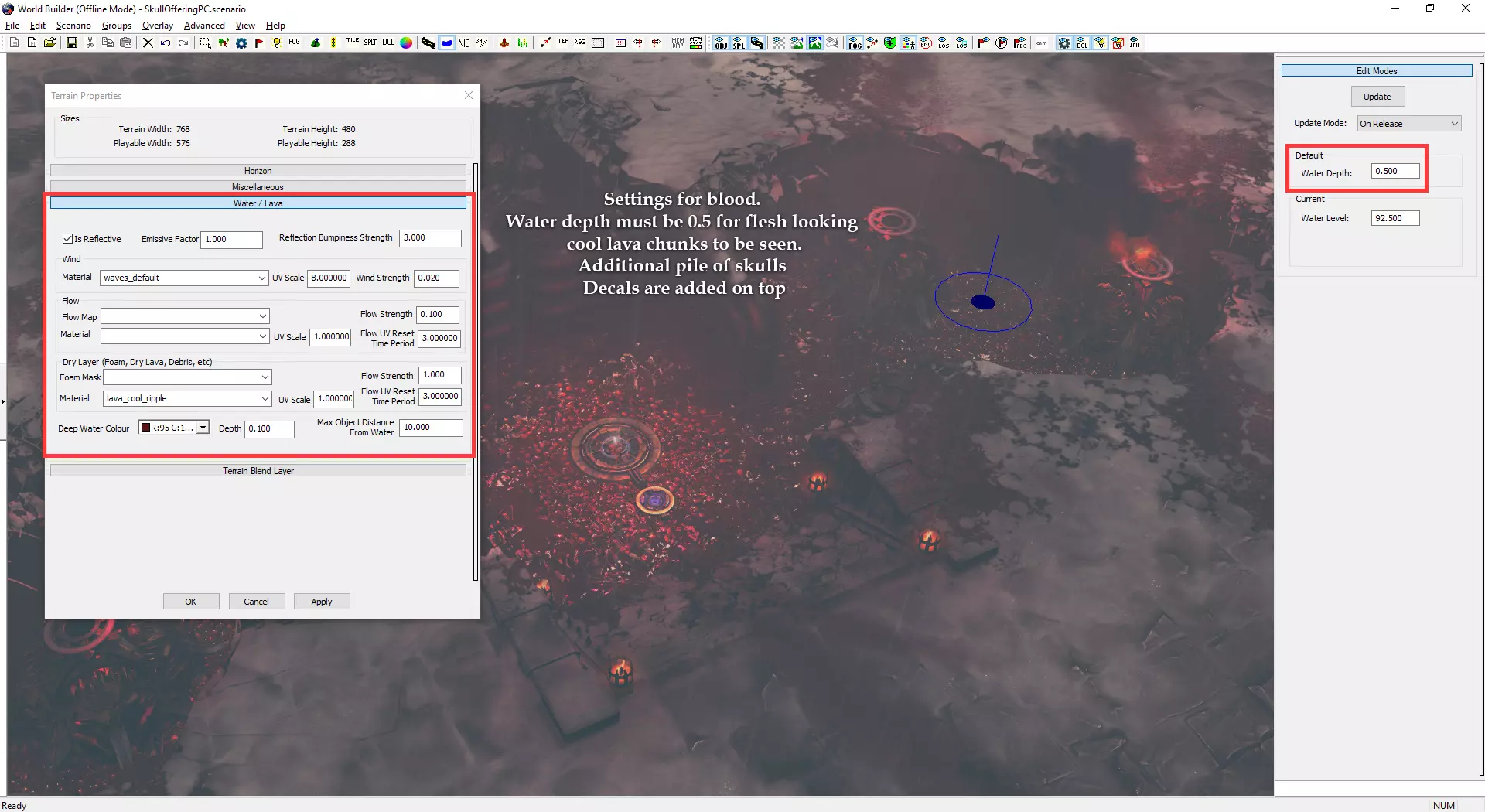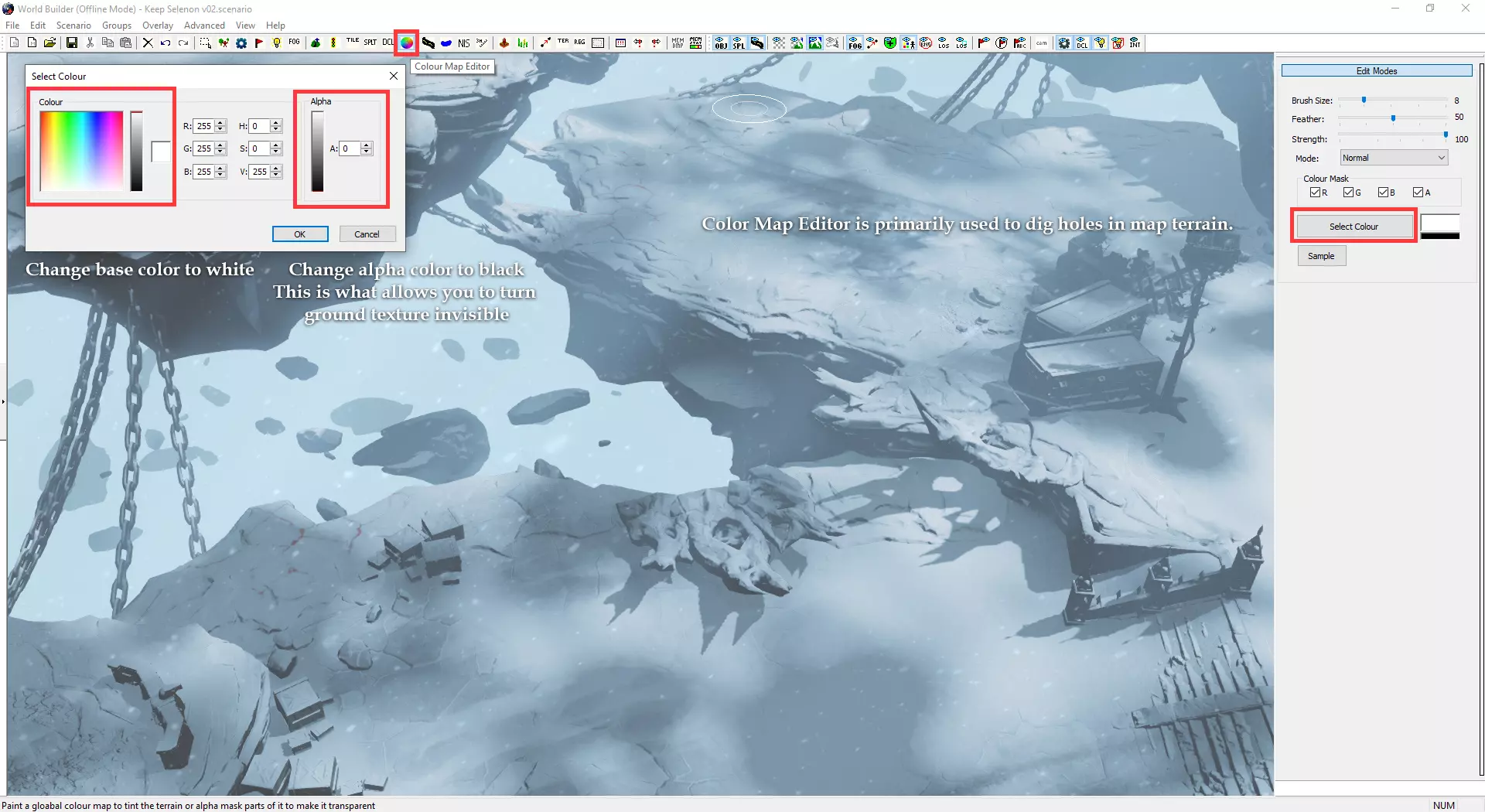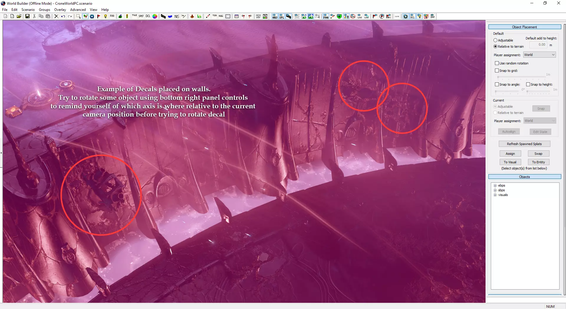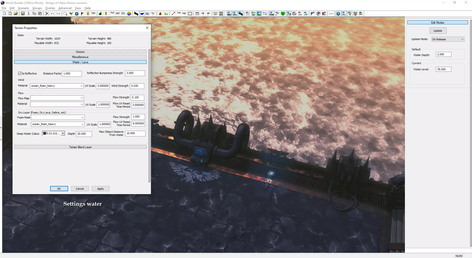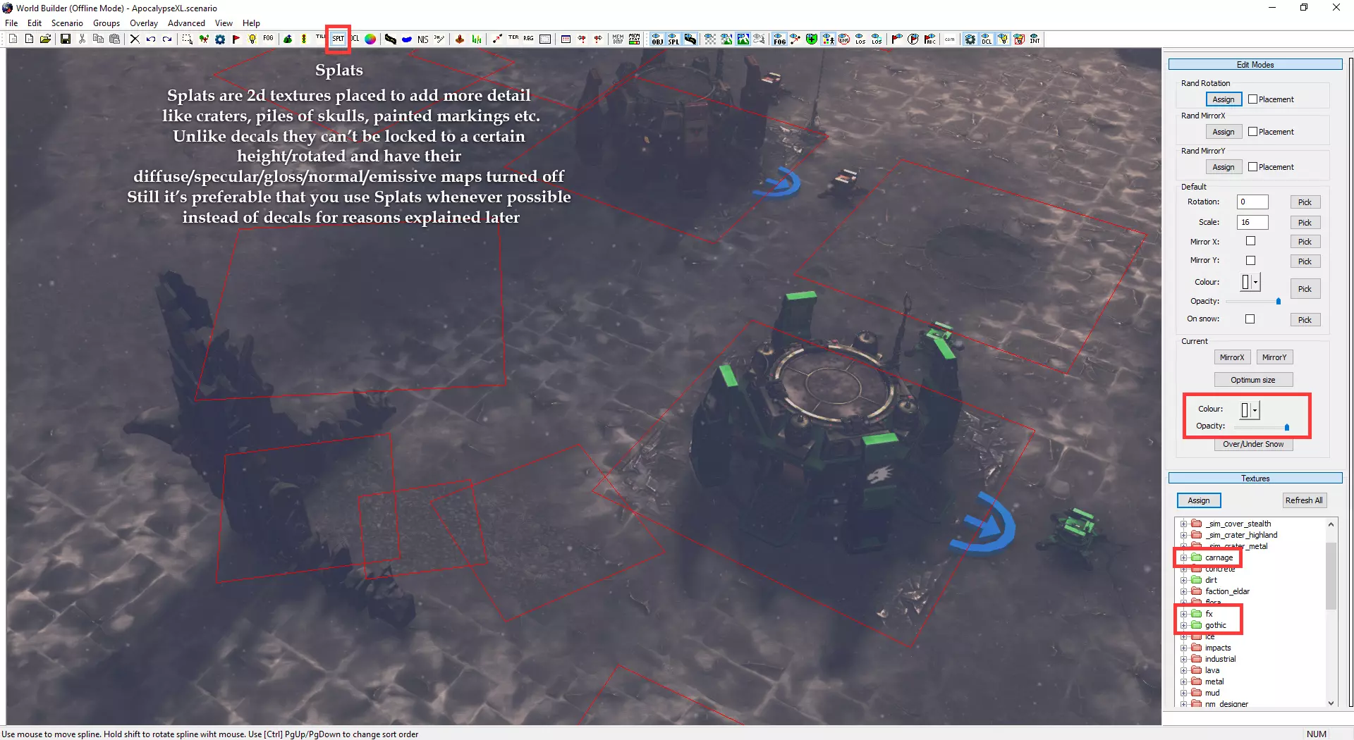 自定义小地图与加载界面 制作自定义小地图需使用Photoshop或其他可处理.tga文件的图像编辑器。 打开位于Documents/My Games/Dawn of War III/modssource/scenarios/路径下的[你的地图名称]_mm_generated文件 圈选出不可通行地形,新建图层并用一种颜色填充选区。用另一种颜色填充背景。 可使用颜色及内发光/外发光等图层样式效果,以匹配Relic的小地图风格。 编辑alpha通道以制作自定义边框。 将文件另存为.tga格式,命名为“[去掉括号的你的地图名称]_mm_handmade”。 制作自定义加载界面需在世界编辑器中为你的地图截取截图。从最佳角度展示地图。保存为多个.TGA文件需根据游戏模式使用以下名称: 核心模式:【你的地图名称(不含括号)】_loading_background_powercore 和 【你的地图名称(不含括号)】_unloading_background_powercore 胜利点模式:【你的地图名称(不含括号)】_loading_background 和 【你的地图名称(不含括号)】_unloading_background 歼灭模式:【你的地图名称(不含括号)】_loading_background_annihilation 和 【你的地图名称(不含括号)】_unloading_background_annihilation 带炮塔的歼灭模式:【你的地图名称(不含括号)】_loading_background_annihilation_with_turrets 和 【你的地图名称(不含括号)】_unloading_background_annihilation_with_turrets 相机设置