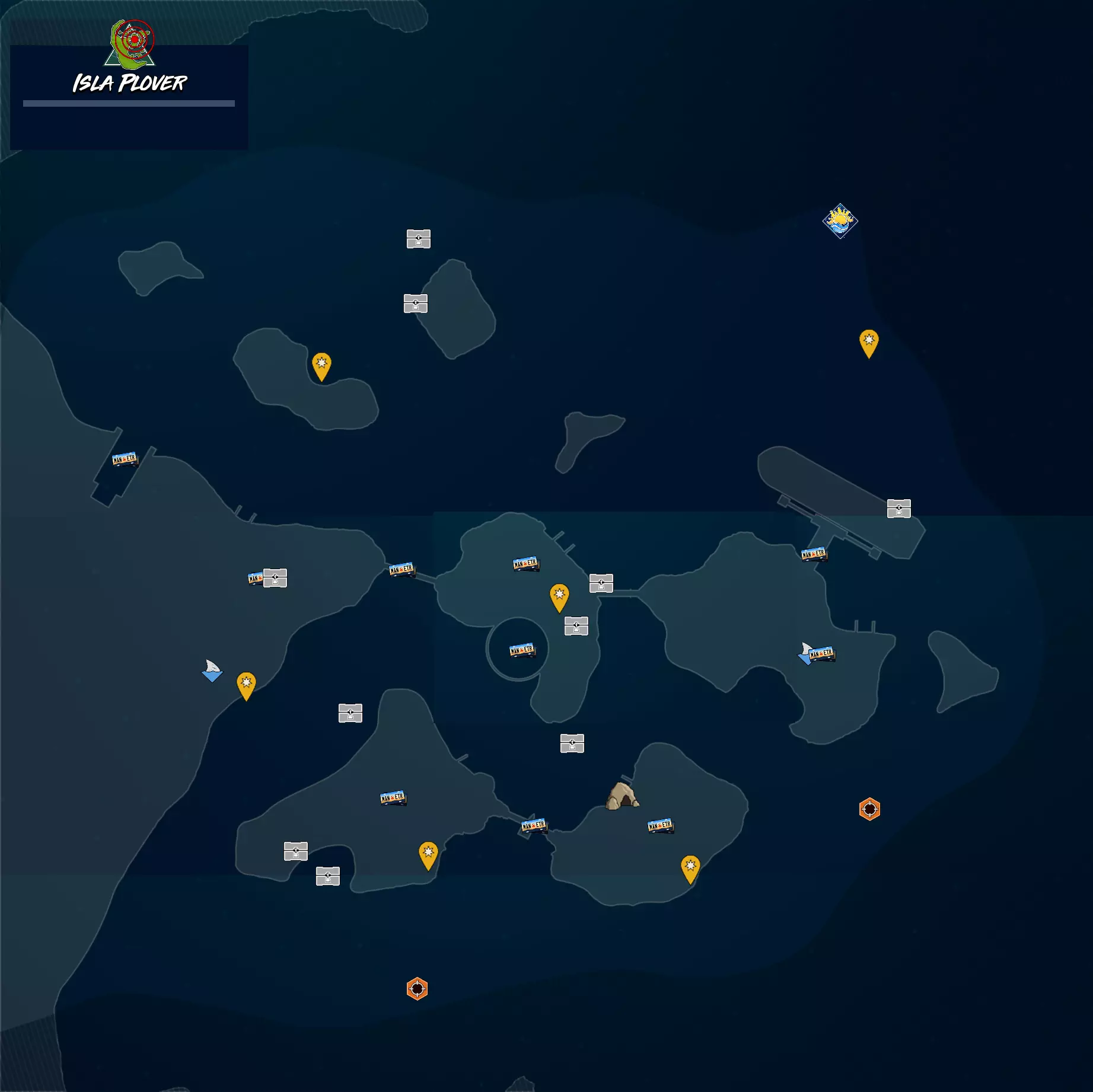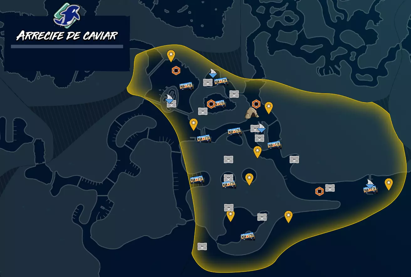 新的阿尔法捕食者 摧毁所有阿尔法捕食者 收集品和目标 地图各区域的收集品和目标。注意:位置为大致范围,请务必使用声纳进行寻找。 河口蟹湾目前没有特定成就,但你仍需找到该区域的收集品以达成【海洋女王】成就。