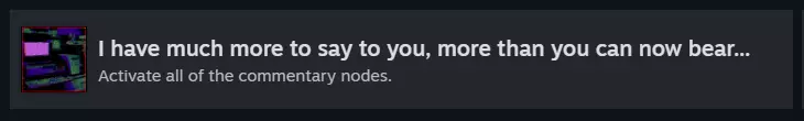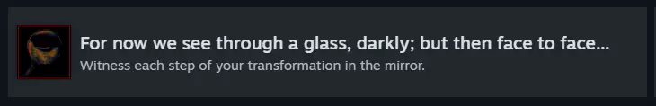 要解锁此成就,需在每次进入潜艇(该功能可使用时)时使用镜子,见证自身的转变。 • 形态1:首次进入潜艇时。 • 形态2:第二次进入潜艇时(研究前)。 • 形态3:第三次进入潜艇时(遭遇天使后)。 • 形态4:第四次进入潜艇时(第二次搜索海底物品后)。 • 形态5:第五次进入潜艇时(遭遇伊甸园生物后)。 ⚠️ 注意:此成就必须在单次游戏流程中完成才能解锁。 我还有很多话要对你说,比你现在能承受的要多……