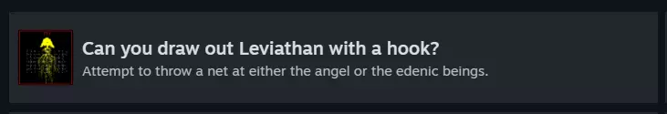 要解锁此成就,需在探索海底时向天使(黄色)或伊甸园生物(红色)投掷网。注意:第二次探索海底时会遇到天使,第四次探索海底时会遇到伊甸园生物。如今我们仿佛对着镜子观看,模糊不清;到那时就要面对面了……