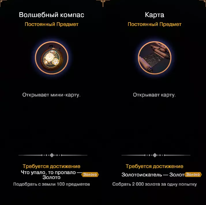 我不会像你第一次启动游戏那样详细说明如何玩这款游戏。它并不复杂,很容易理解游戏的细节。游戏中有成就,我们需要获取这些成就来解锁各种物品(强化)。这没什么难的,所以你能做到。必拿成就: "Что упало, то пропало - 从地上捡起100个物品"可获得指南针; "Золотоискатель - 单次尝试收集2000金币"可获得地图。