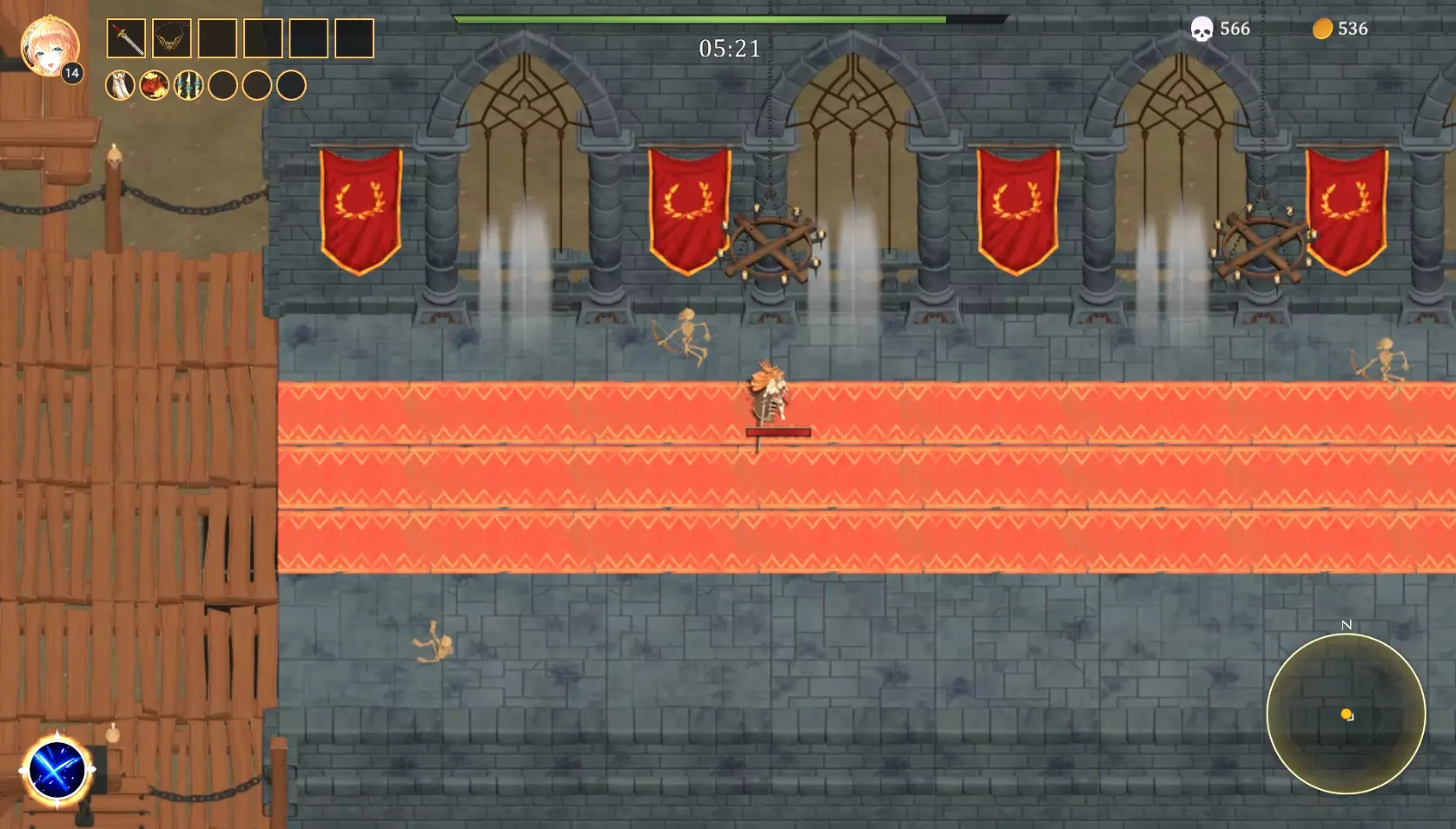 经过这个标记后,怪物将停止生成,地图上只剩下你和最终 boss。之后可以挂机并提升生存时长。 注意:屏幕顶部的计时器每60分钟会重新开始计时。结算时会显示在关卡中花费的实际时间。但如果你想大致掌握时间,可以记住开始关卡的时间。注意:如果您只需要生存时间记录,不一定非要走出围栏。沿着废墟边缘行走,可以找到一个站立时最终Boss不会攻击的位置。当我们突破关卡后,可以在地图上随机移动(不一定只朝一个方向,即使我们原路返回,普通宝箱也还是会出现),收集普通宝箱来积累金币,直到觉得厌烦为止。 注意:这种情况下,最好不要构建全屏攻击武器的build,因为普通宝箱会被击碎,我们甚至都看不到它们。不推荐使用:陨石;冰之法杖(强化版);半月之刃(第二种发展路线);灵魂匕首。 推荐使用:祝福之锤;死神镰刀;剑;雷电护符(最强力);弓;十字架。