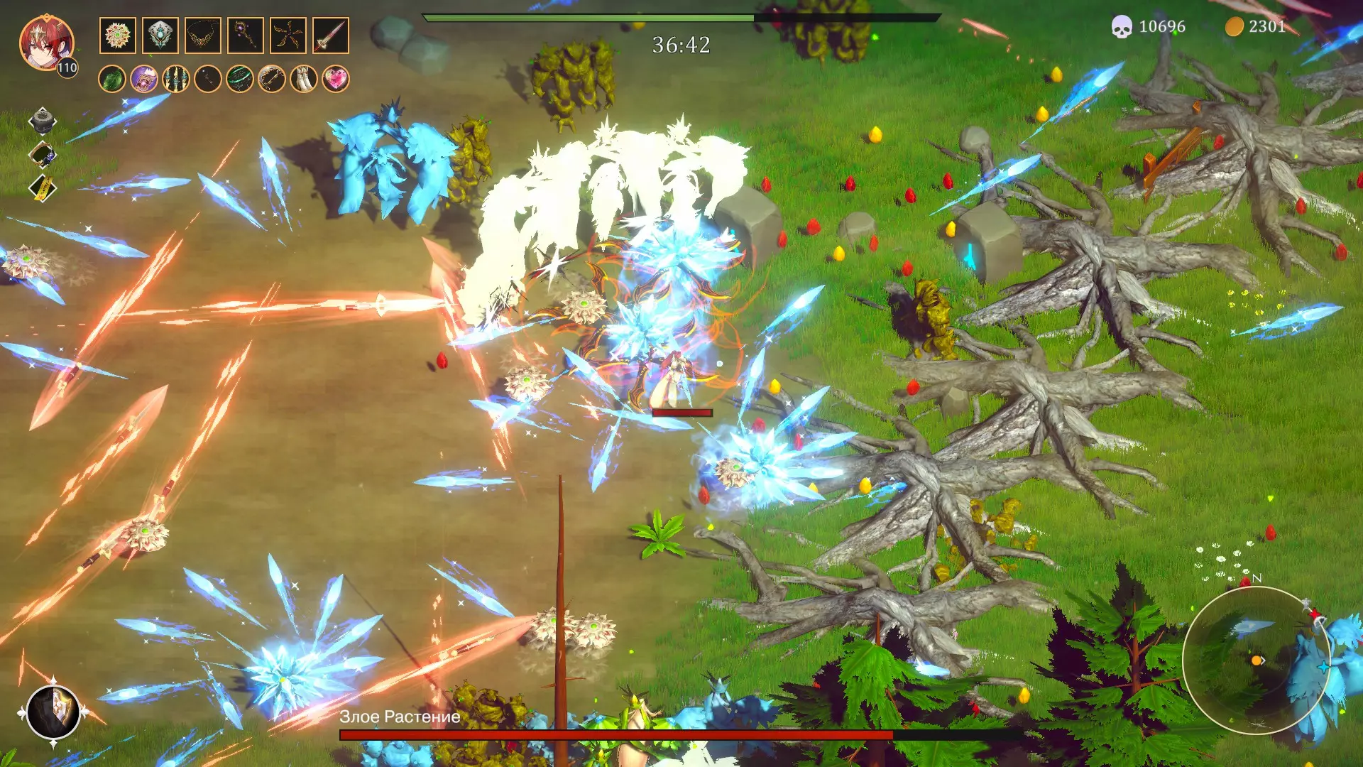 索菲亚 索菲亚的特殊能力并非战斗类(而是制作药水),因此在面对复杂情况时会比较难脱身。但这个能力能带来不错的增益效果。每收集到一瓶药水后,会随机提升一项属性(甚至可以获得复活能力)。由于该技能的冷却时间不算短,所以我们需要在地图上移动,寻找并打开宝箱。宝箱会掉落金币和药水。这些从宝箱中获得的药水也能强化索菲亚。所以,除了通过被动道具提升基础属性外,我们还能通过拾取药水来额外提升属性。因此,我们的发展速度会更快。 罗莎琳娜 罗莎琳娜的特点是,在主动技能生效期间,获得的经验值会翻倍。对应的策略是:最好集中击杀怪物,也就是不要在整张地图上乱跑。尝试在激活技能时收集水晶(激活技能后,罗莎琳会在一段时间内快速移动,同时对怪物造成伤害),尤其是来自小 boss 的水晶(红色水晶)。并且等待绿色发光球体出现(它能收集地图上所有掉落的水晶)。一旦激活技能,就必须立即拾取这个绿色球体。我们将获得更多经验,因此我们的发展速度也会快得多。 生存记录 现在我们要创造生存记录,以便向朋友们炫耀帅气的截图。 为此,我们必须稳稳地通过第一关。第一关有一个特点。当最终Boss【魔法植物】出现时,其周围区域会被树木封锁,理论上无法走出。但实际上是可以出去的。如果不断在树根之间尝试,就能穿过去。不过并非所有位置都可行,需要多尝试不同地方。还有一个功能可以让这个操作更简单。 提升移动速度的功能:连接游戏手柄。如果使用模拟摇杆朝着地图(屏幕)的对角线方向移动,角色的移动速度会比当前移动速度快约1.5倍(或略多一些)。利用这个特性可以钻进树根之间的缝隙。返回 Boss 处也可以用同样的方法。在地图上移动时也能这样操作。