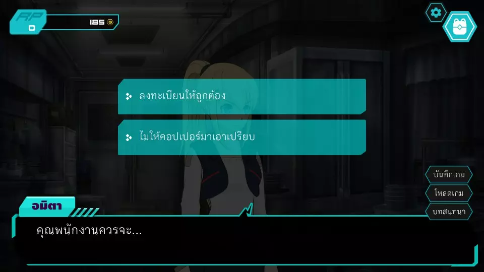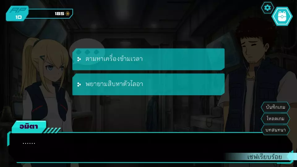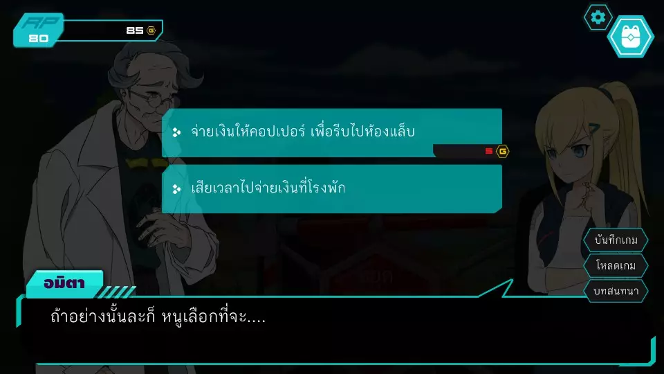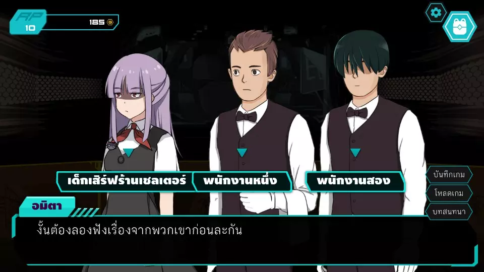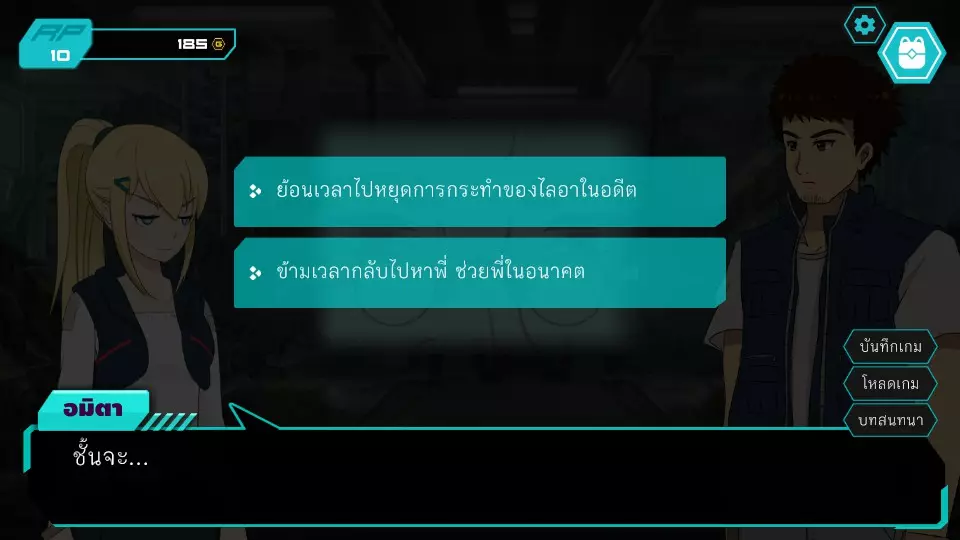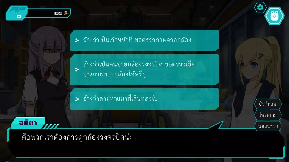 决定1:查看餐厅监控。角色点数:0。金钱:0-185。服务员小孩要求查看官员证件,两人都没有。博强于是决定悄悄溜出去当电工,然后独自从餐厅后面爬进去查看监控录像带。阿米塔则借口说博强会去拿证件来给他们看。服务员小孩要求查看身份证明文件,两人都没有。博江决定温柔地成为一名电工,然后独自爬上店铺后面查看闭路电视录像带。阿米塔为自己辩解称博江会去拿文件给她看,服务员小孩同情那位女士,允许两人通过各种方式上去查看闭路电视录像带,这将让阿米塔获得时间机器失踪的线索信息。正要出去时,就被店里的员工一起带到店后躲避警察,迎来了第二个抉择。