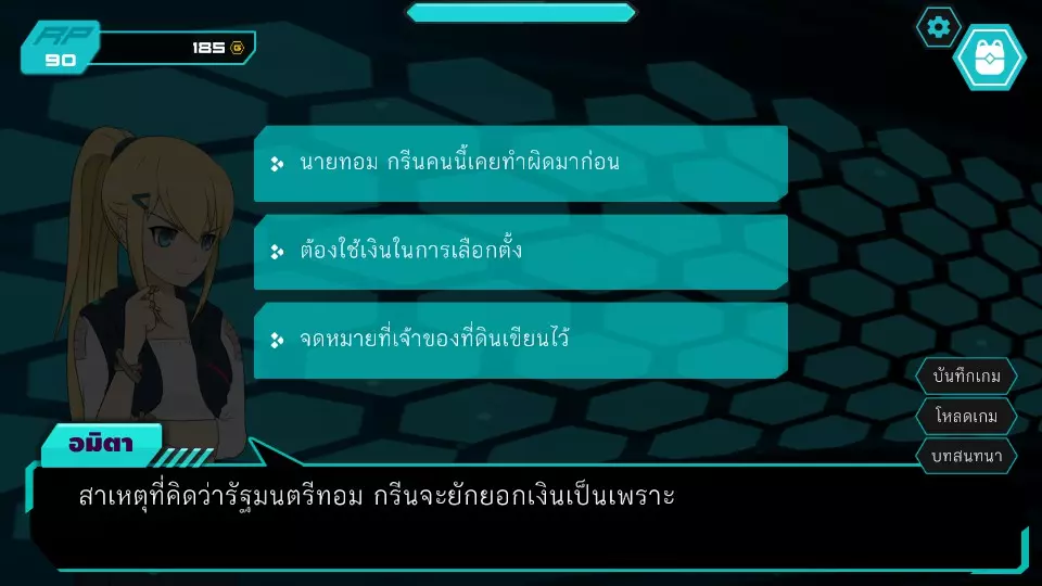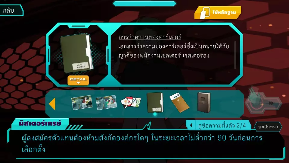 决定7.1:拉下面具面对角色 RP:0-10 金币:0-185 ***影响成就获取*** 博强试图无视阿米塔,但未成功,阿米塔在正义爆发前指向了角色。(选择此选项将在调查结束后立即解锁成就“Good guy, but not the right one”)博扬同意了,但就在那时,科珀以阿米塔涉嫌闯入餐厅查看监控摄像头为由将其逮捕,阿米塔因此与博扬分开。之后,博扬对新的红灵党代表感到震惊。剧情将推进到阿米塔被带到旅馆的阶段,请跳过调查结束后的内容(第6章正义突破)。第5章(选举案)正义突破第6关:阿米塔 vs 卡特