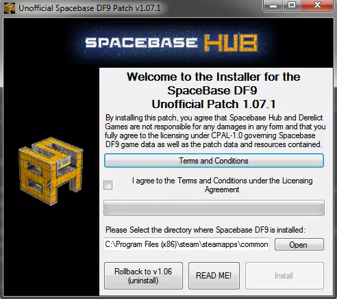 第一步:你可以直接打开.zip文件并使用其中的.exe程序,不会有任何问题。但如果你仍有顾虑,可以将其解压到某个位置。然后双击UnofficialSpacebasePatchv1071.exe,此时应该会弹出如下所示的安装程序。