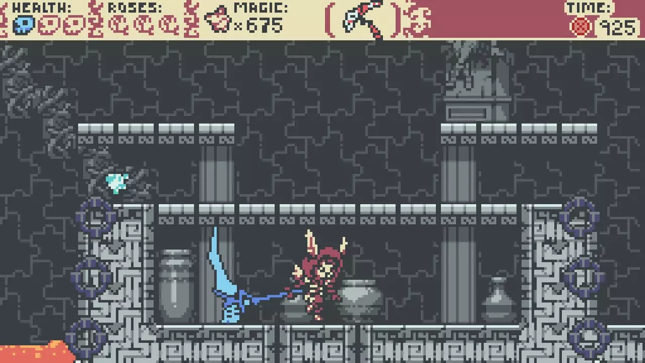 至少有三种方法可以帮助你较为轻松地通过: 1. 贴近左侧墙壁,然后加速跳跃通过。 2. 直接加速跑,在合适的位置使用镰刀的二段跳,之后通过攻击解除僵直状态,再贴近右侧墙壁。 3. 直接使用魔力。