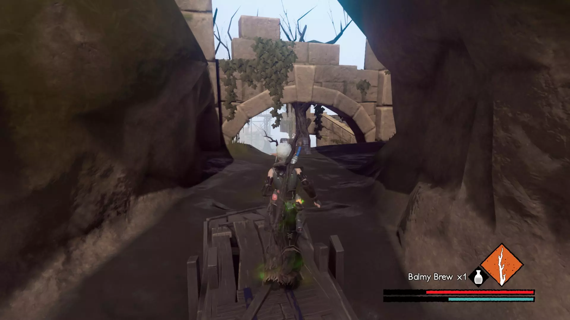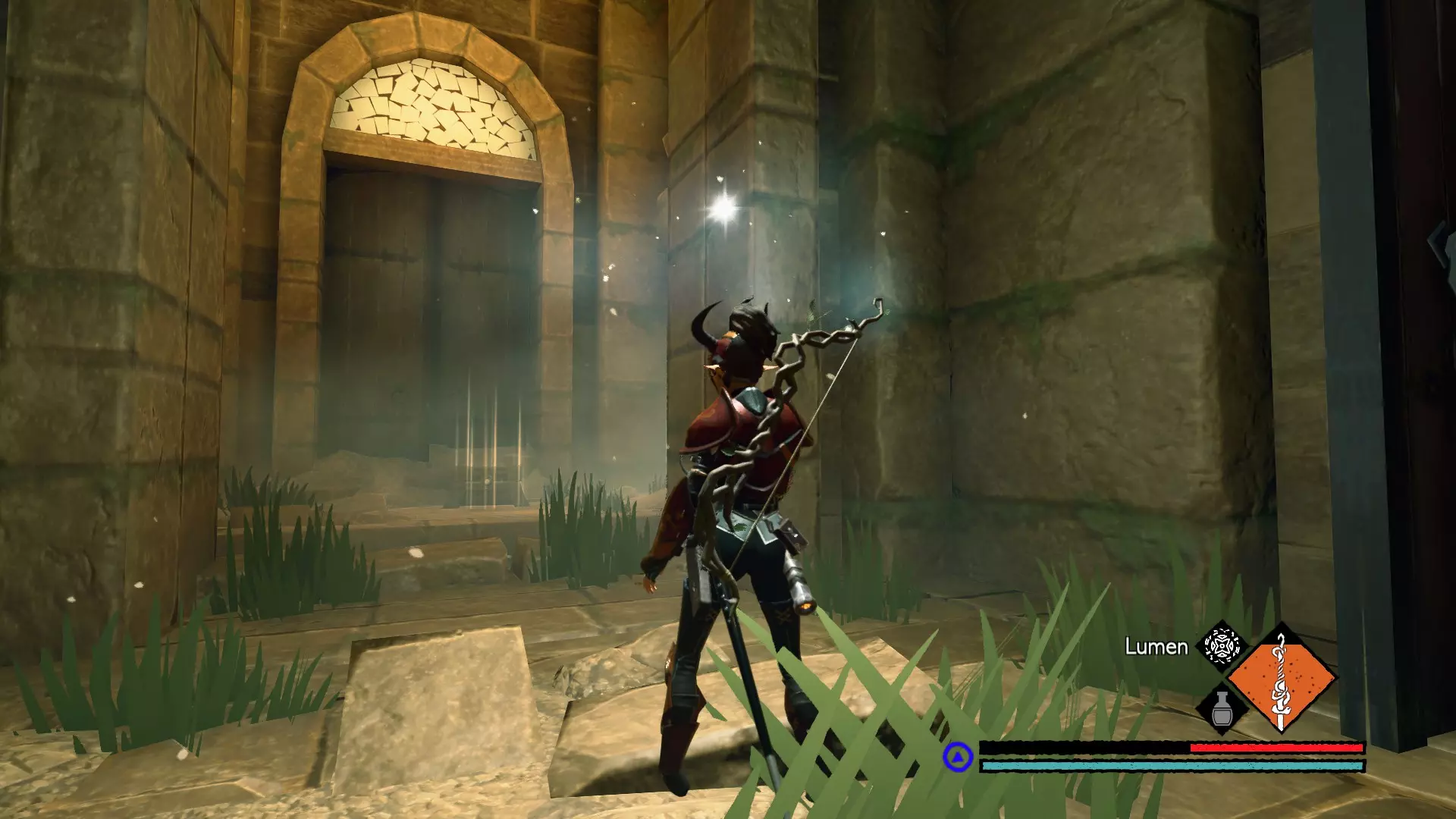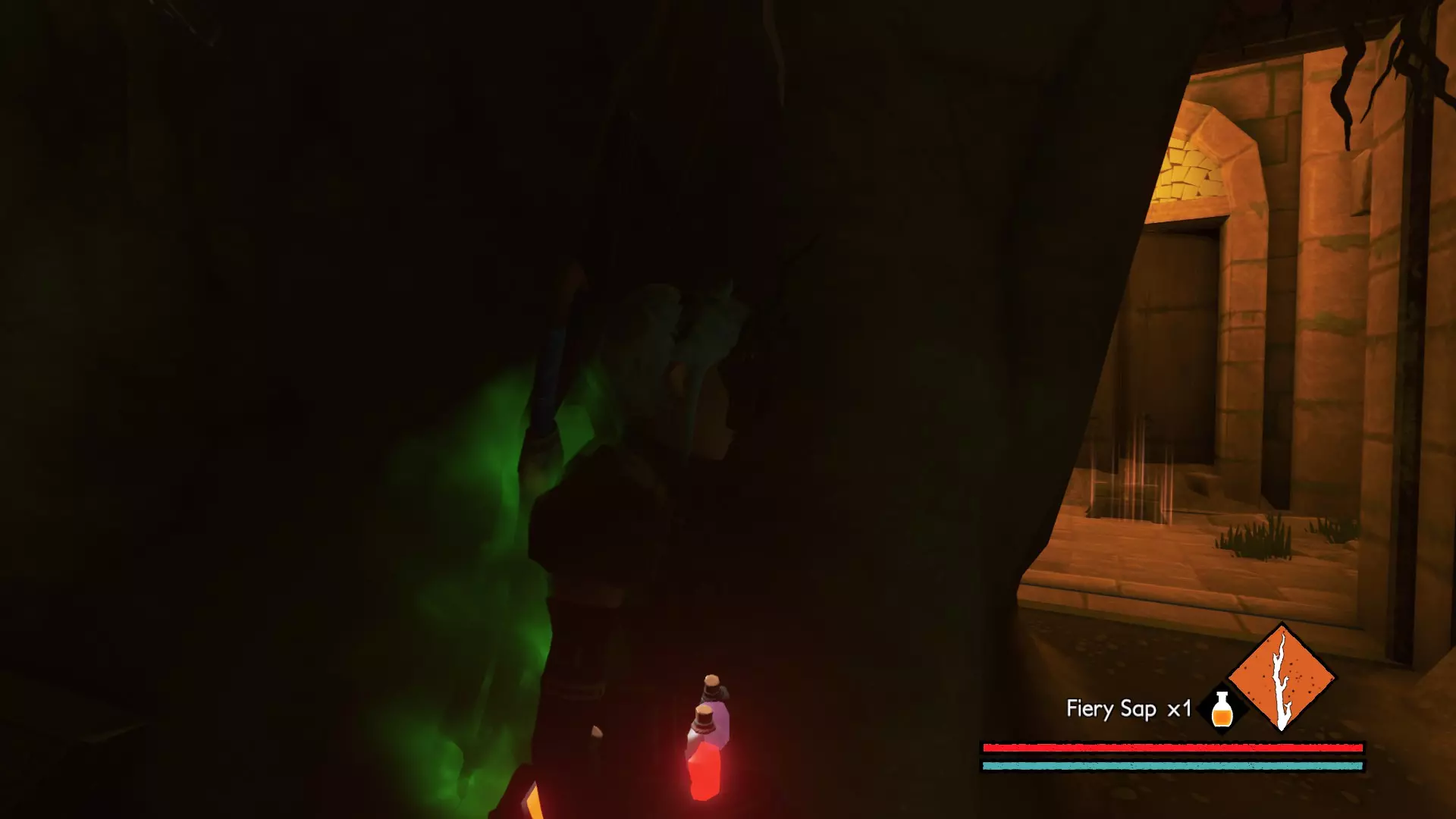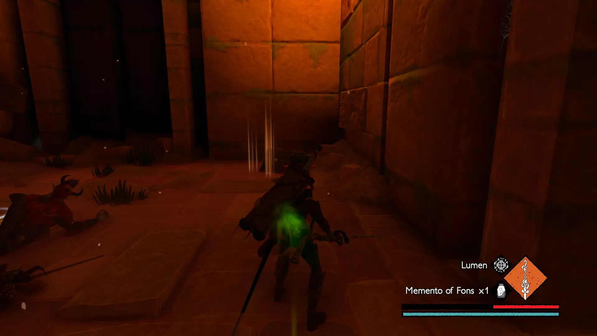宝箱3:它应该在一扇被毒藤覆盖的门后,烧掉毒藤并跳过发光的坑,就能找到【丰斯的遗物】(Memento of Fons)。