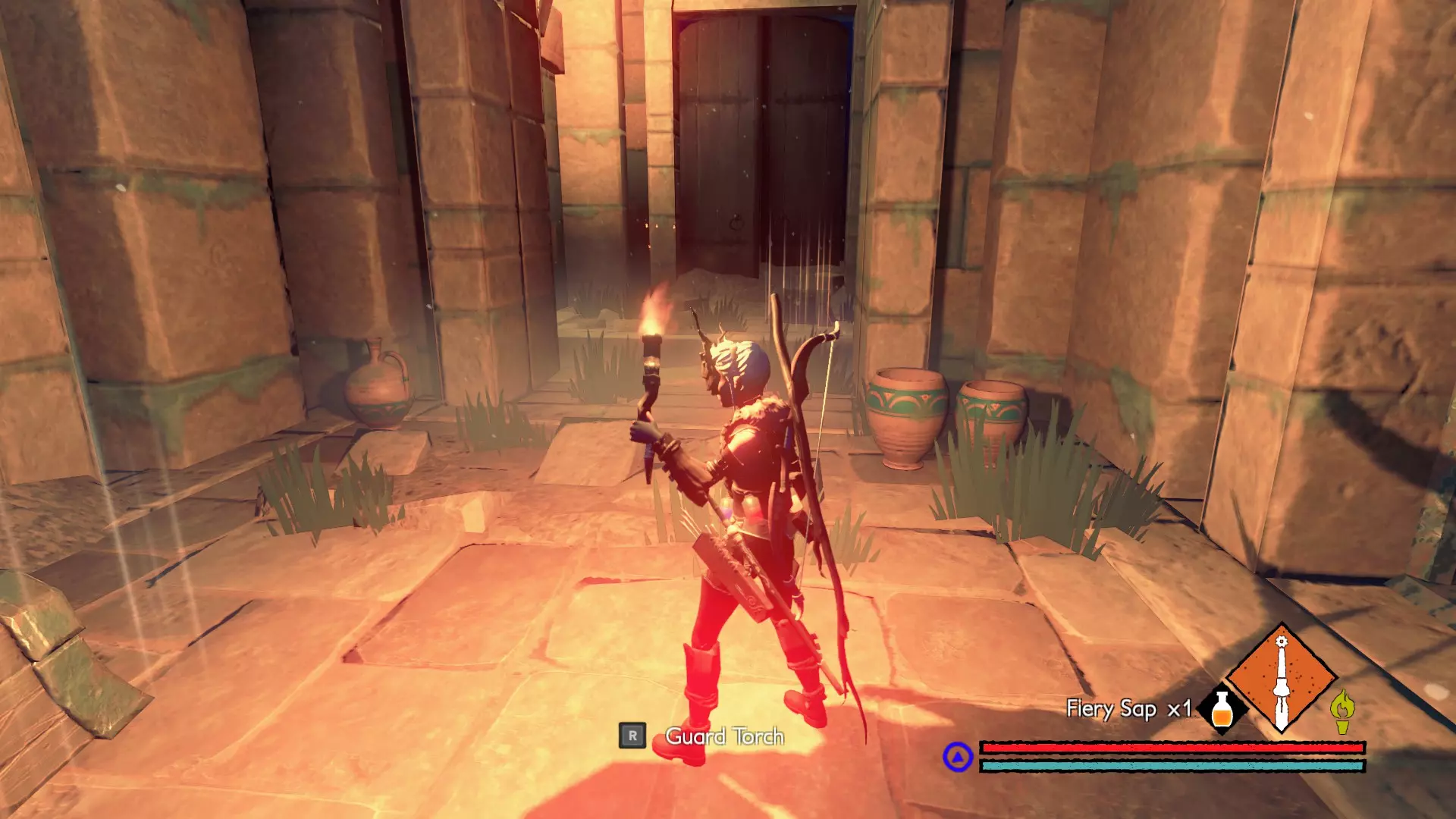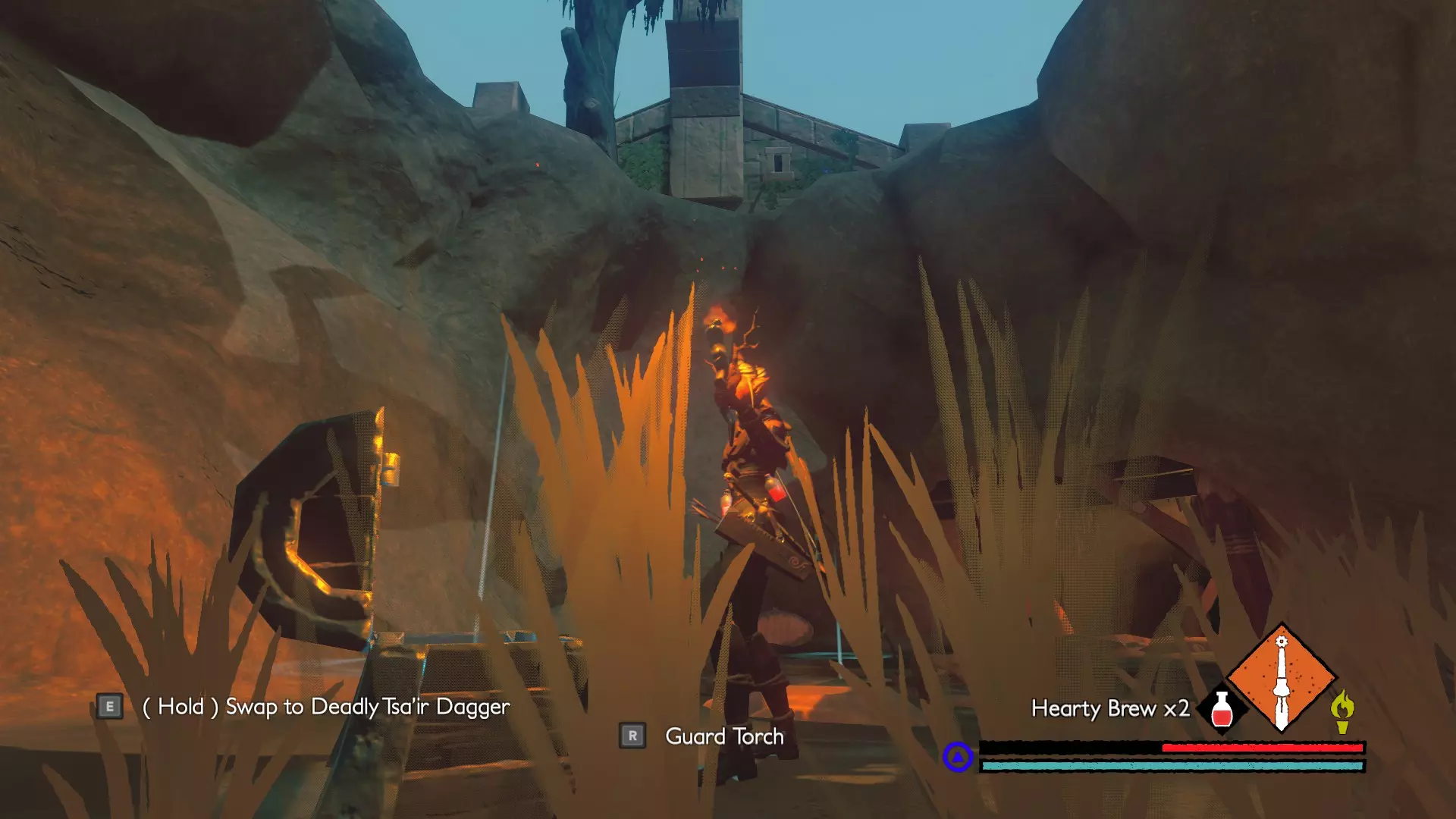 圣谷 宝箱1:进入这座巨大的圣所后,沿着螺旋坡道向上走到该区域的最高层。在获得名为【蛇吻】(个人认为是游戏中最棒的武器之一)的武器前,你需要先与一名先祖蛮兵战斗。