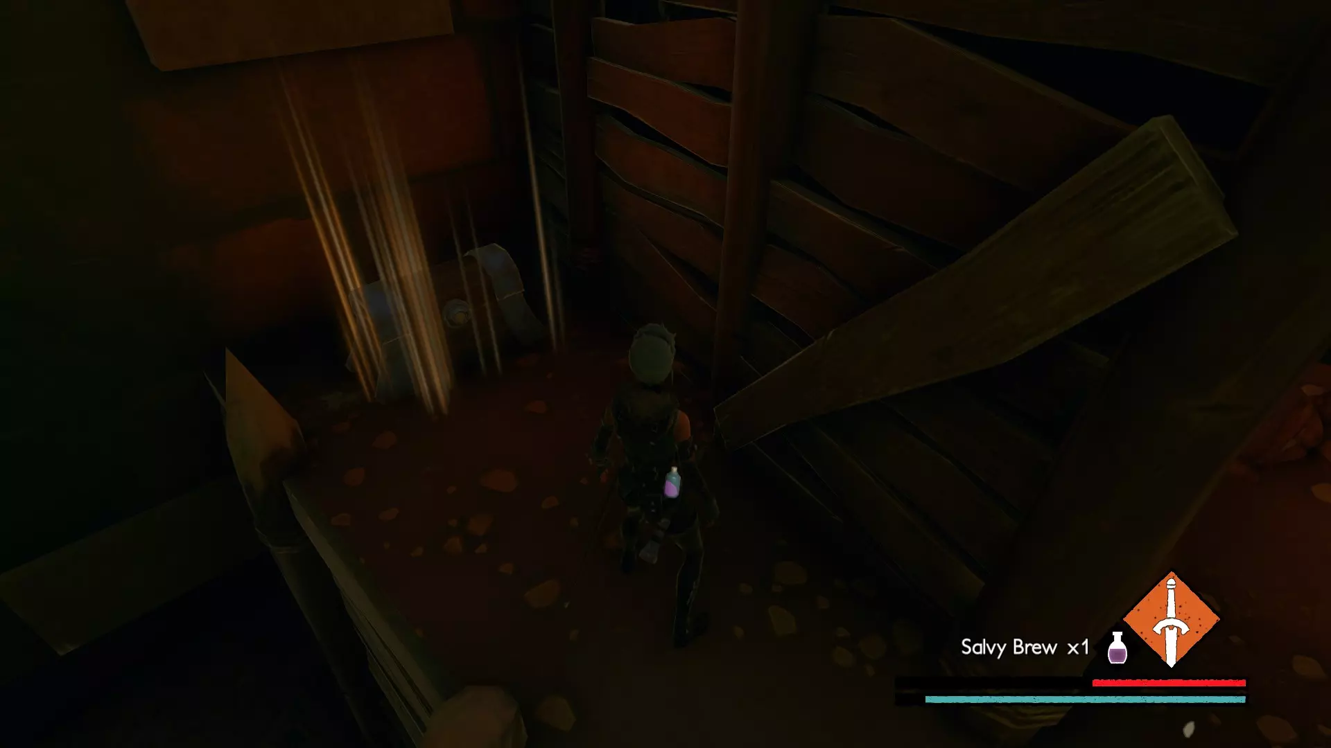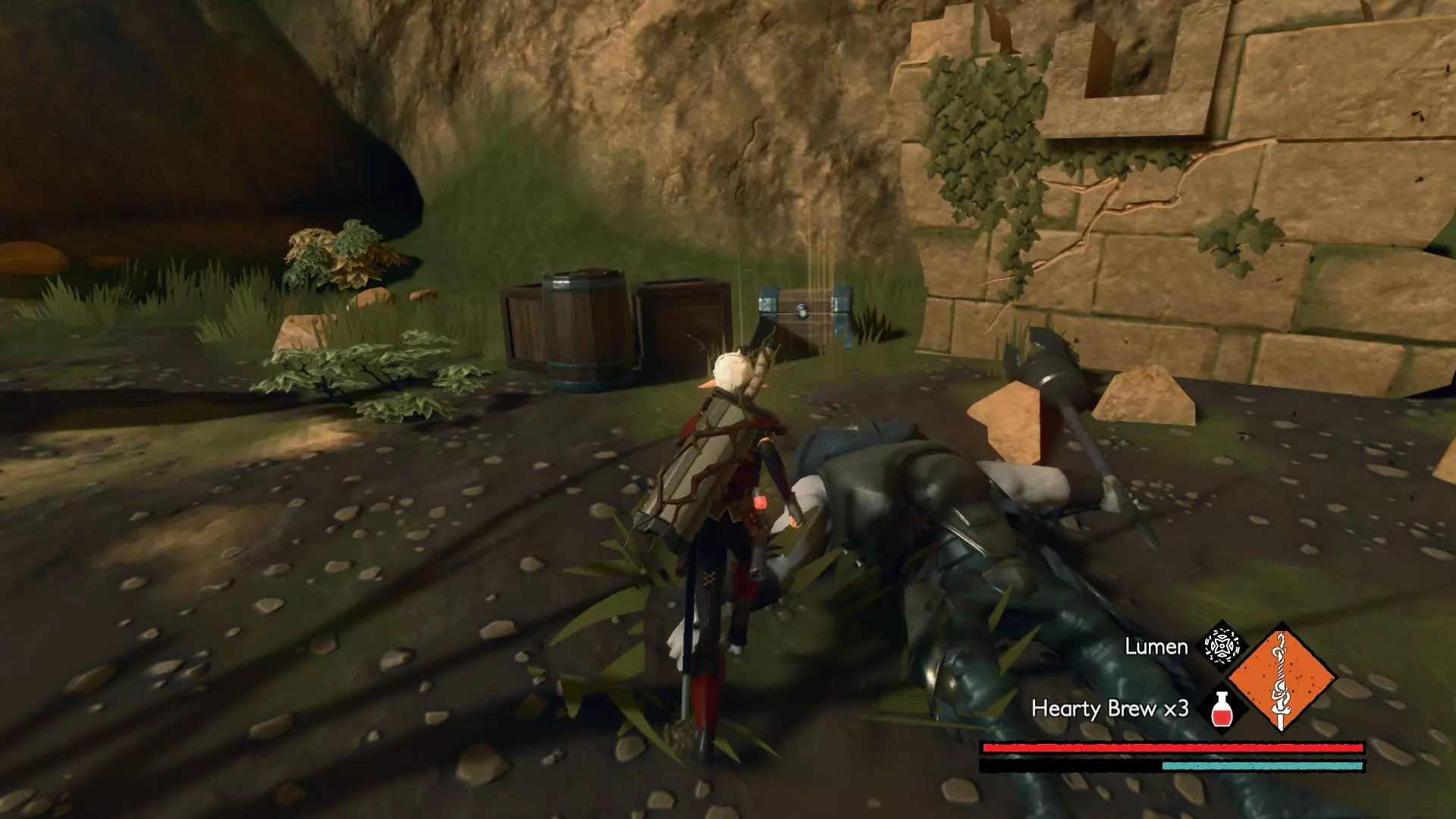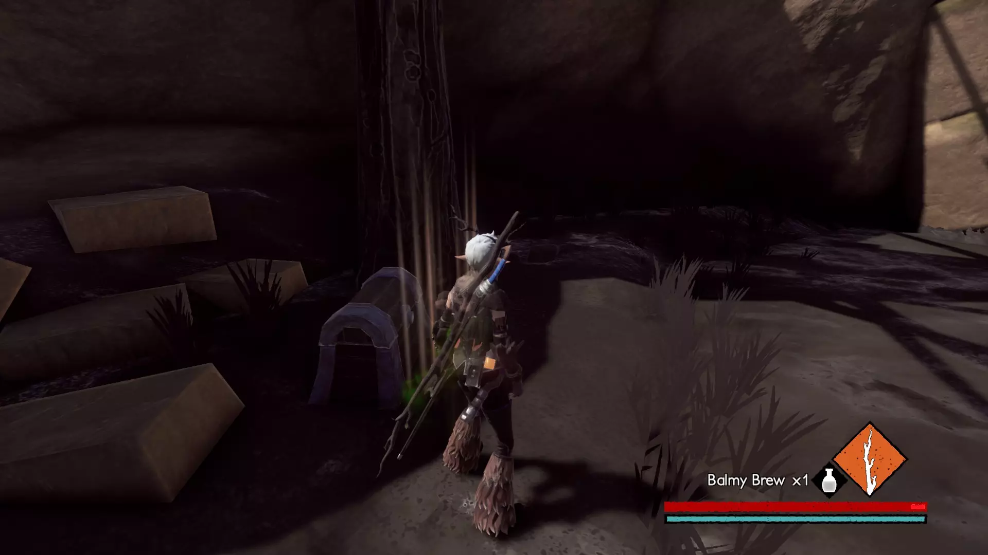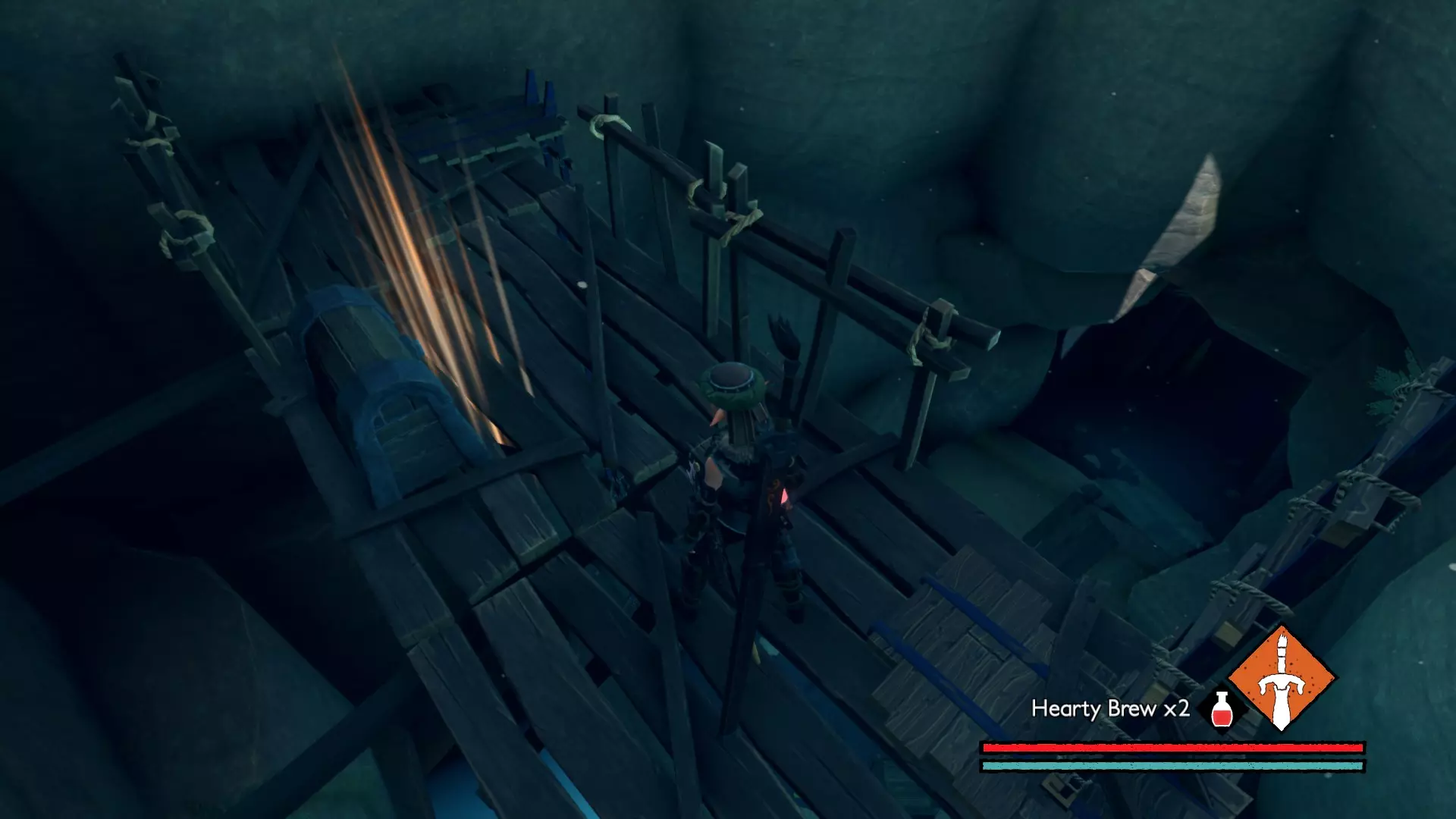 宝箱#3:位于关卡接近末尾处。在休息圣坛休息后,会遇到一个需要你的麋鹿打开的大门。穿过大门前,你的左侧有一间伐木小屋。进入小屋后向左走,打破木板会露出一条隧道,沿隧道前进即可找到该宝箱。