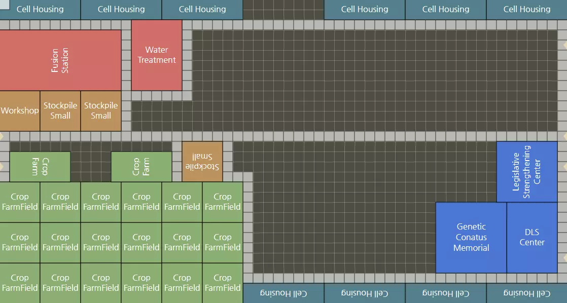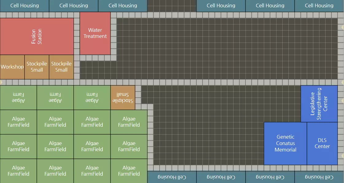 31区立法强化纪念碑 1个DLS中心 2个医务室 2个食堂 1个聚变站 1个水处理中心(可选) 1个基因潜能纪念碑(可选) 2个作物农场和18个农田 或 3个藻类农场和12个藻类种植园