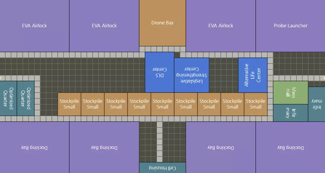 21区立法强化纪念设施 1个DLS中心 2个医务室 1个食堂 4个停靠舱 3个EVA气闸 1个探测器发射台(在第四章左右移至其他区域,并替换为第4个EVA气闸) 1个单人牢房 2个优化宿舍(或4个普通船员宿舍) 1个替代生命中心(可选) 1个无人机舱(可选) 至少需要9个储存库,除废料和氢气外,每种资源各一个。