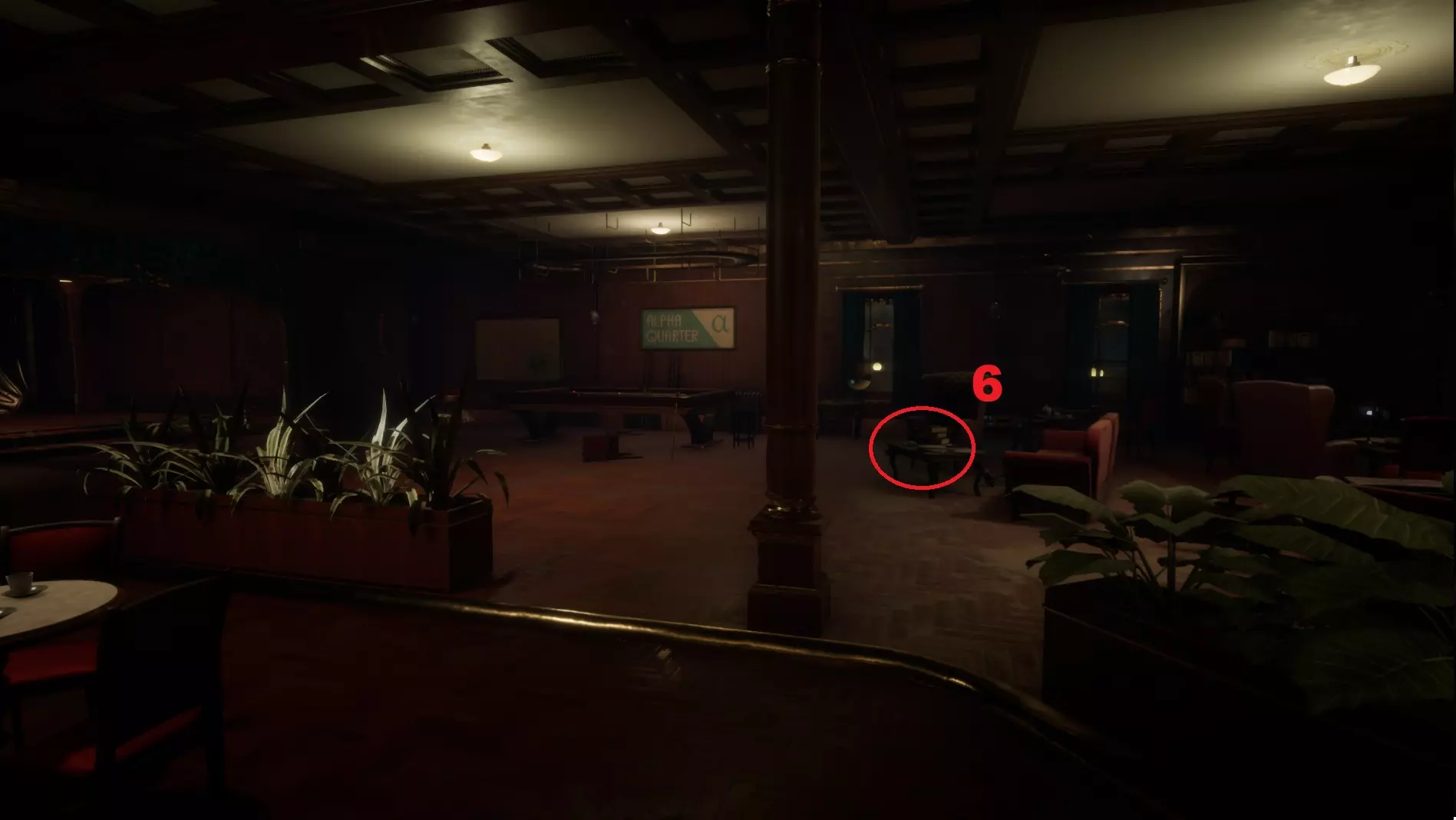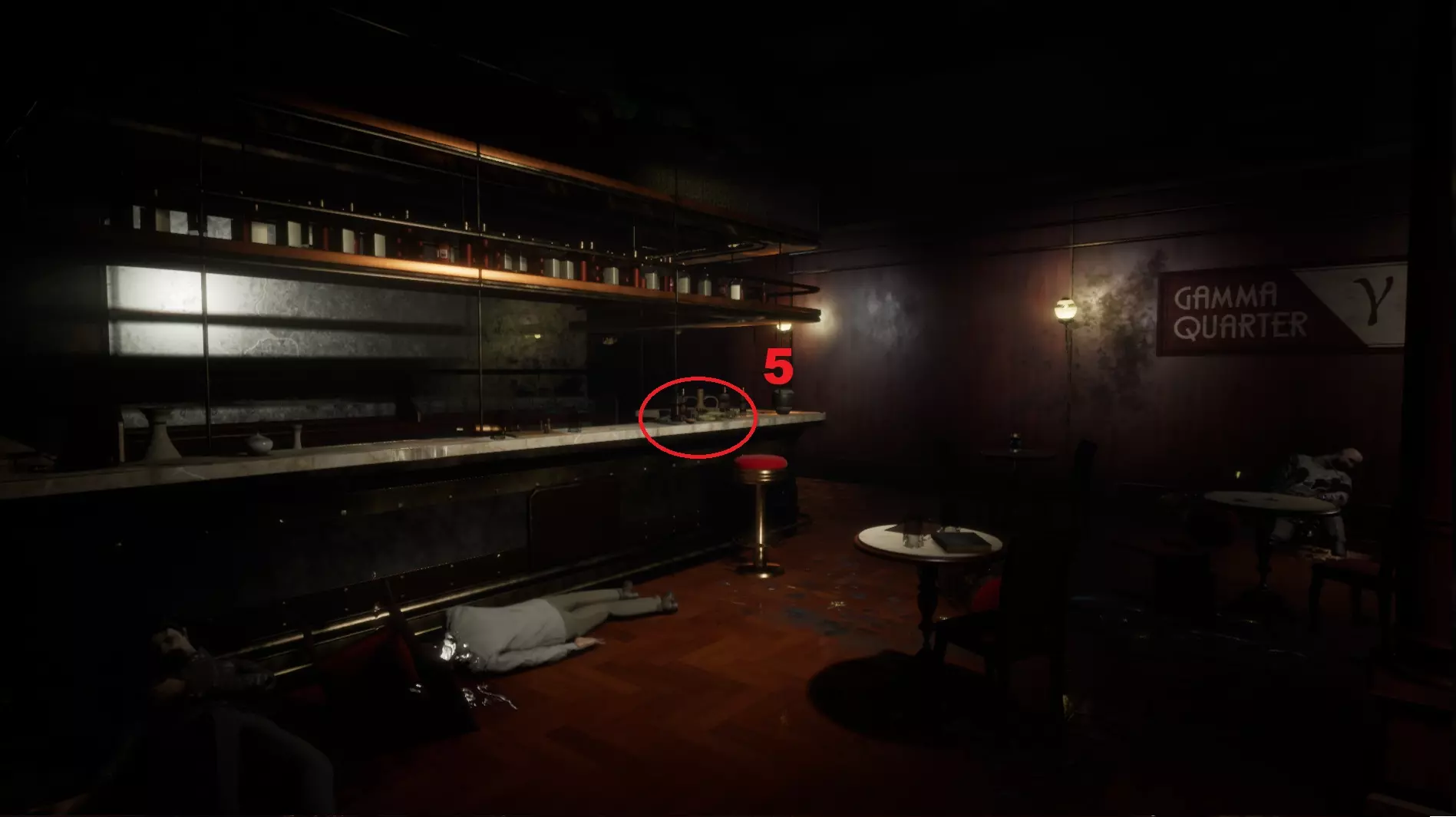 5 - A.金的钥匙卡。伽马区。在大厅的吧台上。