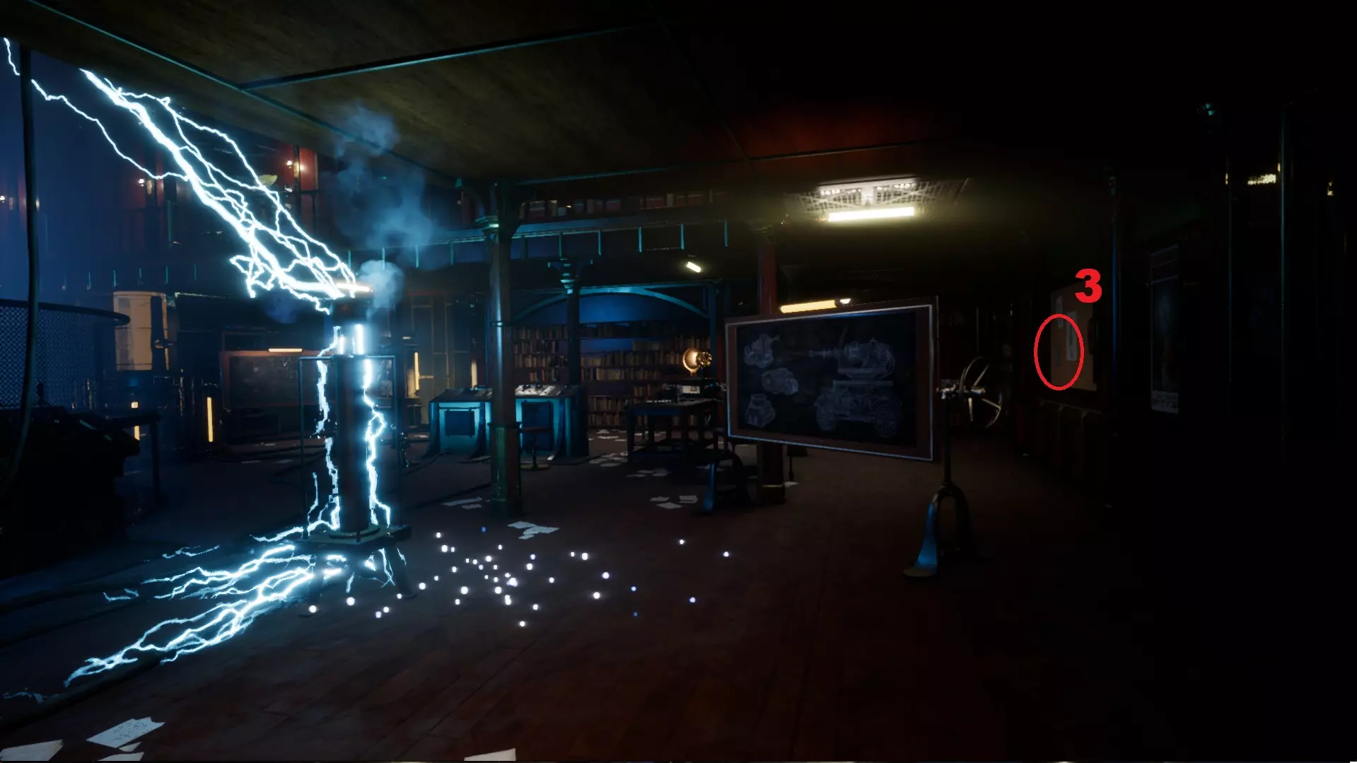 5 - 蓝图【球形闪电发生器】。在经过有笼子和老鼠的房间的追逐战后,位于左侧的工作台上。