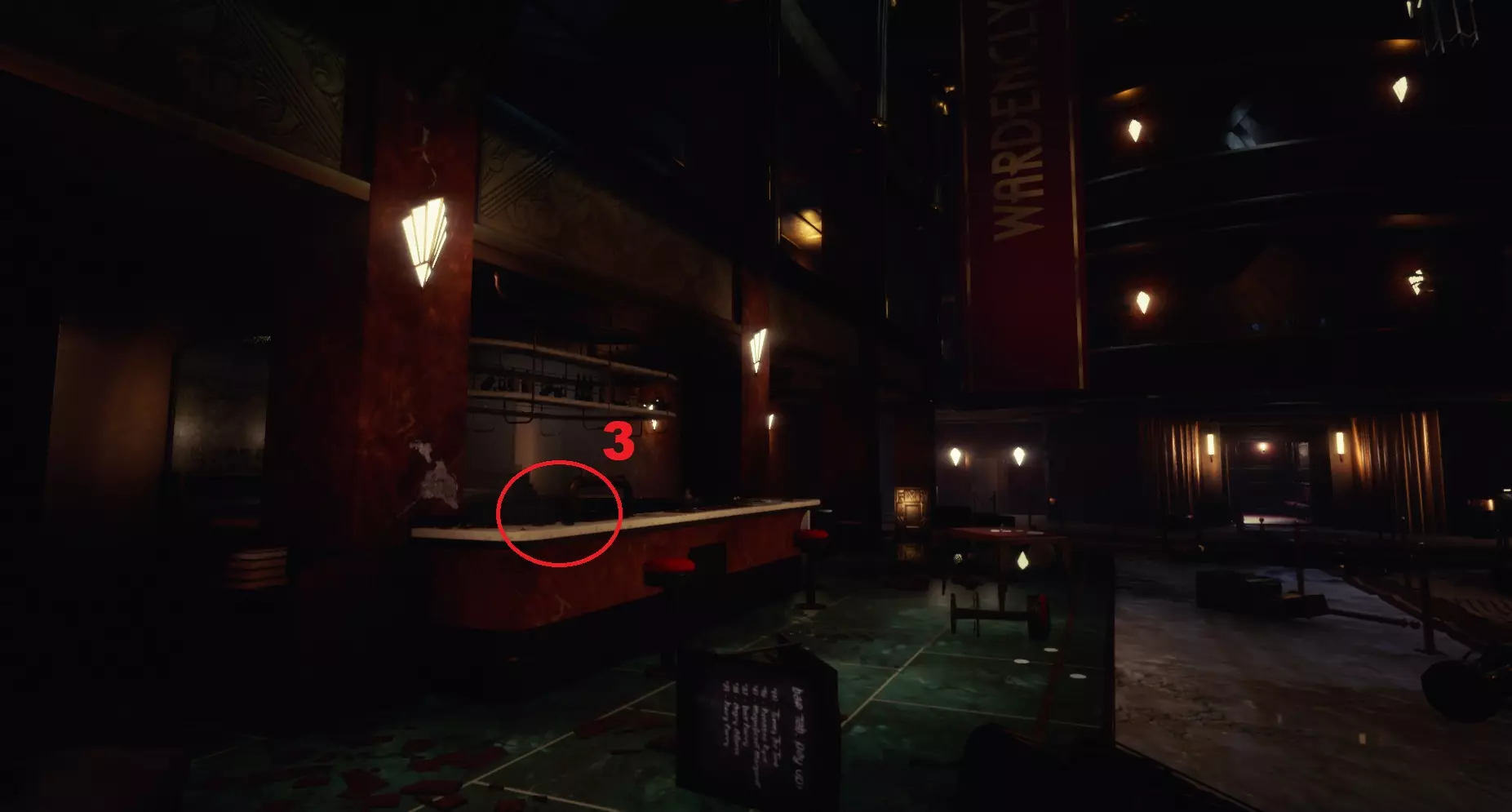 3 - 面具:安全部门。在大厅左侧的吧台上。