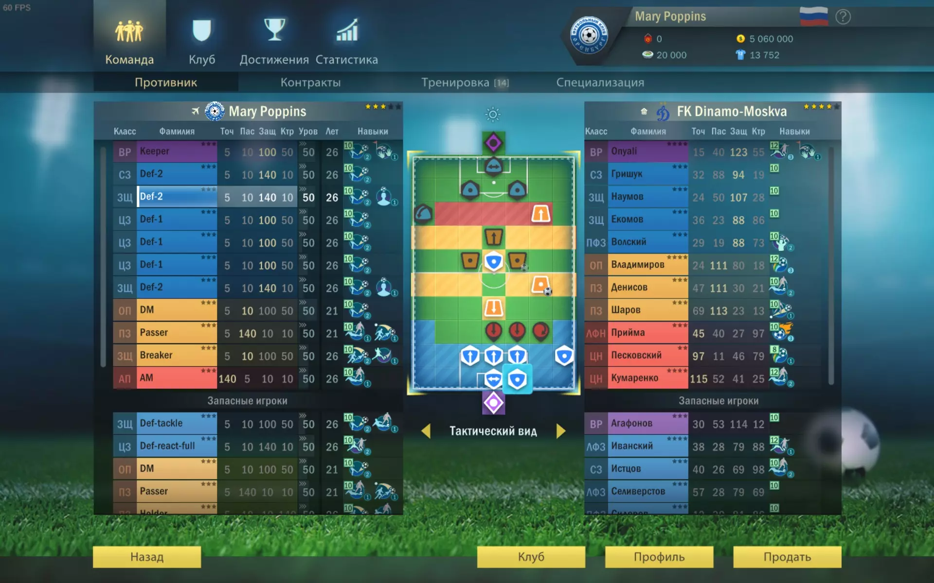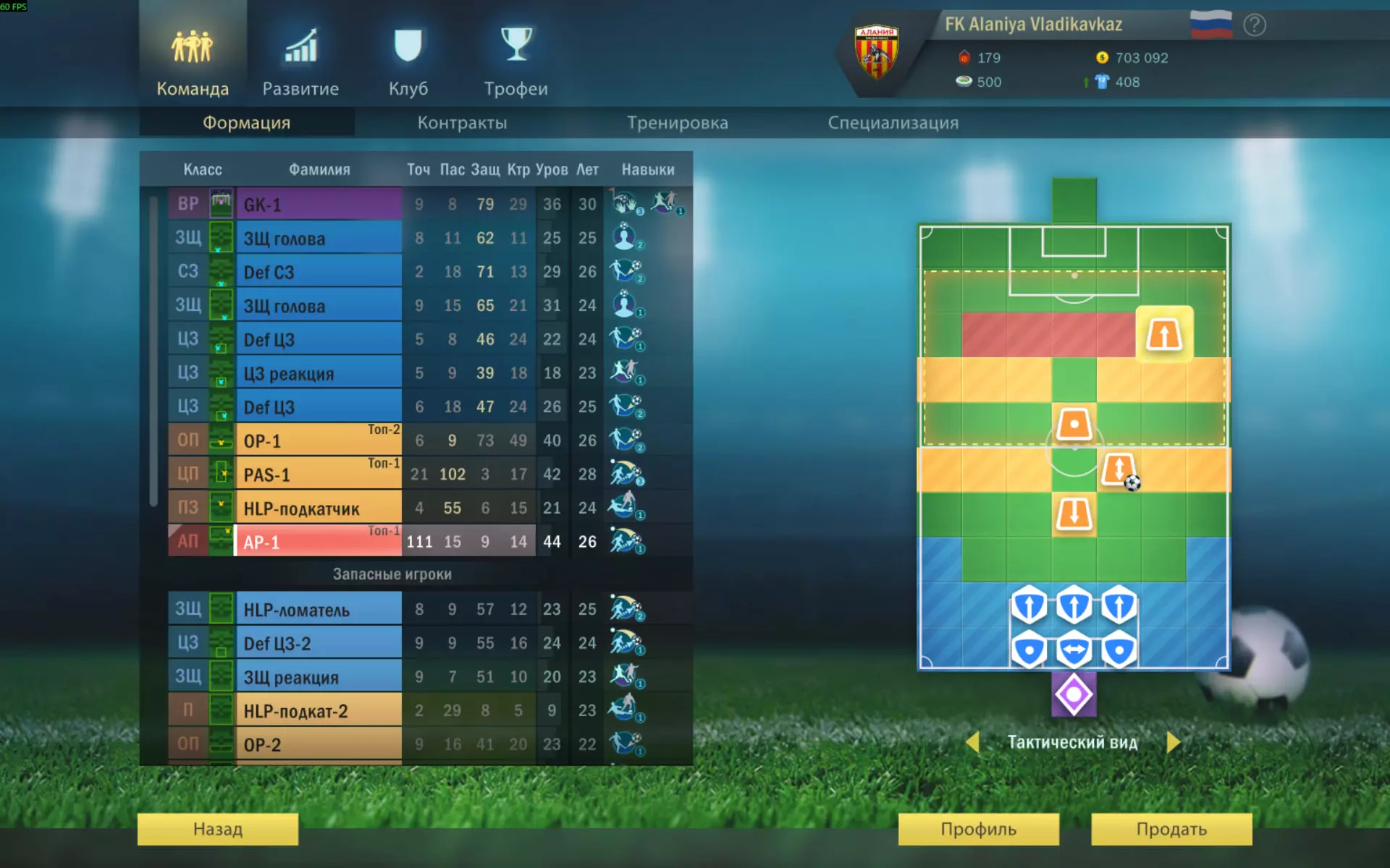 现在我将详细介绍每个位置。 前锋 游戏中的核心角色。遵循“得球-射门-进球”的原则。整支球队都围绕他展开进攻。 类型:AP。 只有他能在不靠近球门的情况下进球。 属性:极高精准度。 超高的精准度加上较低的远射惩罚,简直就是一台进球机器。 技能:影响不大。 AP很少使用技能。以防万一,可以选择【枫叶冲击】——这是一种额外的进攻方式。当精准度较低时,【推力冲击】【假动作】【直塞】或许能提供帮助,但它们的使用概率非常低。可以选择【头球】来在角球战术中进球,但为此你必须手动执行角球战术。 如果你亲自操作游戏,可以选择【挑传】——它有时会在角球后派上用场,不过并不常见。但是!因为它能同时带来三个优势: - 几乎覆盖全场的可靠拦截 - 免费拦截(不消耗行动点) - 保持传球链的连贯性 在游戏初期(业余联赛阶段),可以考虑提升【策应者】的控球属性,并将其部署在球场边缘。在你的球员尚未掌握【长传】技能前,你的行动点将不足以完成射门。在这种情况下,回合结束时,将球留给高控球能力的球员比留给【AP】更有利,这样球更难被抢断。此时,【Класс】甚至比【НП】更好,因为它有控球加成。但要注意,当对手出现拥有【Подкатом】或【ОП】的球员时,控球的效果会立即下降。因此,这是一个暂时的角色,尽管在初期相当有效。要么发生奇迹,让你遇到一个传球和控球能力各占一半的球员;同时他还具备【低平球】和【跑动传球】技能。这样的球员可以冒险培养成全能型球员——既能持球、抢断,又能传球。 另一种进攻方案 如果守门员或防守球员的防守能力非常强,很难突破。这种情况下,可以尝试通过头球来进攻。如果门将没有【出击扑救】技能且控球能力较低,这种方法的效果会特别好。但即便门将具备该技能,通过这种方式进球的可能性依然存在。 不要使用【行动点】,而是派上一名传球属性不低于25(最好50以上)的球员。通常是【中场】或替补【边锋】。 在他旁边的进攻线上,安排一名拥有【头球】技能的球员。通常是你的【中锋】;也可以为此目的签下【前锋】。摆放球员时,要确保在他和对方守门员之间没有两名防守球员,这样就能使用【直射】来射门。如果对手有【边后卫】,要考虑到其自动向边路移动的特点。 接到传球后,执行【直射】(将球传到球门区域的方格)。拥有【头球】能力的球员会尝试头球攻门。 【头球】3级技能能为射门球员提供100点技能值加成。很多守门员的控制属性加成远不及这个数值。因此,你的进球概率将超过50%。 这种方法有两个缺点: 1. 传球球员在分球时并非总能完成射门。当射门位置的传球路线仅存在于罚球区和禁区之间时,就会出现这种情况。此时,传球球员会直接丢失控球权。在这种情况下,需要提前将其移动到合适的位置,且不带球。 2. 这种方法需要额外的一名球员。这意味着你将不得不放弃使用拖后中场。更准确地说,边锋将出现在攻击型前卫的位置上,这会使其大部分作用无法发挥。不过,这种进攻方式需要留意,在对手防守非常强大的情况下,它可能会帮到你。 防守 防守队员按照3+3的阵型进行布置。为什么不是5+1呢?5+1阵型在比赛初期防守效果更好,但很容易被打破。一旦有一名防守队员离开防线,对手的进攻球员就会趁机从形成的缺口突破。或者无球的边锋会直接跑向门将。3+3阵型稳定性显著更高,因为第一线防守队员的移动不会破坏第二线的整体阵型。该阵型还能保护门将免受头球威胁。只有当对手有边锋时,才需要改变3+3阵型。这时需要将一名中后卫移到边路,以阻挡边锋使用“突破”技能。重要的一点是——不要给后卫装备【前插】!如果后卫有【前插】特性,AI会频繁利用这一点,把你的后卫从他们的位置上引开,从而瓦解你精心布置的防守阵型。而只要后卫保持在指定位置,这个防守阵型就几乎难以被突破。 同样的问题也会出现在你设置边后卫的情况下。边后卫移动速度快,AI会不断把他们从位置上引开,让他们往中路跑。你的球队会变得更具侵略性,但防守能力将大幅下降。 我们来具体分析各个位置。 边后卫 他们的主要任务是防止进攻球员突破到自己侧边的格子(这也是他们被称为边后卫的原因)。 属性:2/3防守,1/3控球。 控球属性很重要,能在自动断球后有机会保住球权。此外,在主罚角球时,控球属性有助于将对手挤出禁区。 技能:长传。如果你正在观看比赛或进行模拟,绝对不要选择【拖后组织核心】!否则AI会让拖后组织核心在全场乱跑,他很快就会疲劳,还会吃到红牌,这是绝对不能容忍的。 在拖后组织核心获得专项能力后,应立即将该球员安排到边锋位置。从这个位置他可以很方便地插入到防守队员身后。不过,没有必要选择会逐步训练的边锋专项能力。它可以让你直接将球传到中场。如果无法传球,就选择头球争顶。当球被吊向站在禁区前的前锋时,头球争顶能帮助你将球解围。 中路中后卫 他的任务是拦截突破的前锋,尤其是那些擅长假动作的。 属性和技能与边后卫相同。 如果没有这样的前锋,中后卫位置可以换成清道夫。清道夫将有助于拦截射向球门的球。边后卫 他们的任务是拦截边路射门,不过由于中后卫的存在,这种情况极为罕见,通常只有在AI将防守队员调离位置时才会发生。 属性:纯防守型 核心职责:不丢球。 技能: