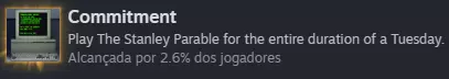 这个成就非常简单,你只需要让游戏关闭10年,然后再重新打开就能获得成就啦。当然,有个快速获取这个成就的作弊方法,只需把电脑时间调到10年后再打开游戏。不过那样就没意思了,哈哈。Commitment