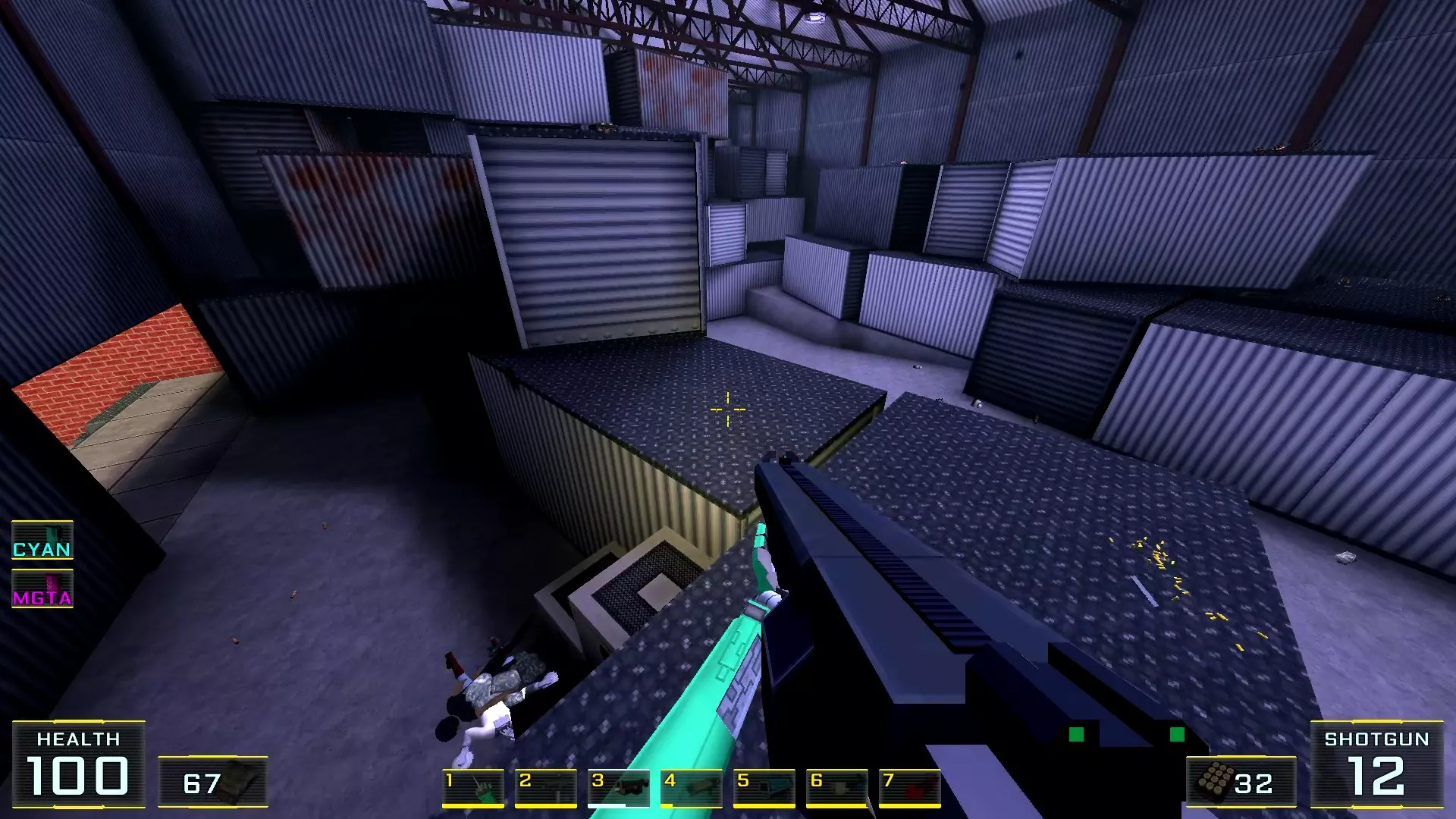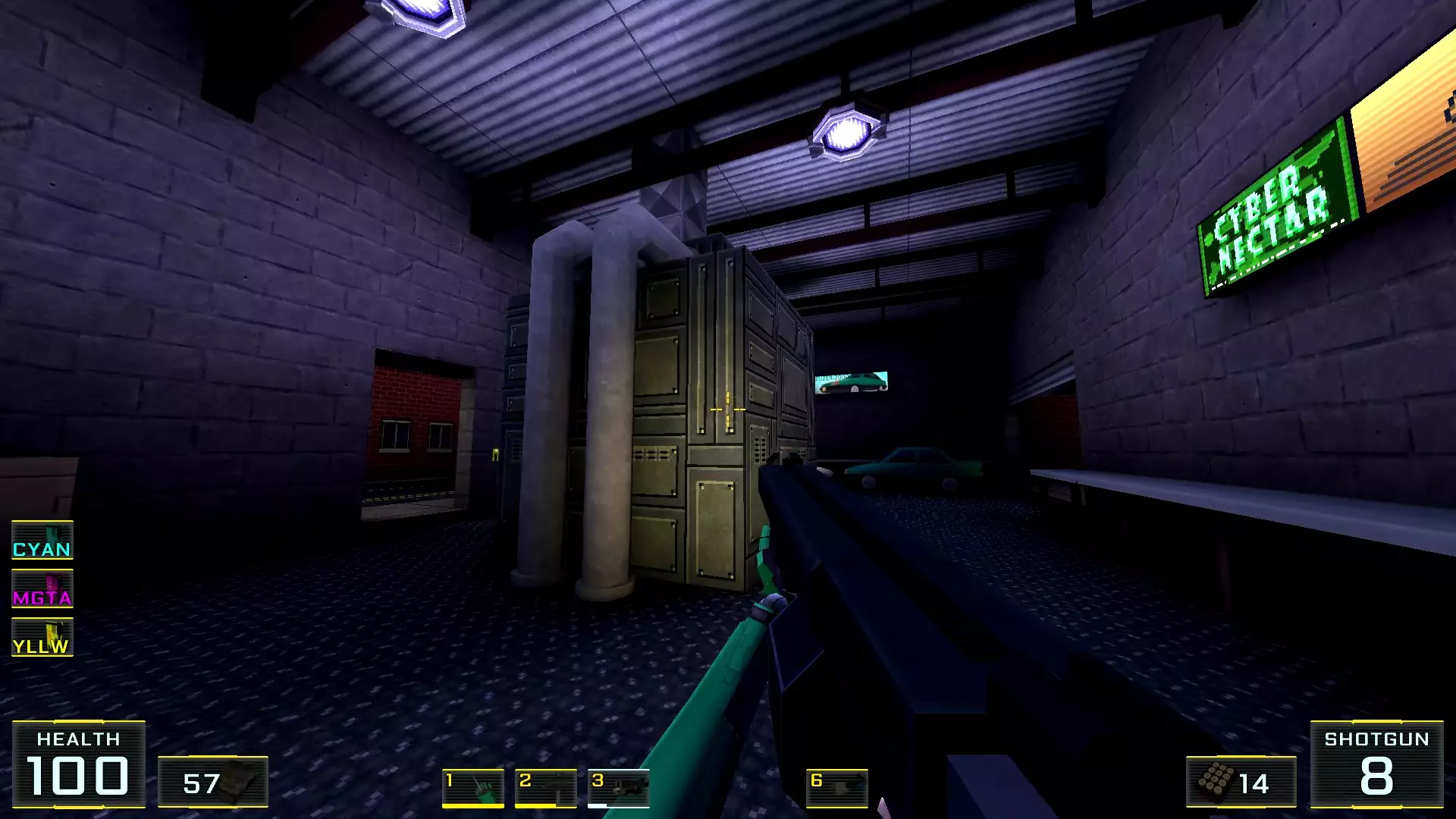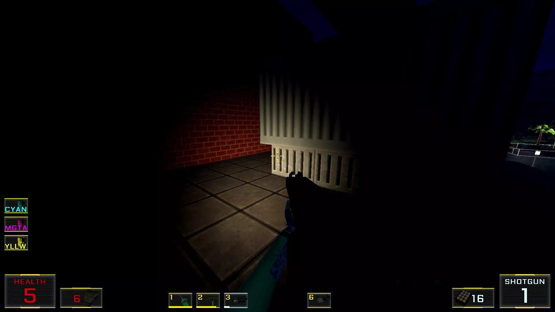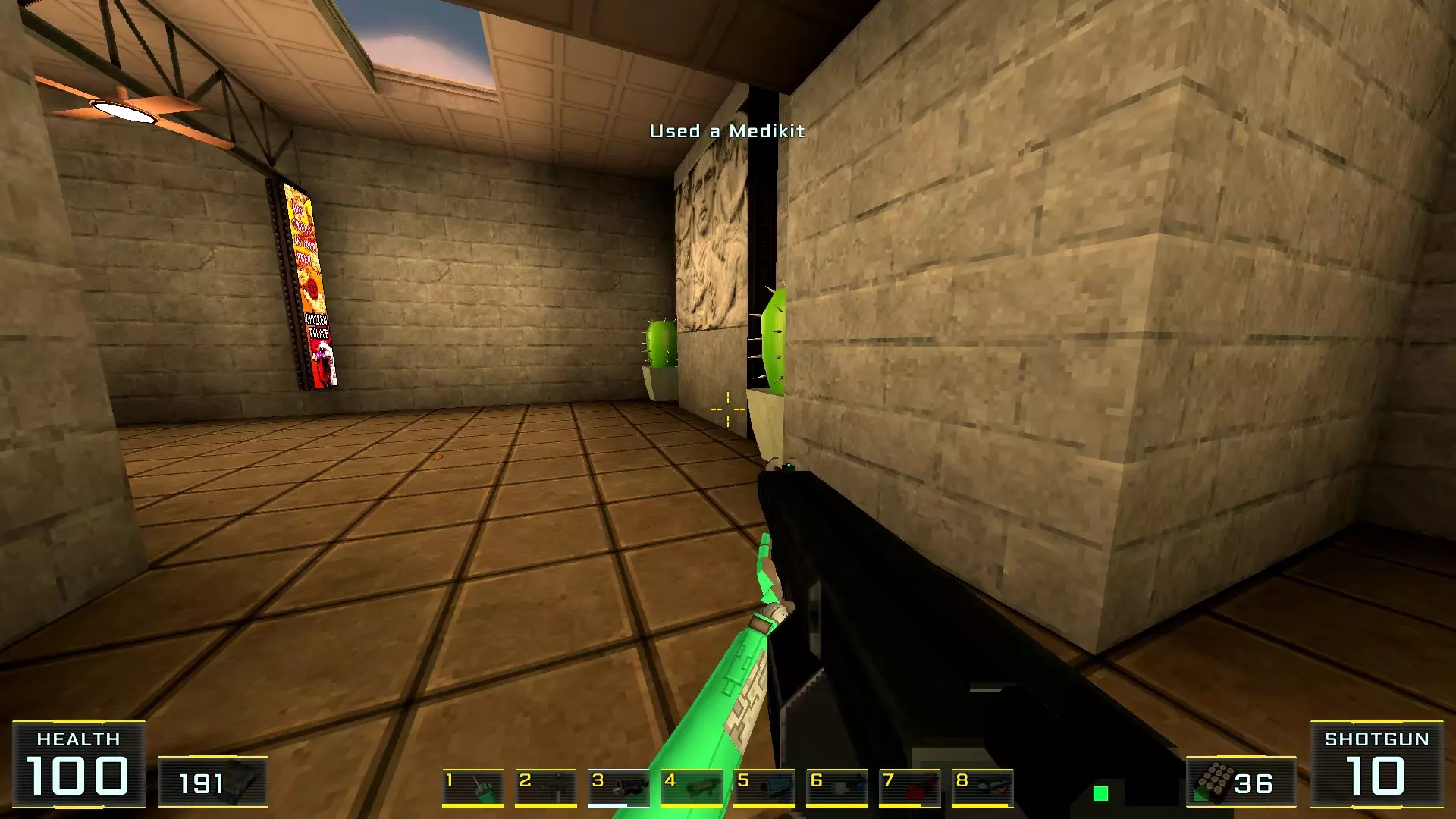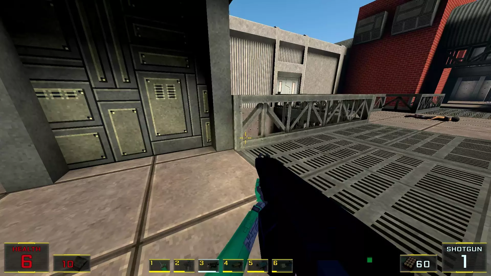 在墙边你可以探身拾取一把霰弹枪和几发子弹,以及几块装甲板
