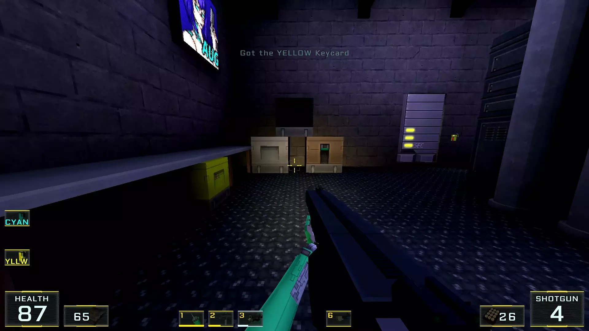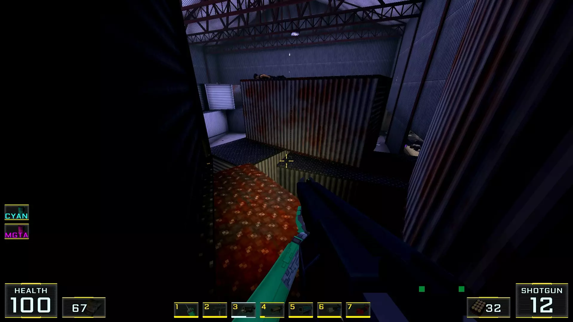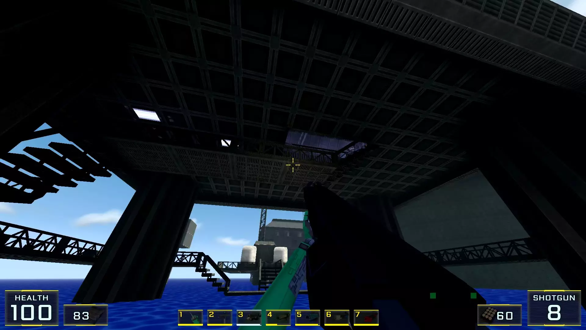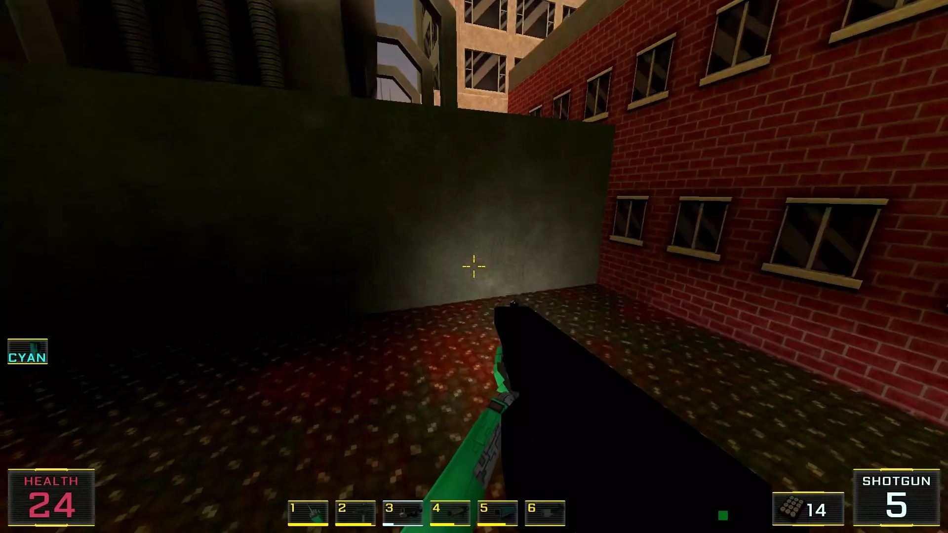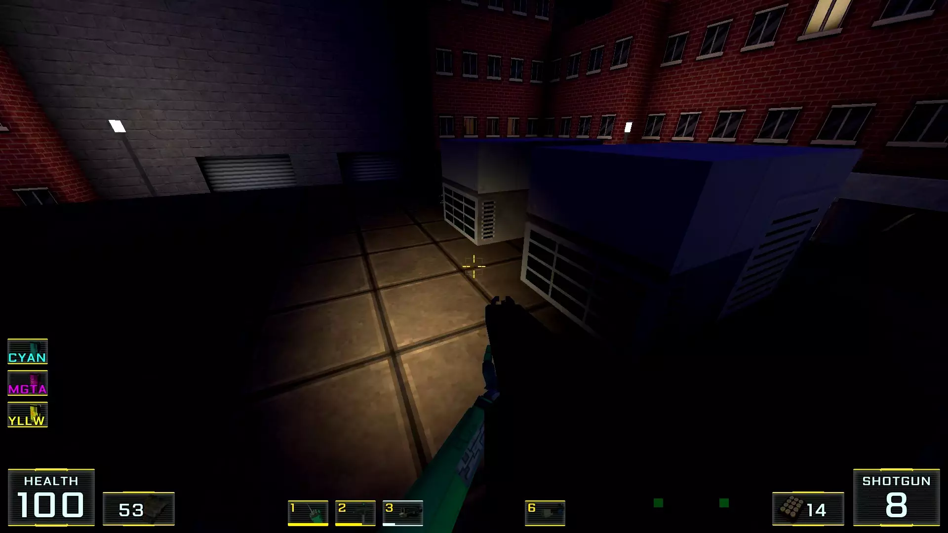 在墙边你可以探身拾取一把霰弹枪和几发子弹,以及几块装甲板