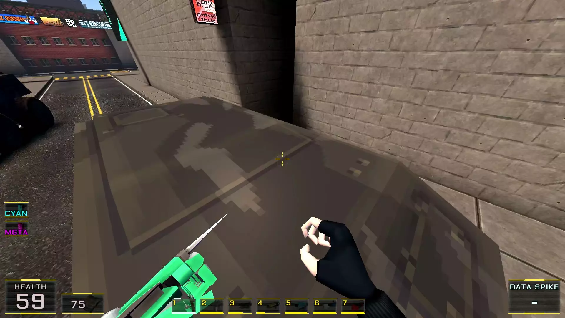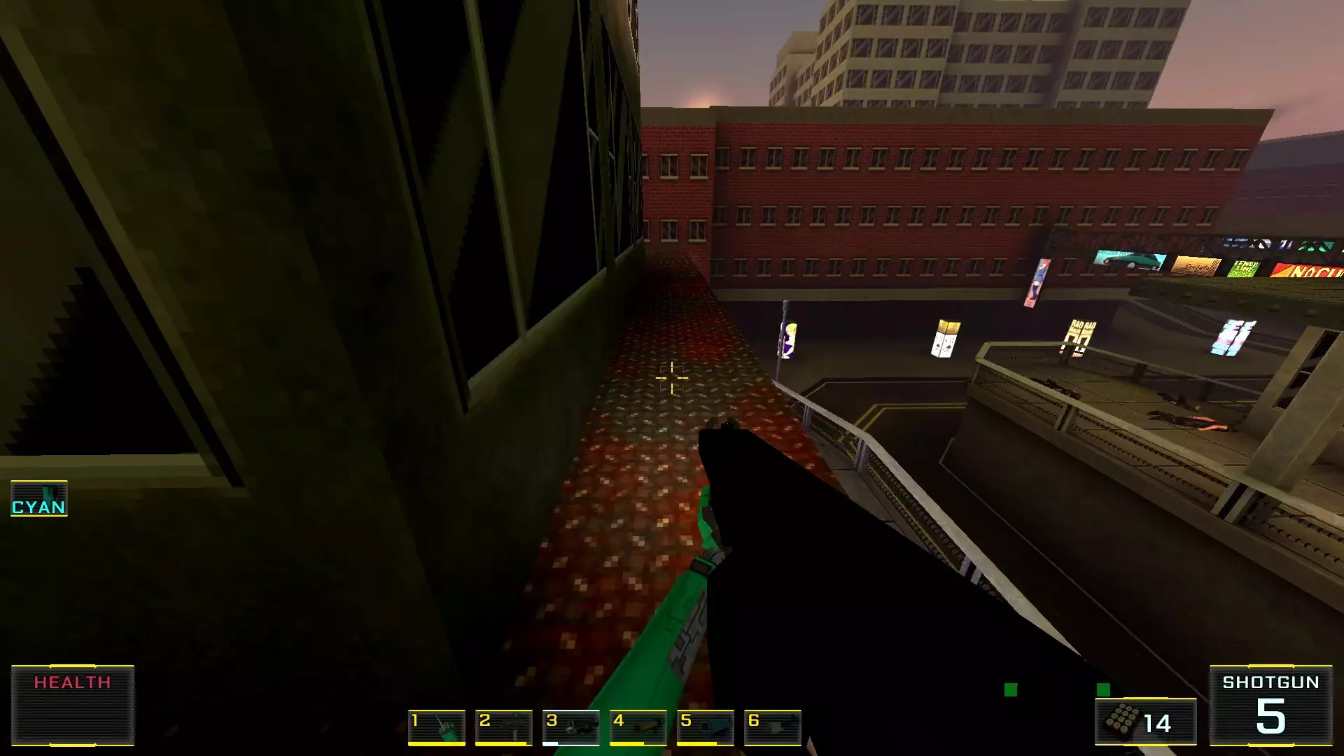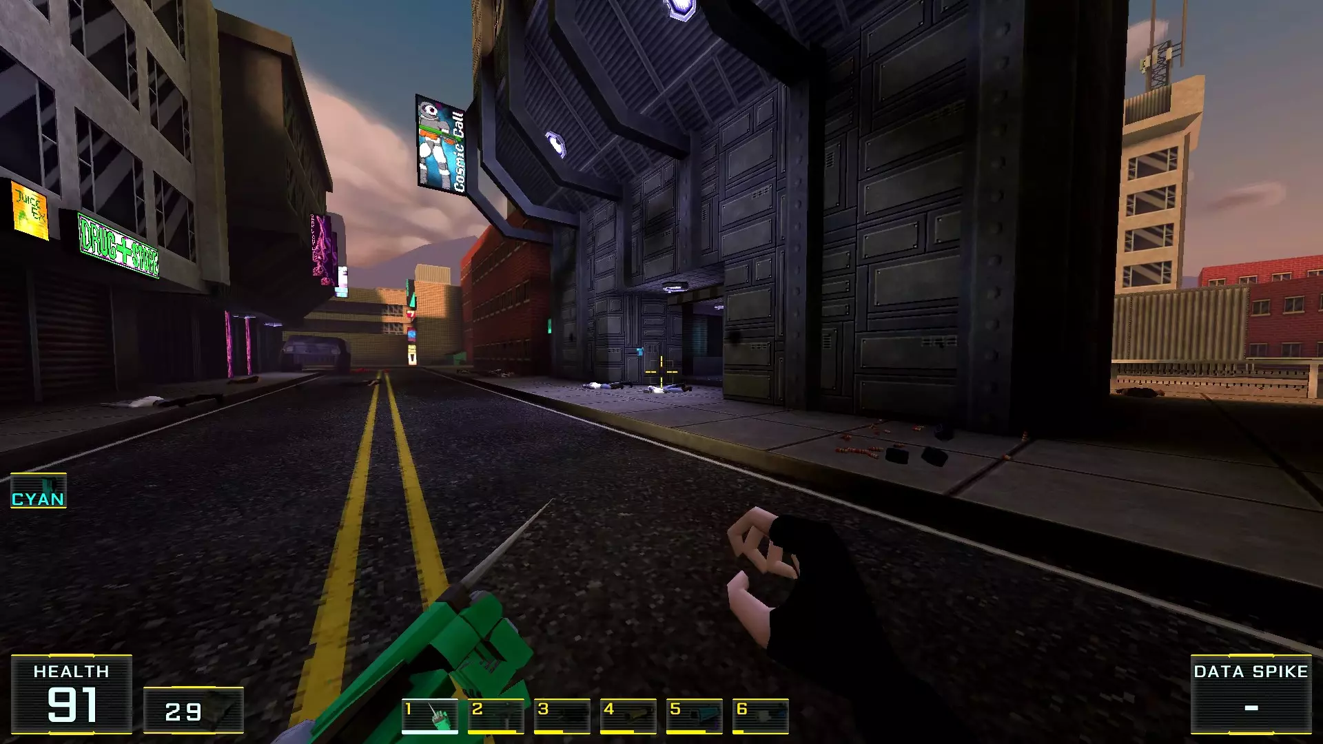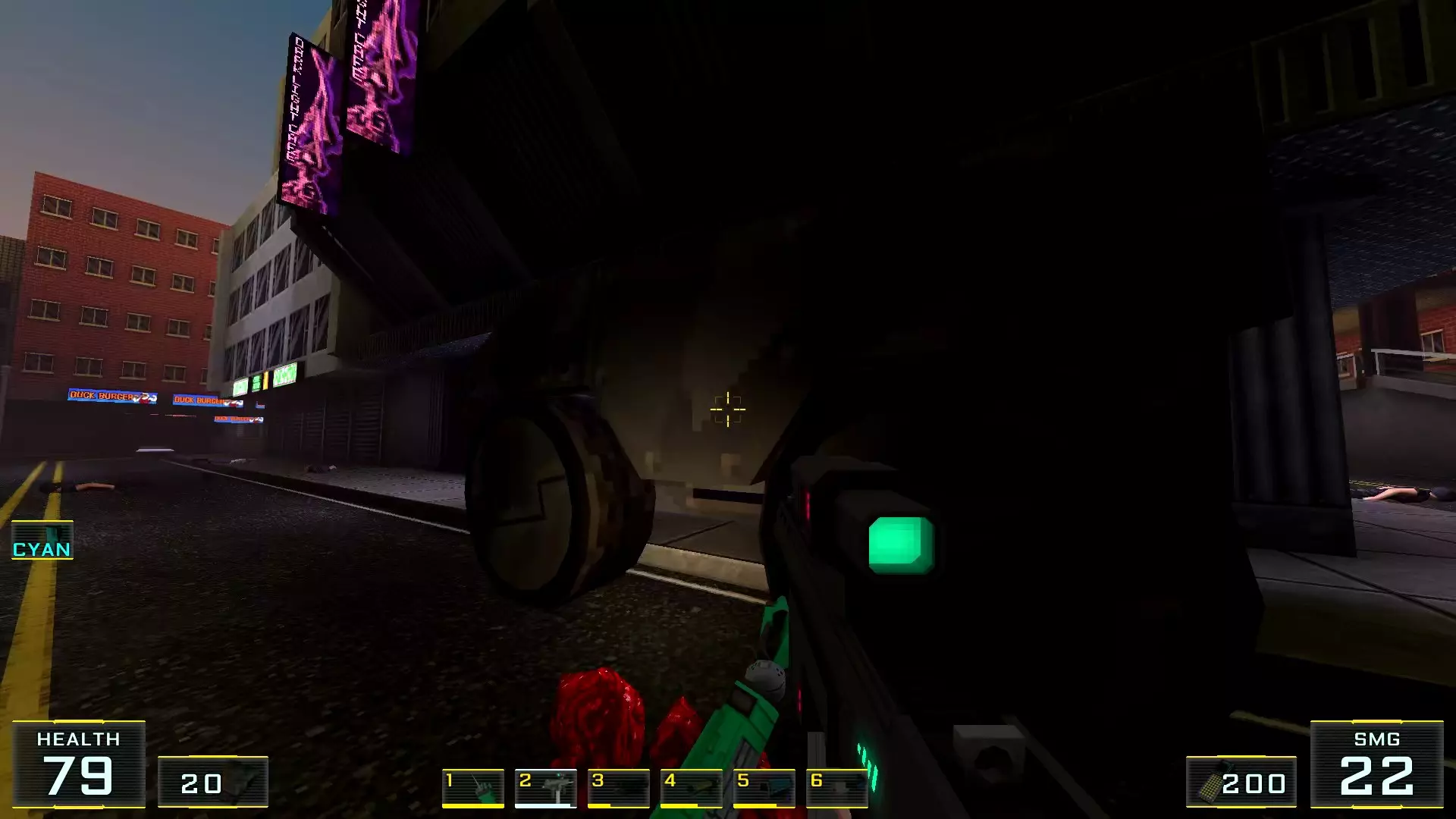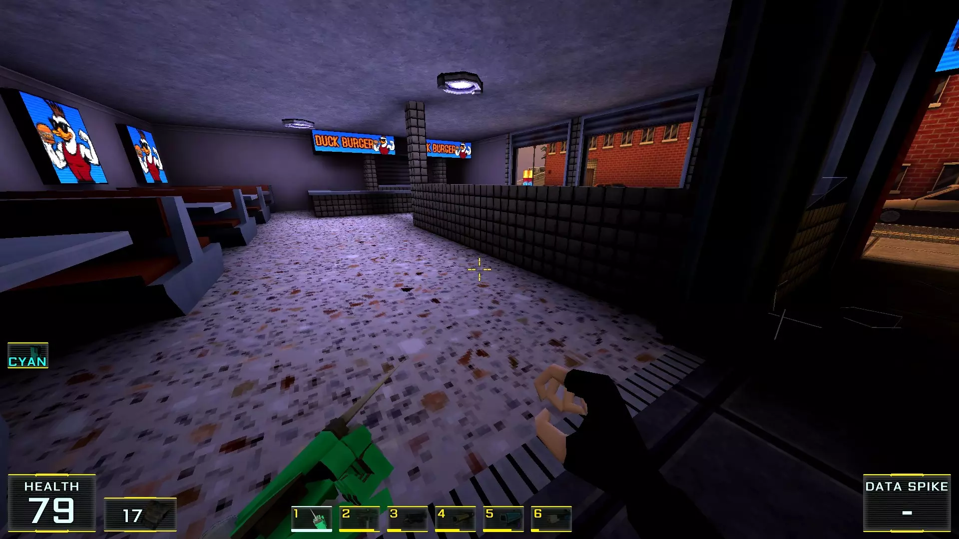 如果让我按质量给关卡排名的话,这个关卡会是倒数第二:它的宽阔街道和数量大幅增加的机械人实在太压抑了!说真的,如果不是所有敌人都能隔着整张地图看到主角,有时还能把武器稍微穿过碰撞体积直接穿墙射击的话,在这里体验会好得多!我甚至觉得在海滩上战斗会比在这些除了几处亮点外都枯燥单调的城市环境里好得多……不过算了,我的愿望除了我自己没人会帮我实现:看到过开发者的评论说游戏支持模组,但为此得折腾一番《上古卷轴3:晨风》的模组制作技术…… 回到机甲,我对付它们的建议是——找到火箭筒。是的,它就在关卡中间(有拉杆的塔里),但这相对来说是最简单的路径,你需要至少消灭一个携带等离子武器的“重装兵”,才能顺利拿到继续前进所需的钥匙卡,不管是在银行还是酒店里!而且,不用火箭筒也能过去,但这种情况下就得好好动动脑筋了。以下是我用过的三个技巧:1.1. 从无法转动的驾驶舱后方接近,并用刀子刺向背部。 2. 小心地在远处用自动武器进行点射(不用吝惜子弹)。 3. 引诱敌人到死胡同,然后从背后绕袭,操作基本与步骤2相同。 好了,现在从抱怨转向秘密本身! 秘密1:小吃店中的隐藏房间 1. 直接前往【野鸭汉堡】小吃店。