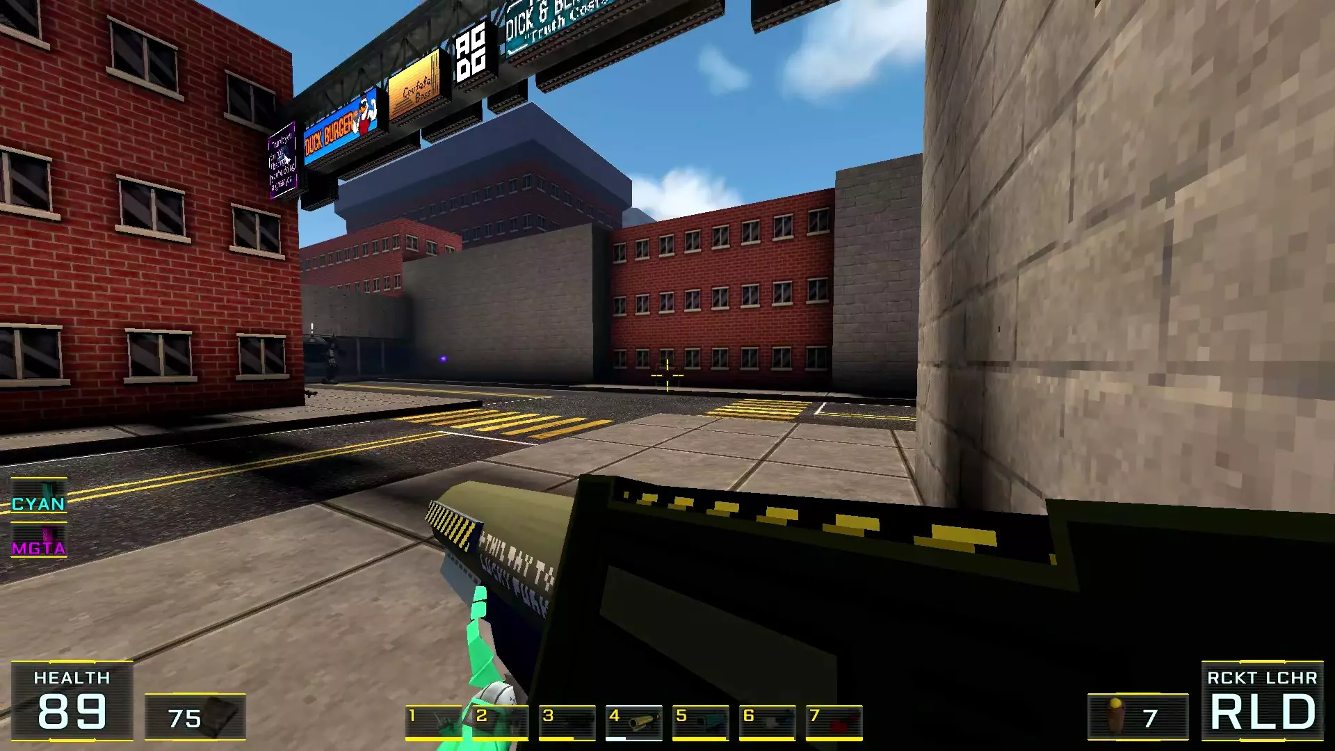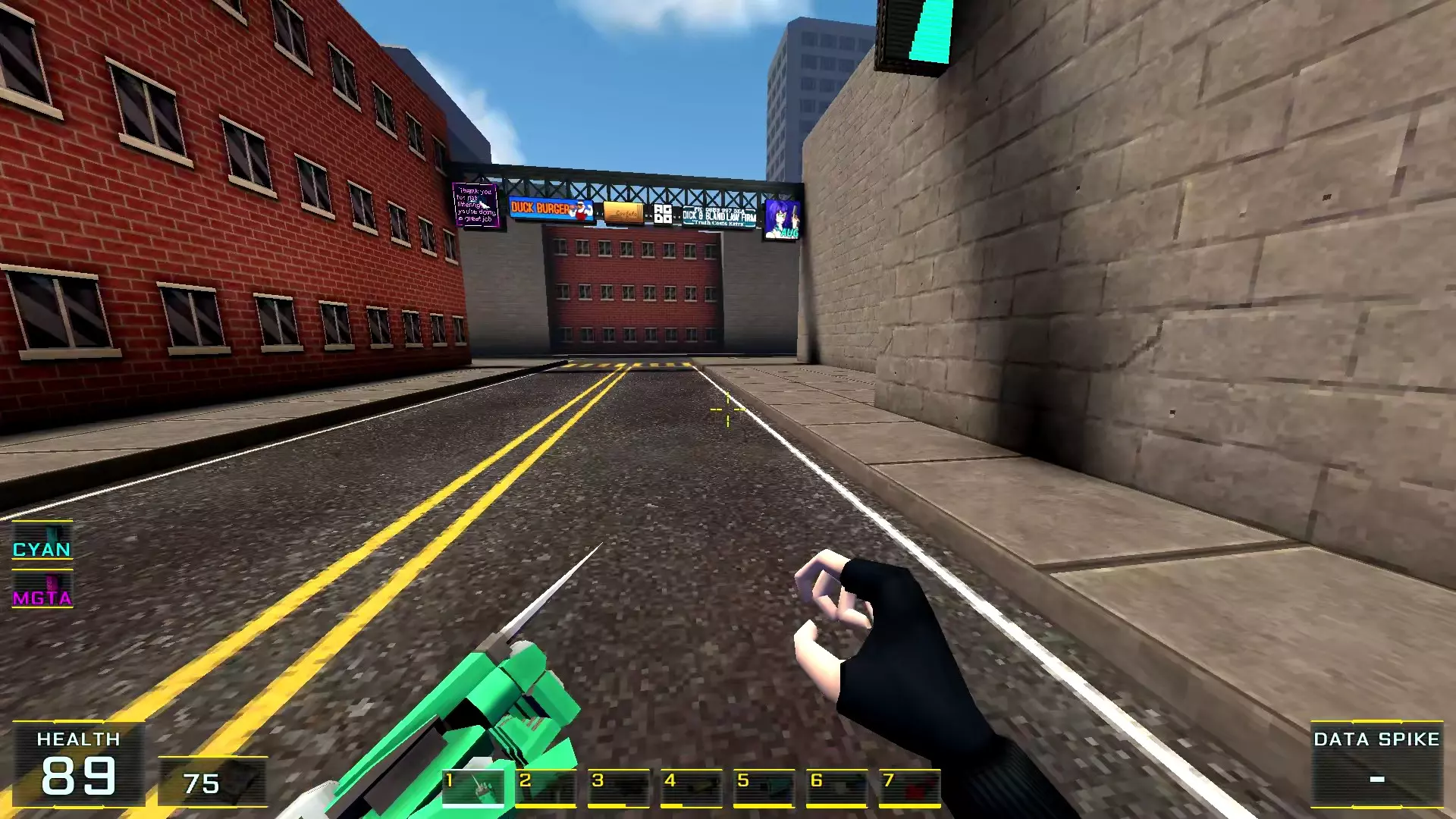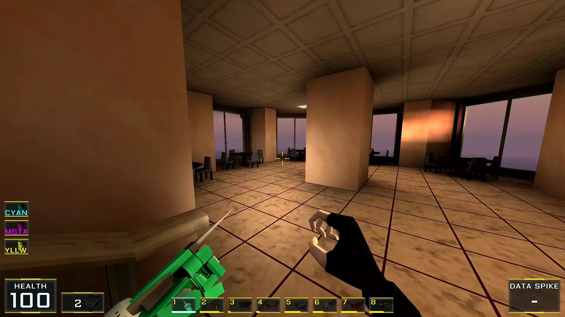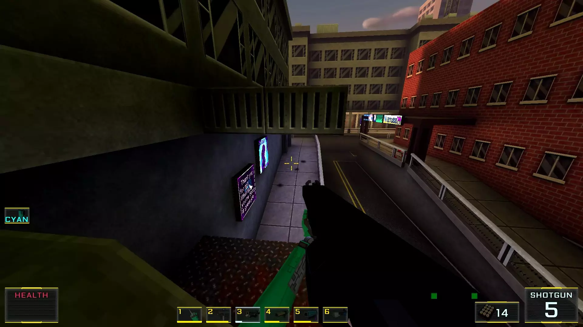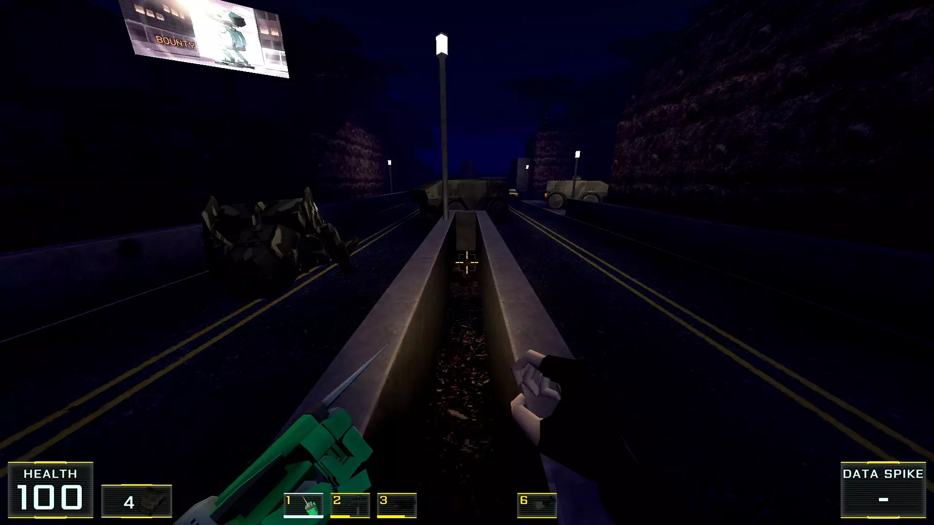如果让我按质量给关卡排名的话,这个关卡会是倒数第二:它的宽阔街道和数量大幅增加的机械人实在太压抑了!说真的,如果不是所有敌人都能隔着整张地图看到主角,有时还能把武器稍微穿过碰撞体积直接穿墙射击的话,在这里体验会好得多!我甚至觉得在海滩上战斗会比在这些除了几处亮点外都枯燥单调的城市环境里好得多……不过算了,我的愿望除了我自己没人会帮我实现:看到过开发者的评论说游戏支持模组,但为此得折腾一番《上古卷轴3:晨风》的模组制作技术…… 回到机甲,我对付它们的建议是——找到火箭筒。是的,它就在关卡中间(有拉杆的塔里),但这相对来说是最简单的路径,你需要至少消灭一个携带等离子武器的“重装兵”,才能顺利拿到继续前进所需的钥匙卡,不管是在银行还是酒店里!而且,不用火箭筒也能过去,但这种情况下就得好好动动脑筋了。以下是我用过的三个技巧:1.1. 从无法转动的驾驶舱后方接近,并用刀子刺向背部。 2. 小心地在远处用自动武器进行点射(不用吝惜子弹)。 3. 引诱敌人到死胡同,然后从背后绕袭,操作基本与步骤2相同。 好了,现在从抱怨转向秘密本身! 秘密1:小吃店中的隐藏房间 1. 直接前往【野鸭汉堡】小吃店。