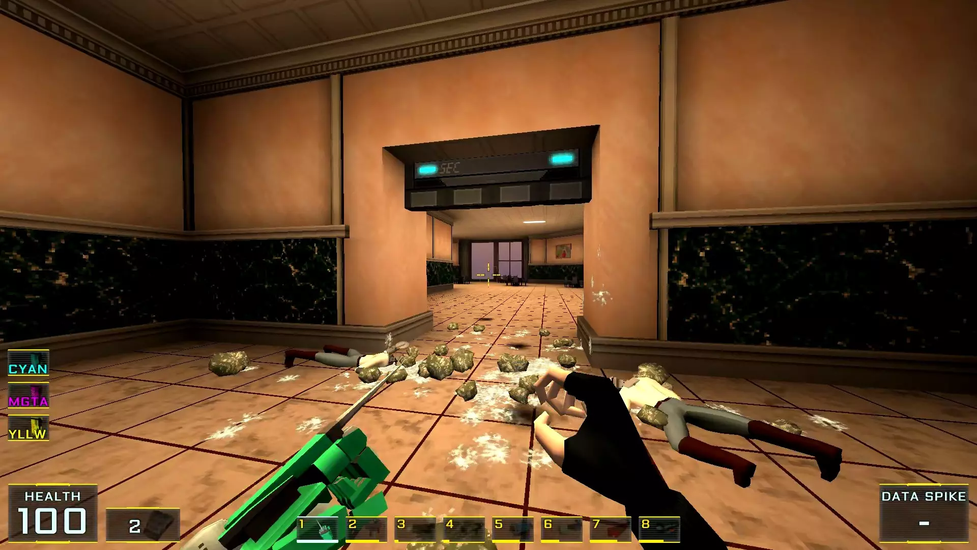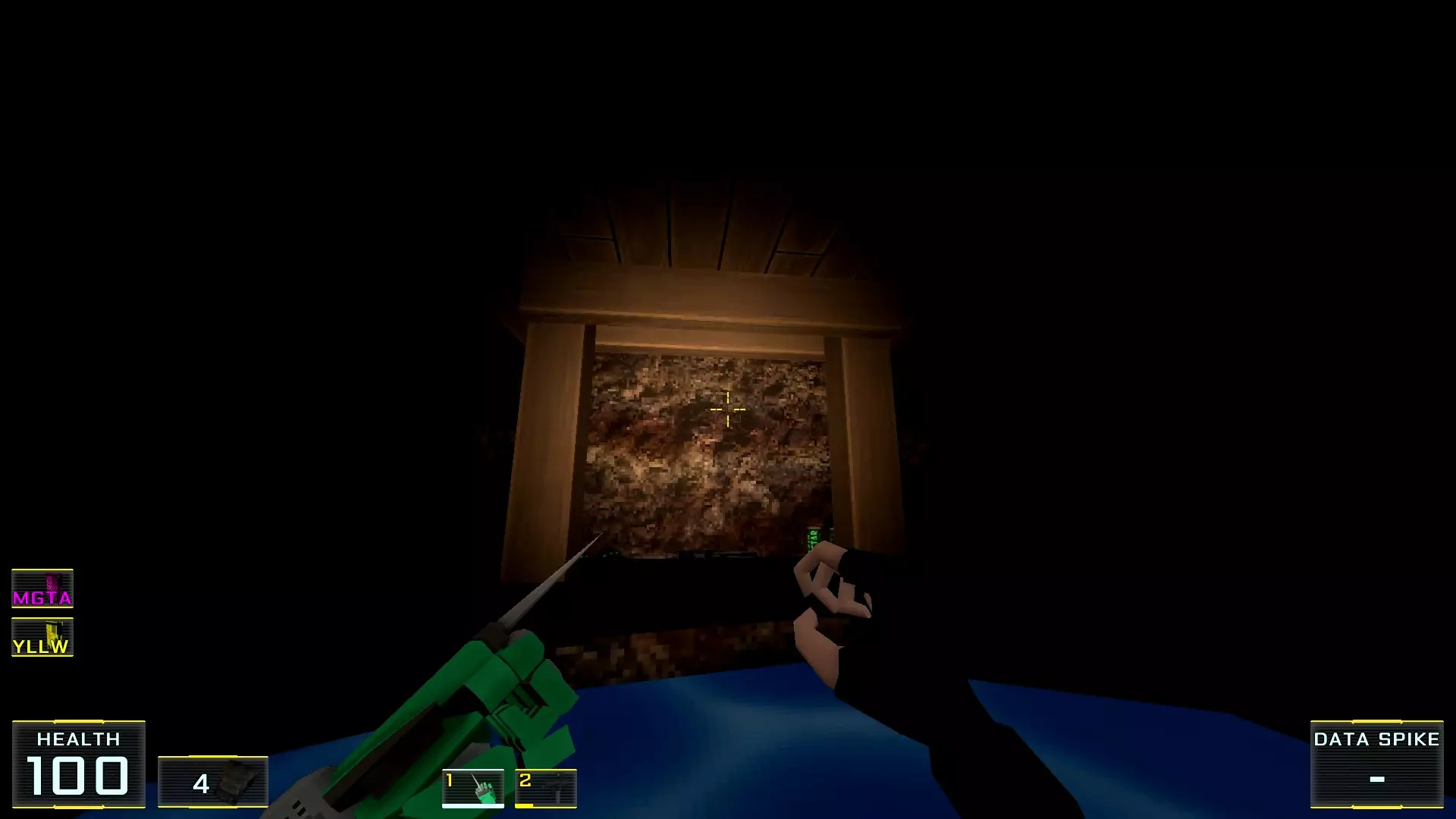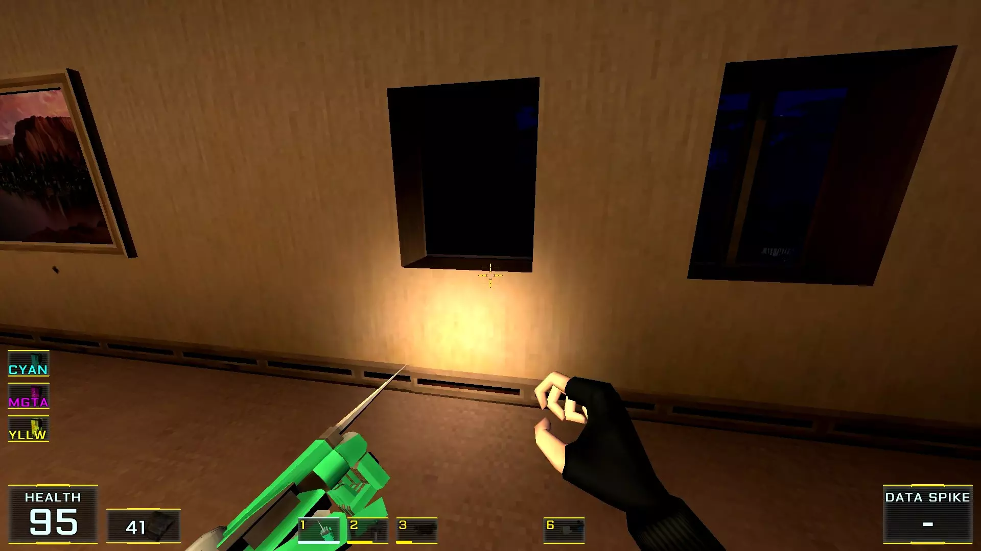 你以为菜单里的【新游戏】选项是最佳起点吗?那就错了! 既然决定要探索所有秘密,那么根据本指南作者的建议,最好选择【关卡选择】来开始——这是一个独立关卡,只能通过主菜单进入,别无他法! 这个关卡本身是一个带有两个房间的小型枢纽: 1. 第一个房间里有一个水池,池边的地面上会摆放着游戏中所有可用的武器。你可以捡起它们并对着墙壁射击:遗憾的是,这里没有显示伤害数值的假人……2. 而在第二个房间里,墙边排列着带有按钮的屏幕,用于进入其他剧情关卡。这些关卡可以直接进入,但不建议从名称不是“教程”的关卡开始。否则别忘了收集隔壁房间的所有武器,不然主角的武器库就只有一把牙刷了。这在简单难度下没什么,但在最高难度下……啧啧~ 现在让我们进入指南的主要部分! 秘密1. 壁画后的画作房间1. 当你出现在地图上时,转身并跳进壁画中。