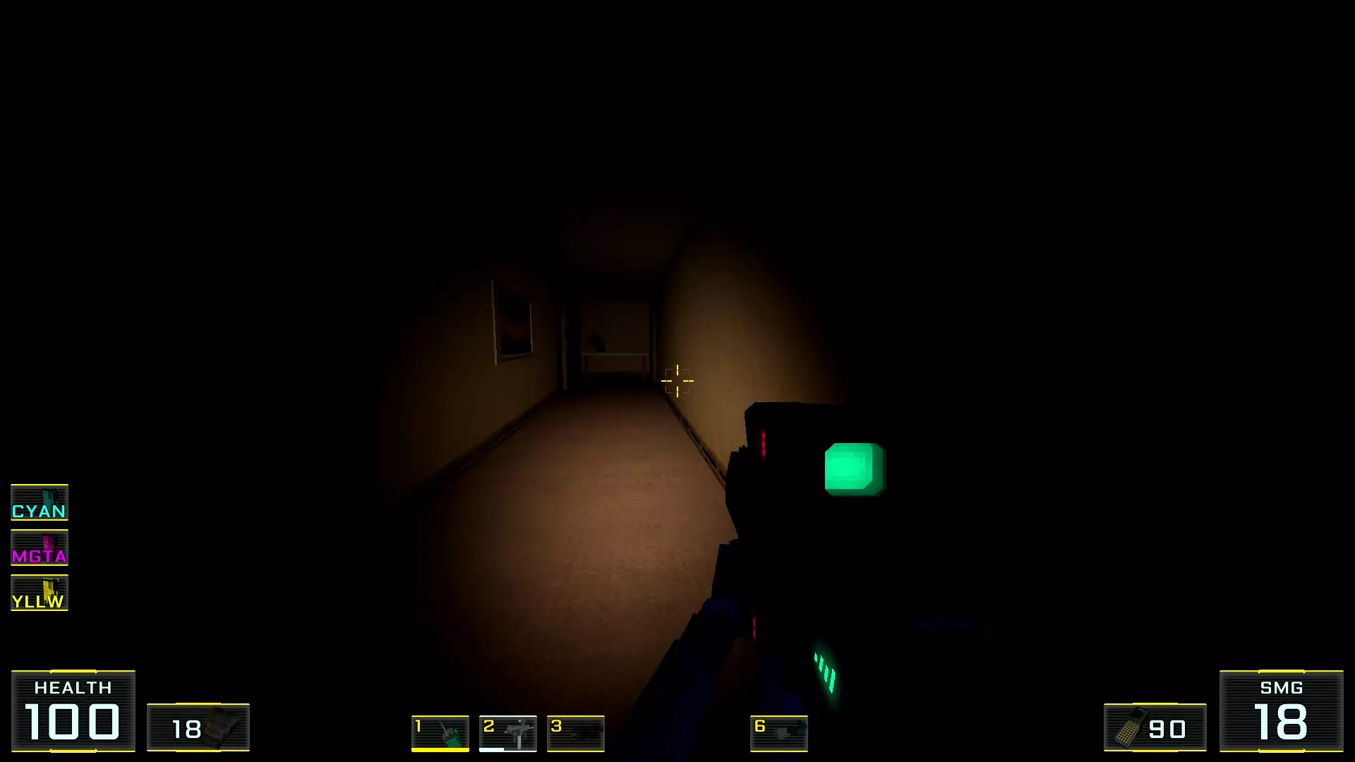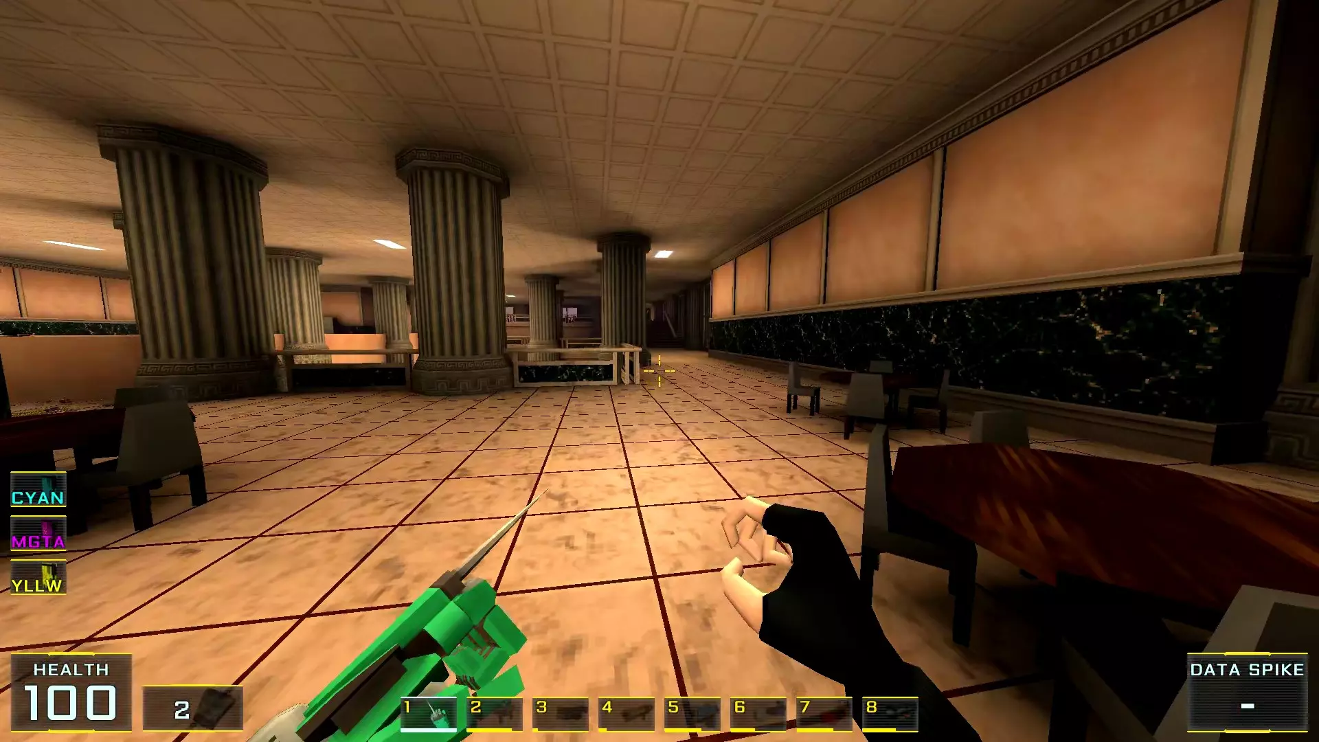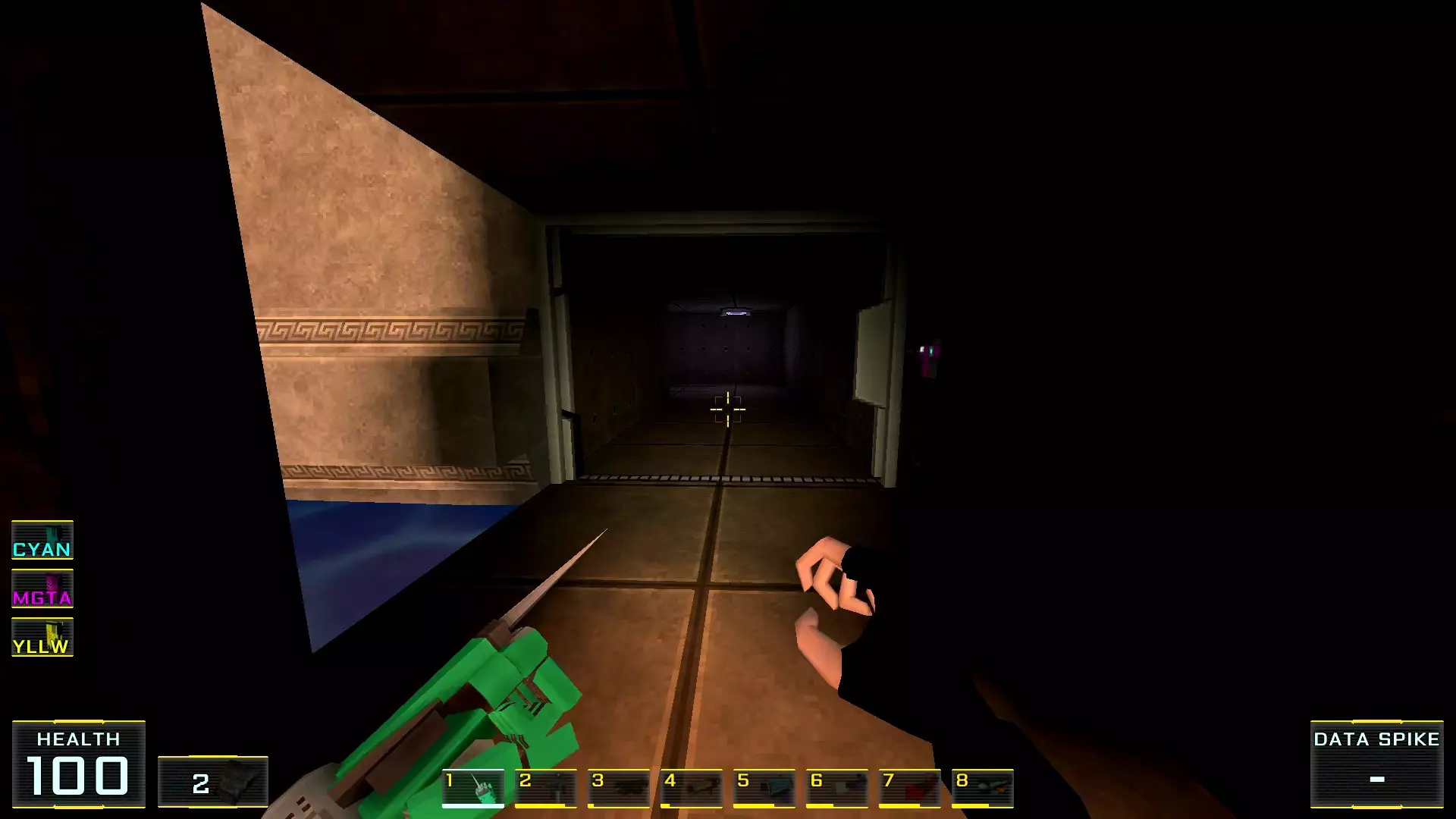 你以为菜单里的【新游戏】选项是最佳起点吗?那就错了! 既然决定要探索所有秘密,那么根据本指南作者的建议,最好选择【关卡选择】来开始——这是一个独立关卡,只能通过主菜单进入,别无他法! 这个关卡本身是一个带有两个房间的小型枢纽: 1. 第一个房间里有一个水池,池边的地面上会摆放着游戏中所有可用的武器。你可以捡起它们并对着墙壁射击:遗憾的是,这里没有显示伤害数值的假人……2. 而在第二个房间里,墙边排列着带有按钮的屏幕,用于进入其他剧情关卡。这些关卡可以直接进入,但不建议从名称不是“教程”的关卡开始。否则别忘了收集隔壁房间的所有武器,不然主角的武器库就只有一把牙刷了。这在简单难度下没什么,但在最高难度下……啧啧~ 现在让我们进入指南的主要部分! 秘密1. 壁画后的画作房间1. 当你出现在地图上时,转身并跳进壁画中。