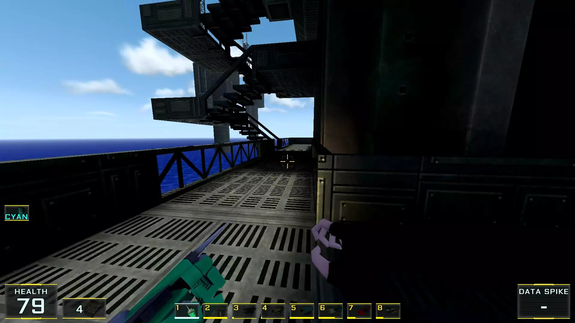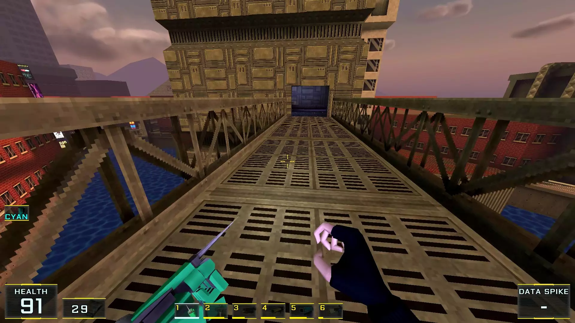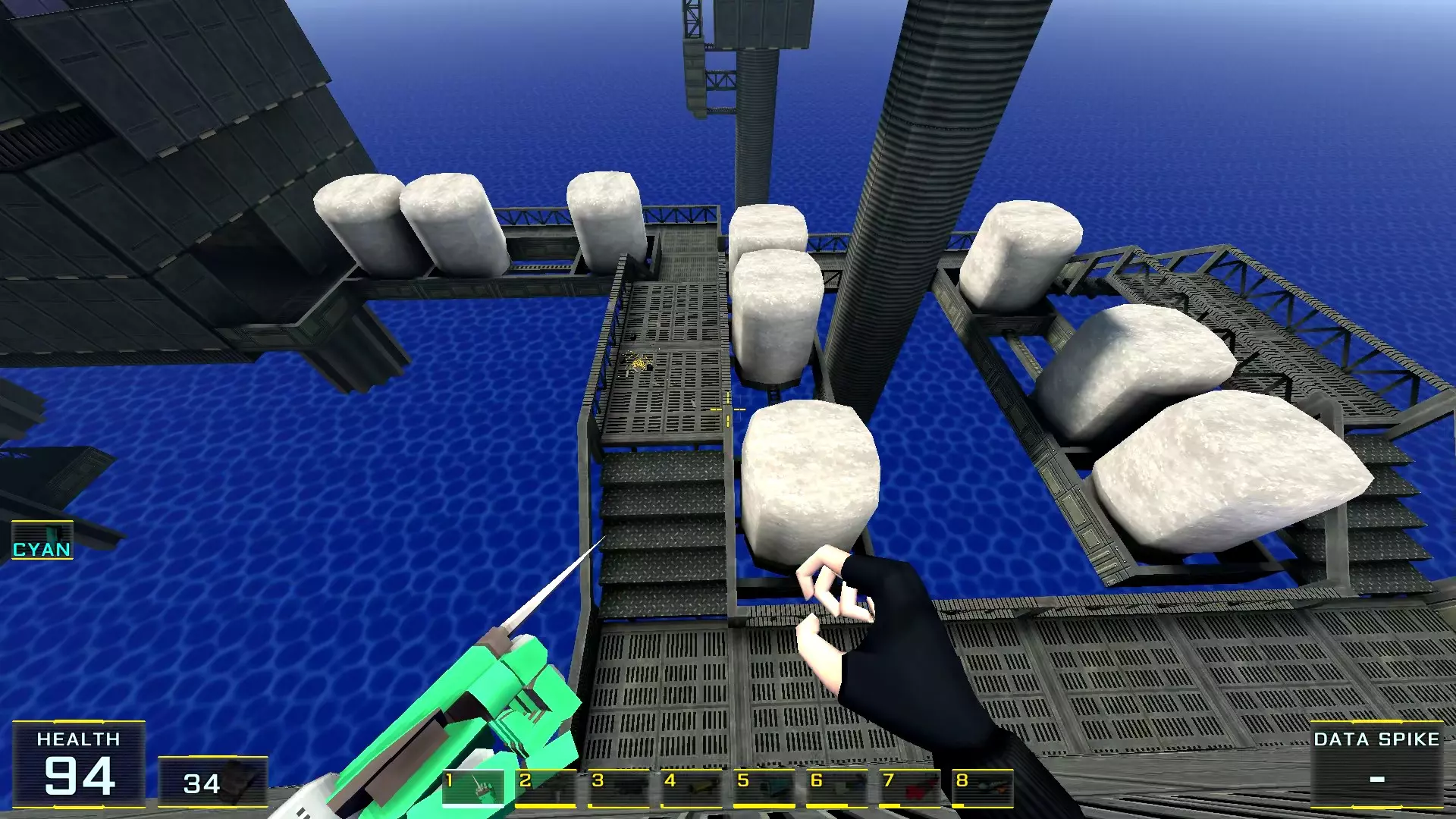 2. 前往带有控制杆的下一个塔台,该控制杆用于放下第二座桥。但是,当你走出房门后,要跳过栏杆,落到下方延伸的波纹管上。子弹会在正前方稍远的位置。