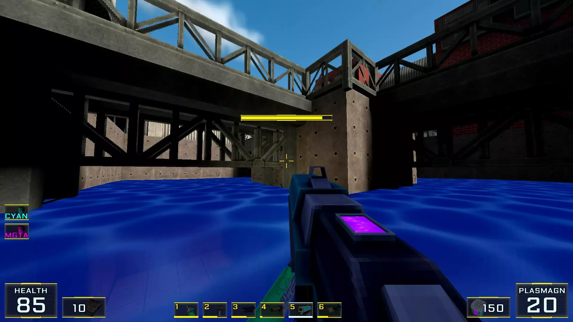 4. 在第一个岔路口向右转,几乎立刻就能看到这些桥梁的木制支柱。朝着截图中准星指示的方向前进。
