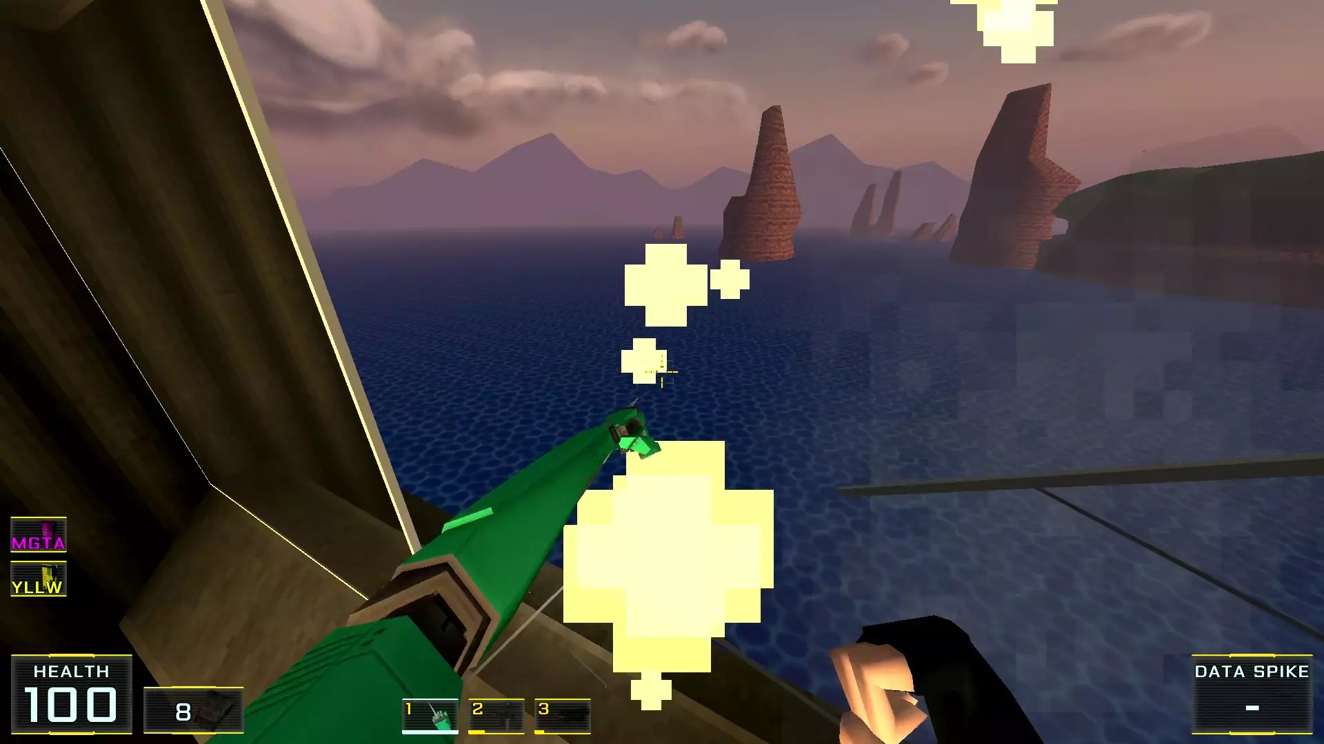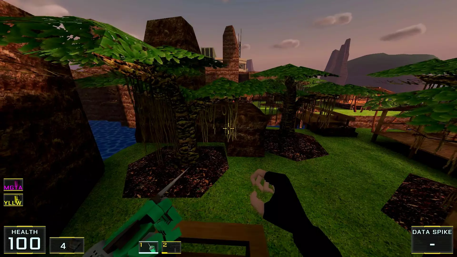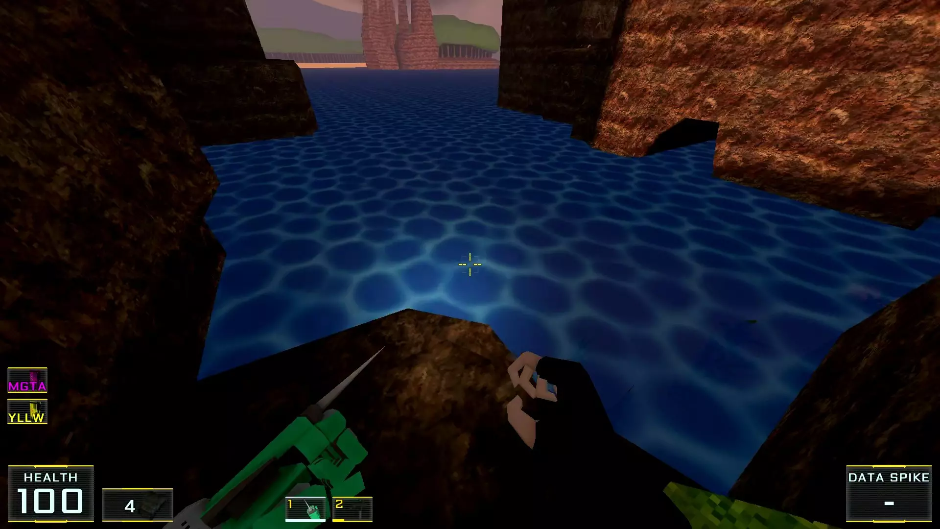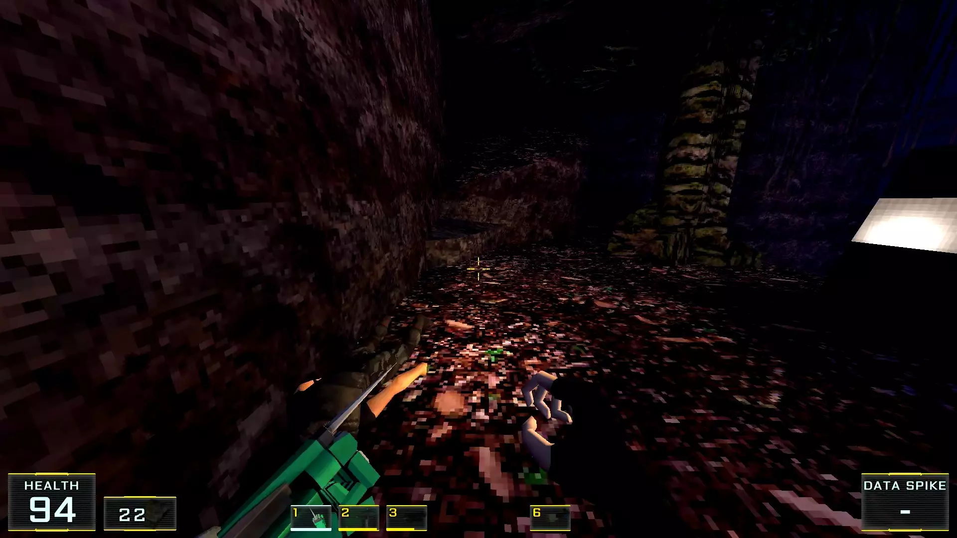 起初我打算将这个关卡命名为“翡翠海岸”:它实在太让我想起初代《索尼克大冒险》了。不过,由于任何指南的核心都在于清晰易懂,所以在此之前及之后,所有名称(若已知)要么尽可能准确翻译,要么保留英文原名。 总之,这个教学关卡明亮、线性、清晰,空间适中,但……我还是花了大约半小时才找到两个秘密……而且它们也不是藏得多巧妙,反而似乎是在相当明显的地方!好在找到它们的奖励非常丰厚,简直没得说,所以我也没太为花掉的时间感到失望。 秘密1:桥底下洞穴里的霰弹枪。前往提示出现的位置。