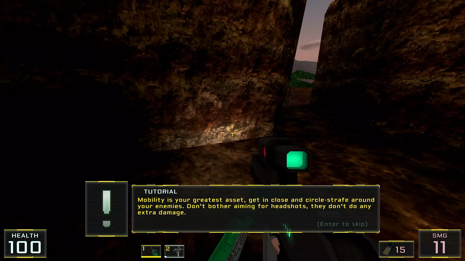 想听听笑话吗?我讨厌复古射击游戏里的秘密!我打心底里鄙视它们,原因有很多,其中一些就体现在这个关卡上: 1. 游戏本身不认为是秘密的秘密,这里就有两个。 2. 通往秘密的路径需要复杂和/或致命的跑酷。 而且因为第二个原因,我在这儿花了两三个小时,甚至更久,对此感到非常不满。尤其是那个“奖励”(参见秘密5和6)!说到关卡本身,设计还算不错,但几乎在一开始就出现配备等离子炮的机甲,再加上单位面积内敌人数量的增加,还是可能会让人感到有些棘手。建议利用敌方人工智能的简单特性,精准射击最危险的目标。 对了,在《Ctesiphon》中存在友军伤害机制,也就是说敌人可能会互相攻击。同时,当友军受到伤害时,该友军会立即将攻击优先级切换到新目标身上,不再攻击英雄。在【Extra Hard】难度下通关时,必须利用这一点,否则你会失败! 实际上,如果你能在该关卡中触发整个区域的敌人,并让机甲承受攻击,那就算是付出了较小的代价并节省了大量弹药!不过,当然,更简单的方法是小心地用自动武器向这个移动的诅咒之物的任意位置单发射击(毕竟在这款游戏中,敌人根本没有弱点的概念)。 好了,抱怨完了,现在回到正题! 秘密1. 沟渠里的防弹衣 1. 关卡一开始,向右转,然后进入沟渠,这是另一个玩笑的地方。