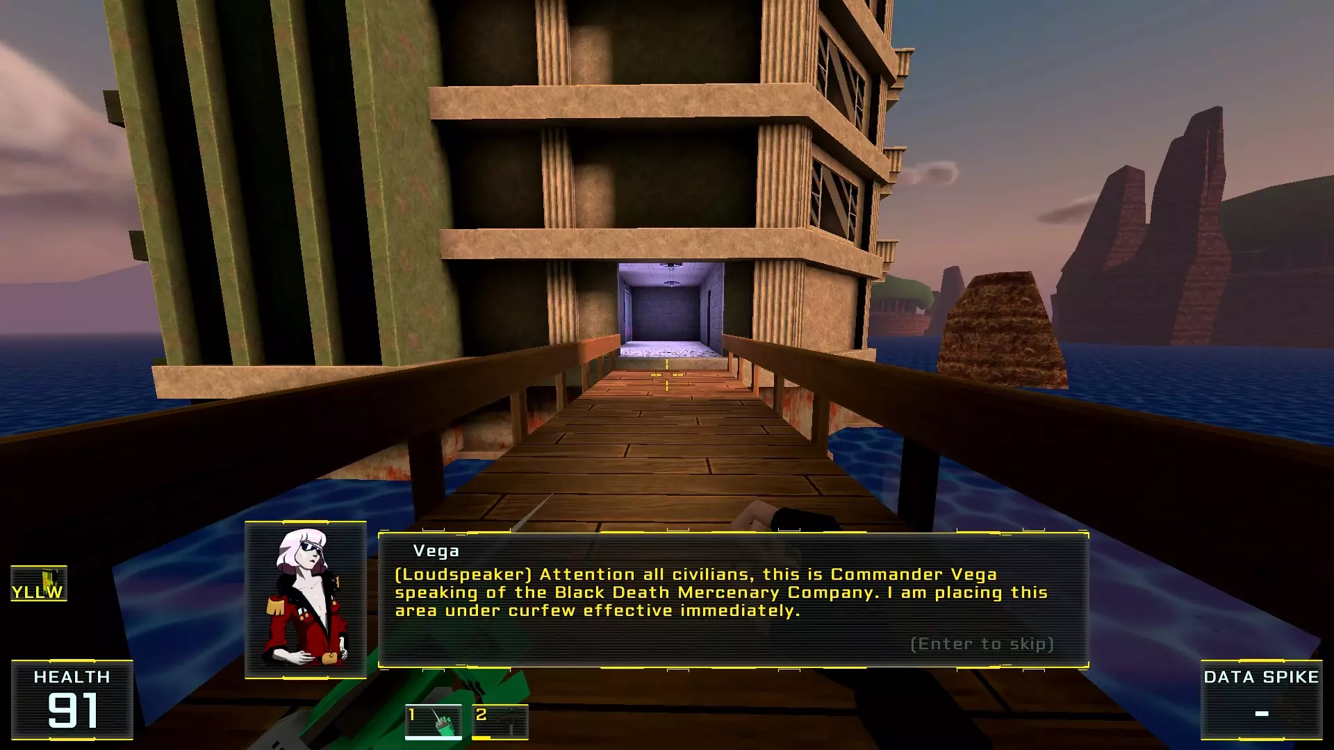 2. 沿着道路走到侧通道。进入通道内,一直走到尽头并拿起防弹背心!