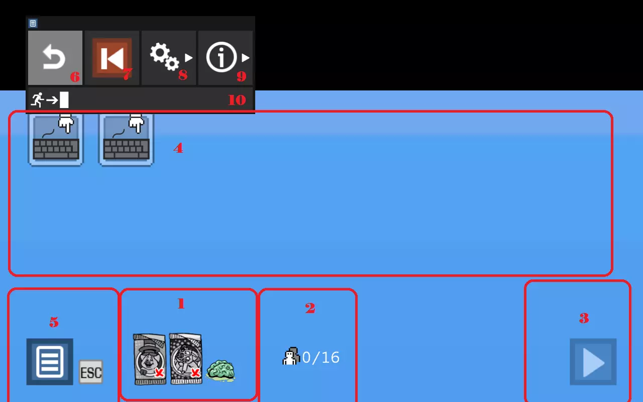 1. 显示所有已拥有和可购买的DLC套装。在此截图中可以看到,我已购买了【Zombie Pack】DLC。点击未拥有的DLC时,会打开其购买窗口。 2. 已占用按键(控制)的玩家数量。 3. 开始游戏。 4. 显示所有玩家及其设置的区域。 5. 选项菜单(可通过ESC键调出)- 打开包含6、7、8、9、10功能的窗口。 6.返回游戏 - 关闭选项。 7. 重启游戏(类似红白机)。 8. 声音和视频设置。 9. 开发者及游戏信息。 10. 退出游戏。 03. 玩家选择