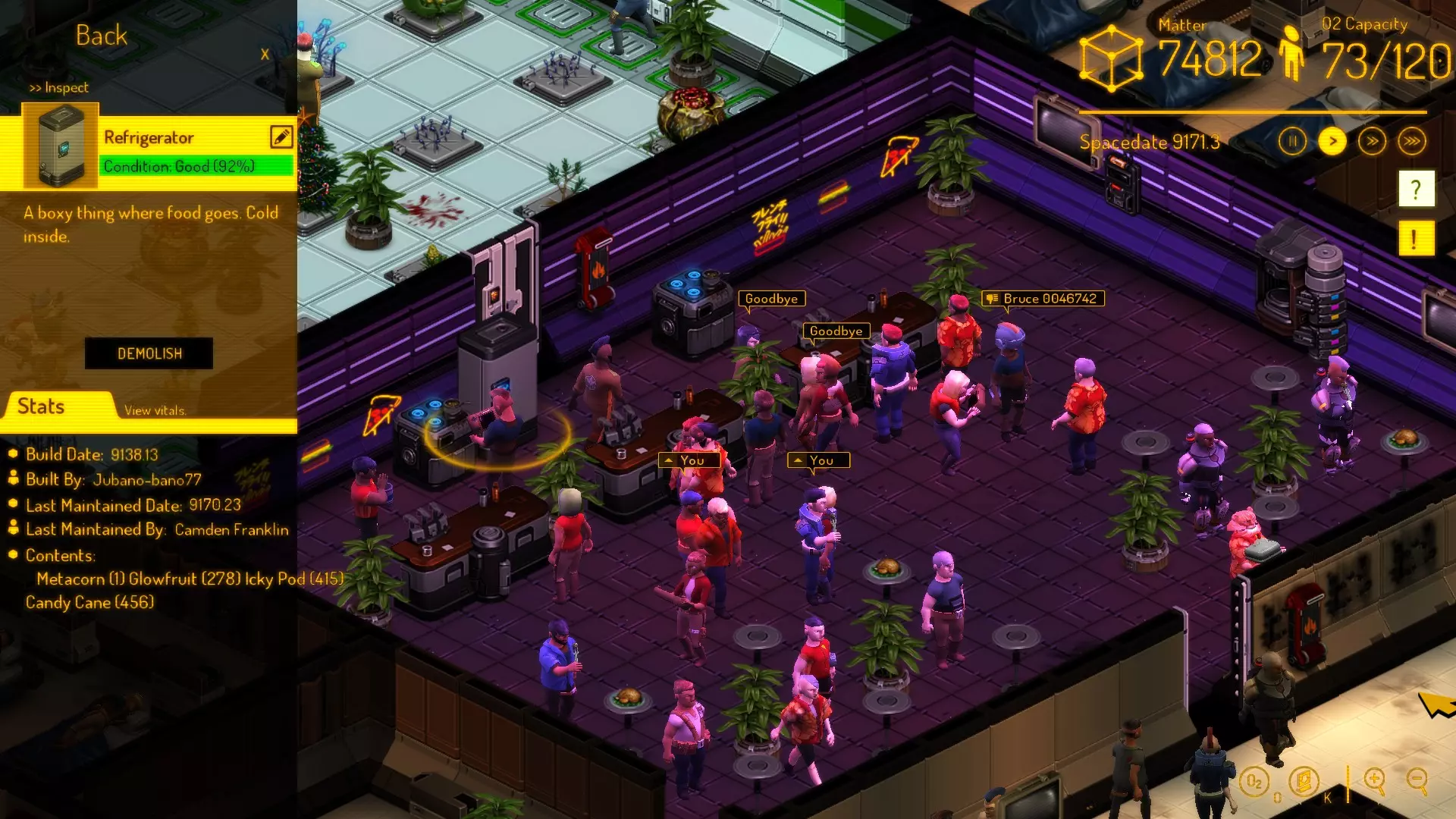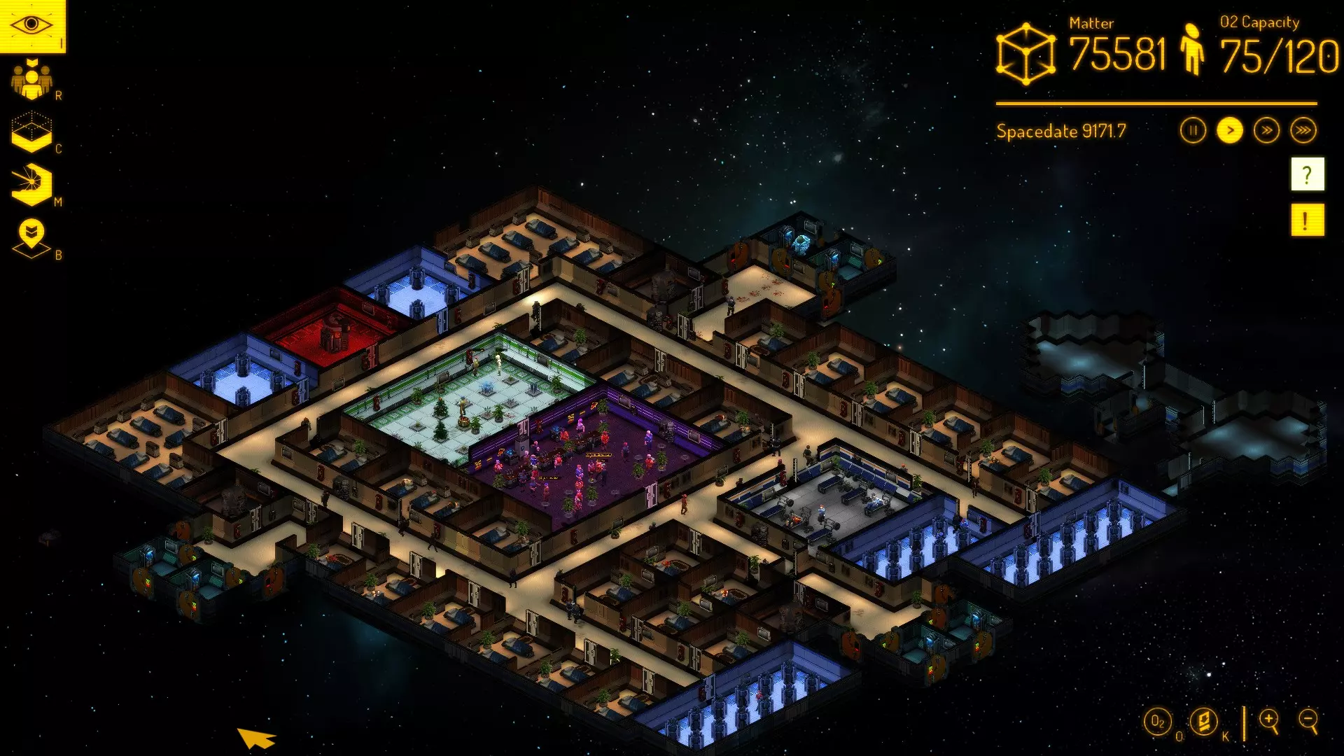 目前为止,最佳做法是建造带有【对接区域】的气闸室,该区域需有一扇通往精炼厂的门、一扇通往主走廊的门,以及两扇通往太空的门(若安保人员战斗失利,可打开这些门来消灭剩余的袭击者)。这样你就可以通过信标将安保人员派往这个对接舱,让所有袭击者都来挑战他们。安保人员会在那里等待袭击者并履行职责。 巡逻可以满足【职责需求】,但仅适用于那些本身就喜欢当安保人员的人。如果他们更喜欢其他工作,巡逻会让他们感到厌烦。要定期检查这一点。 酒保 要定期检查你最适合的员工是否保持心情愉快。如果他们感到无聊,可能是因为你的酒保太多或者桌子太少。也有可能你查看的那个人就是更喜欢园艺,你可以通过比较其他酒保来确认这一点。如果只有那一个人总是情绪低落,那他真的更喜欢花而不是和人打交道。 一般经验法则是,每个酒吧配一名酒保,每增加一张桌子再配一名酒保。在我的基地里,大约100人只需要不超过12张桌子,因为他们都有事情要做。 植物学家 “健谈”似乎是个不错的特质,因为显然植物需要有人和它们说话。 不过你只需要一定数量的植物学家,所以要留意他们是否感到无聊。 通常我每2株植物配一名植物学家,植物的数量则根据需要来定。你可以通过查看冰箱来判断需要多少植物。不同的餐食需要不同的植物,而你喜爱的餐食可能大相径庭。要时刻检查冰箱里是否备齐了所有植物种类。如果没有,就建造更多种植设施。 情绪管理 观察你的居民的情绪相对简单,但一开始会比较耗时。 有些事件会让角色感到悲伤,却并非因为他不喜欢自己的工作,比如其他角色死亡或者吃到自己不喜欢的食物。如果你在日志中发现与此相关的记录,暂时不必在意情绪问题,稍后再查看。 一旦发现某个角色每天都变得更不开心,你可能就得重新考虑他的工作安排了。 基地的某些方面也能让角色感到开心。我成功让我的居民长时间不需要工作也不会感到沮丧,只需观察他们几个小时就能做到。一个角色会花很多时间在空间站的走廊里闲逛,然后花些时间睡觉,再花些时间吃饭——可能是在你的酒吧里,接着是锻炼时间,最后才是工作时间。所以实际上,最有回报的是拥有装饰整洁的走廊!平民会漫无目的地在走廊里游荡,安保人员会用它们来巡逻,其他人则只是用它们去往另一个工作场所……每个人都能从中受益。