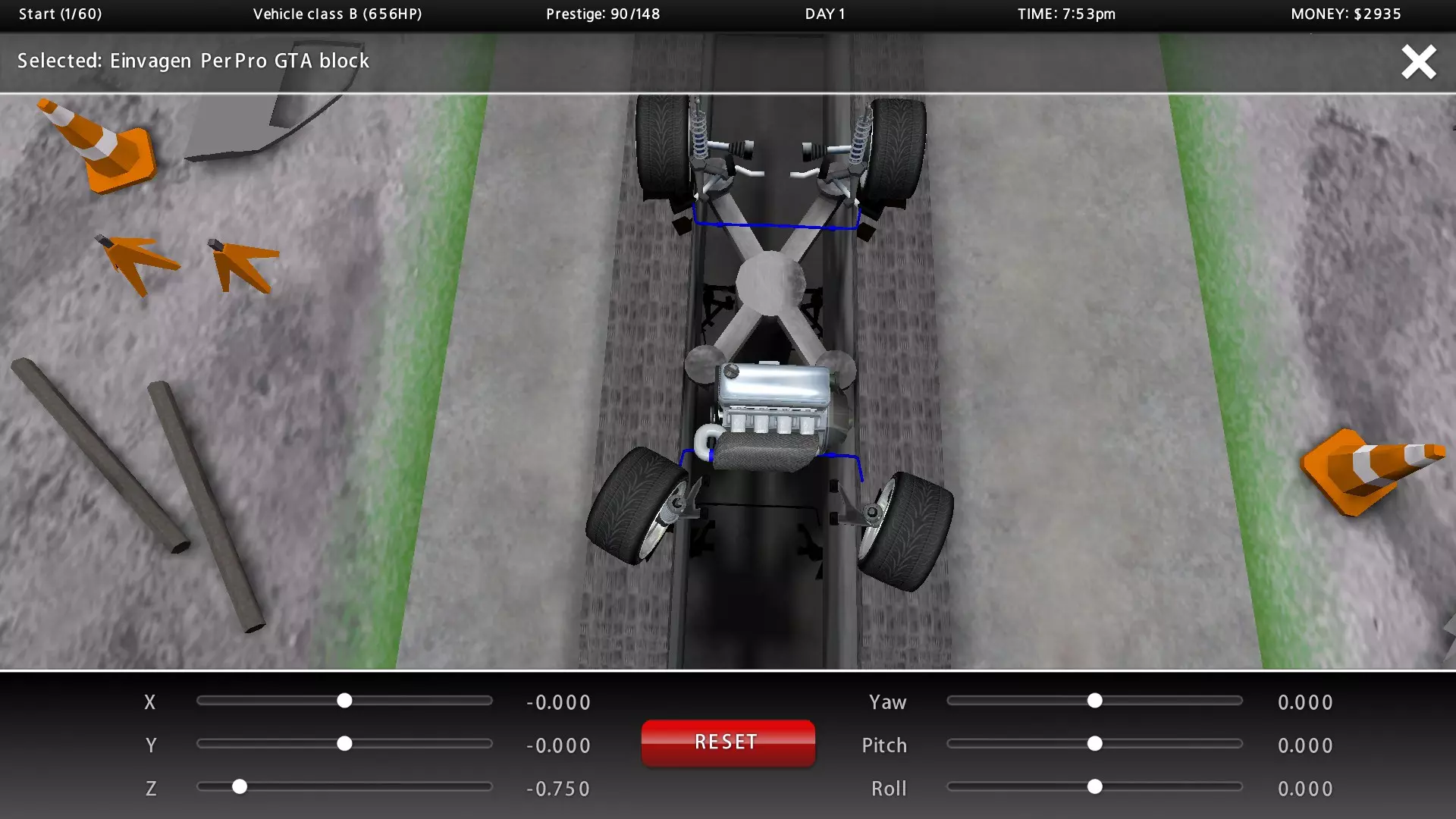 进气凸轮轴:-13.0度 排气凸轮轴:-14.0度 怠速:1000转/分钟 红线转速:7000转/分钟 不要超过7250转/分钟,因为活塞只能承受7250转/分钟,超过这个转速活塞会迅速开始损坏 现在,开发者增加了零件移动功能,所以我们将把发动机向后移动以获得更好的重量转移,从而提升抓地力